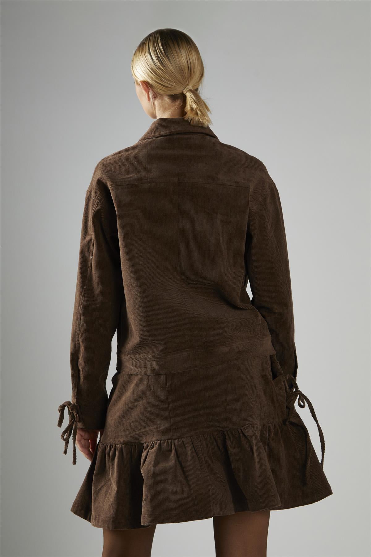 Glamorous Women's Brown-Cord Tie-Front Jacket. Find a new sense of ease with this autumn jacket, carefully crafted from classic cord fabric that brings a gentle, tactile feel to your everyday routine. The adjustable tie detail lets you play with your silhouette—wrap it up for a cozy, gathered look or leave it open for soft structure over layers. Patch pockets add an extra touch of simplicity and make space for stashing small essentials, while the button front provides a straightforward finish that keeps things unfussy and practical. This jacket feels right at home tossed over a favourite tee or a light sweater, adapting as you go from slow mornings to brisk afternoon walks. Relaxed and down-to-earth, it shapes your outfit with a friendly spirit and thoughtful touches at every turn.