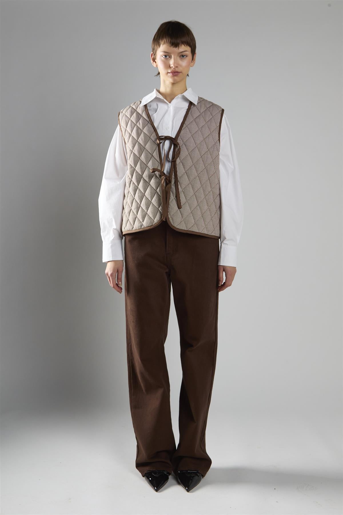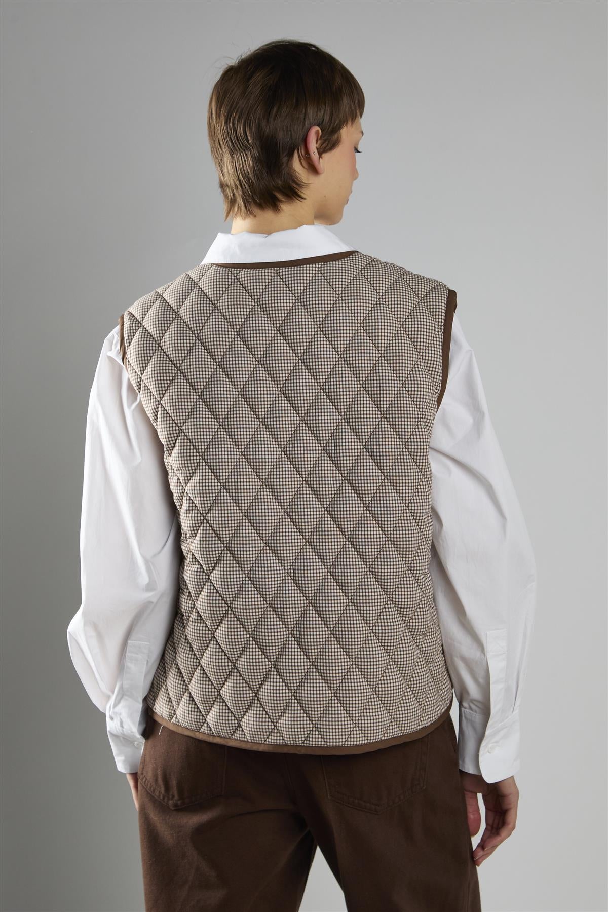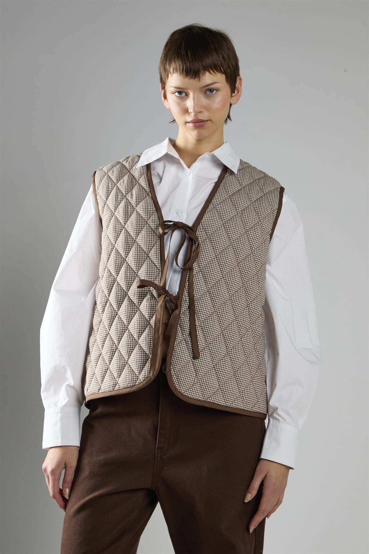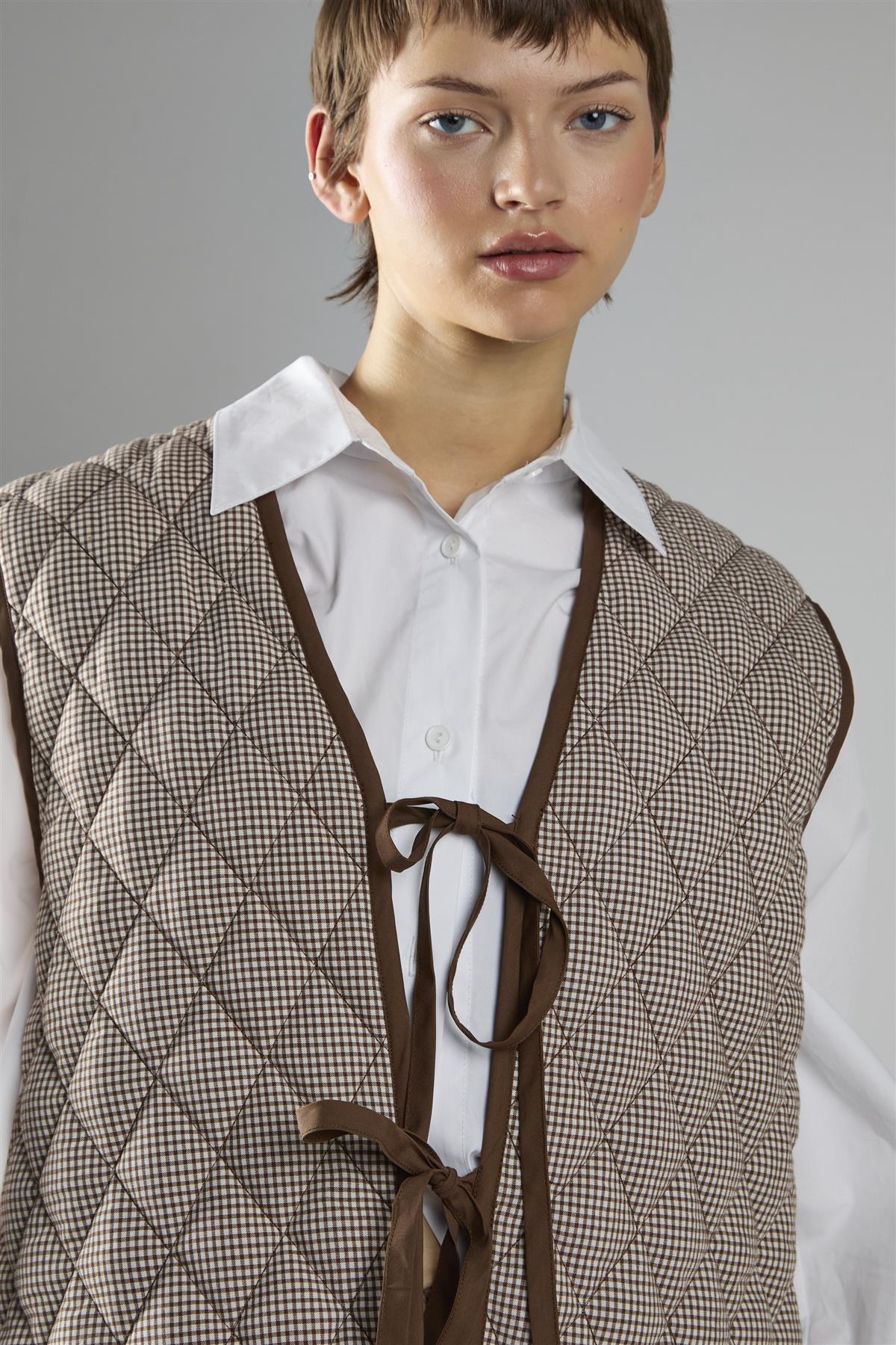 Glamorous Women's Brown Cream Gingham Quilted Front Tie Gilet. Add instant character to your outfit with the Quilted Front Tie Gilet, a piece that blends comfort with statement style. The sleeveless cut makes it easy to layer, while the quilted design gives it a soft structure that feels both practical and stylish. A simple front tie closure keeps the look relaxed and versatile, complemented by a flattering V-neck that frames your layers beautifully. Finished with a bold gingham print, it’s the perfect way to bring texture and detail to your look. Pair with a long sleeve sweater and mini skirt for a playful, modern edge that’s easy to wear anywhere.