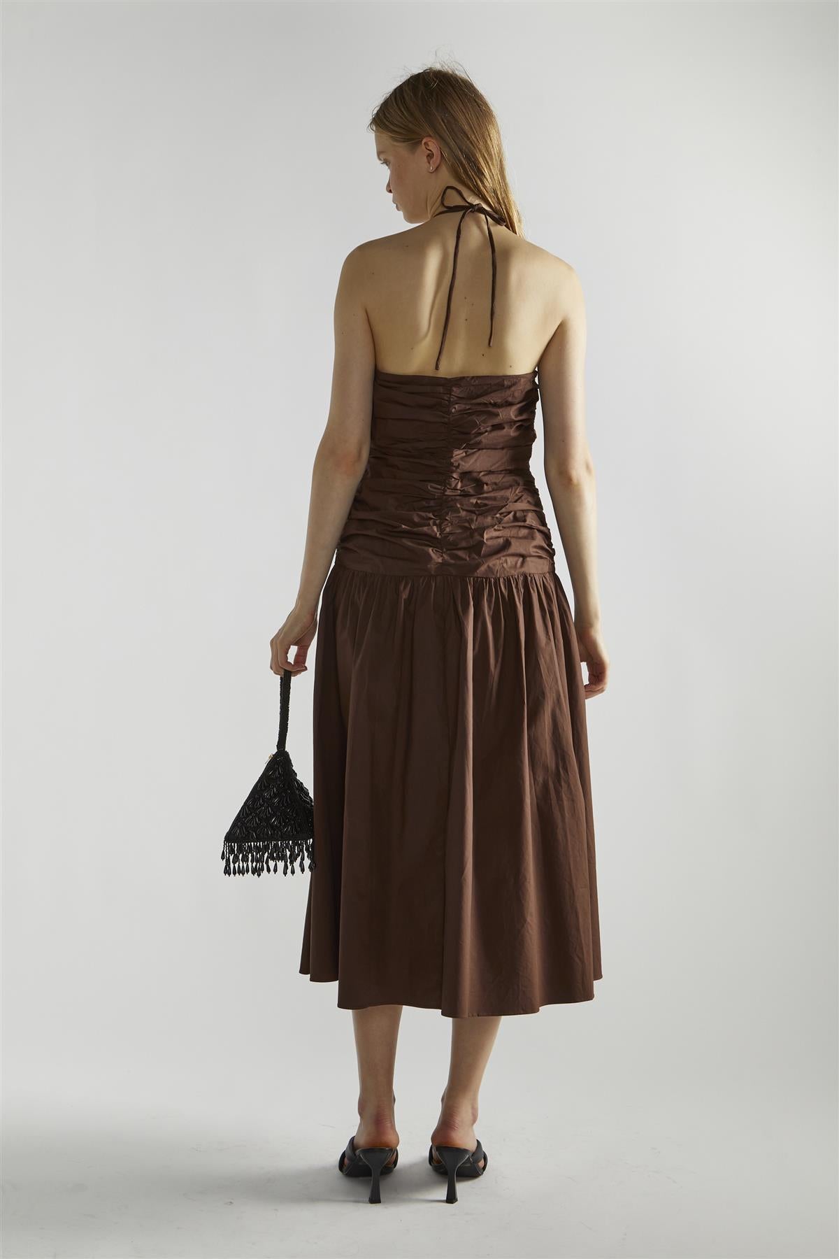 Collective the Label Women's Chaya Women's Brown Ruched Midaxi-Dress. The Brown Chaya Ruched Midaxi-Dress is a lovely blend of comfort and style. This sleeveless number features a unique neckline that combines a square shape with a subtle V-cut, offering a flattering frame for your décolletage. The adjustable straps are a thoughtful touch, allowing you to find your perfect fit with ease. The dress's pleated fabric adds texture and movement, while the ruched detailing creates a figure-flattering silhouette. The rich brown hue is versatile and warm, perfect for transitioning between seasons. This midaxi length is ideal for various occasions - from casual brunches to evening events. Pair it with strappy sandals and gold jewellery for a summery look, or layer it with a cropped jacket and ankle boots as the weather cools. The Brown Chaya is a adaptable piece that you'll find yourself reaching for time and time again.