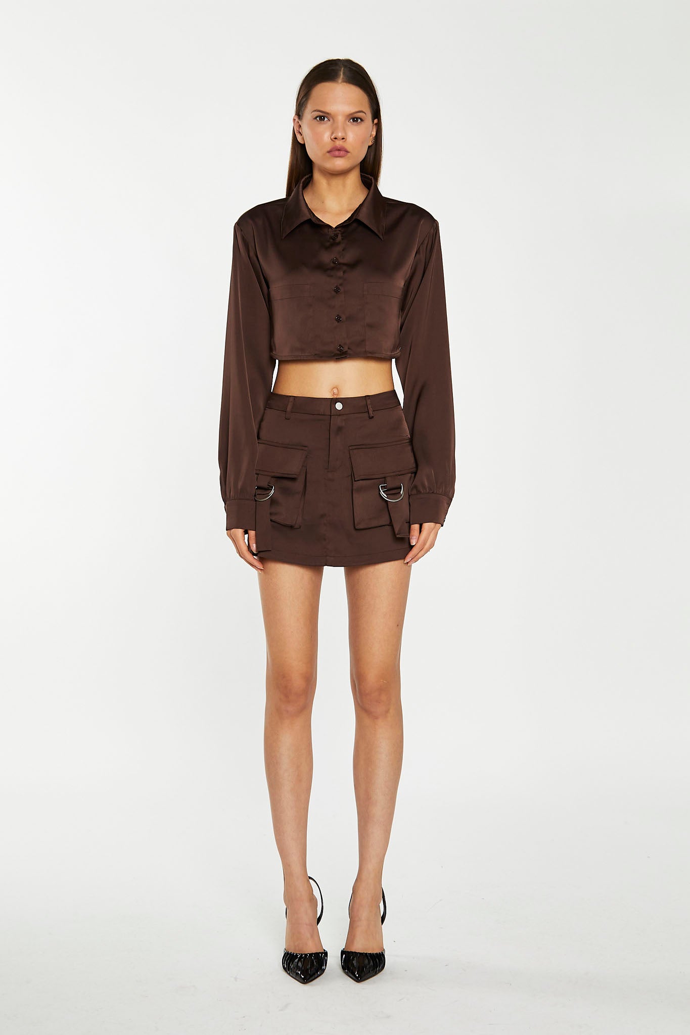 Glamorous Womens Brown Satin Cargo Mini-Skirt. This on-trend Cargo Mini-Skirt is the perfect bold statement piece! Look cool in the low waist fit and cargo style pockets with strap details. Pair with the matching top available for a totally fierce look!