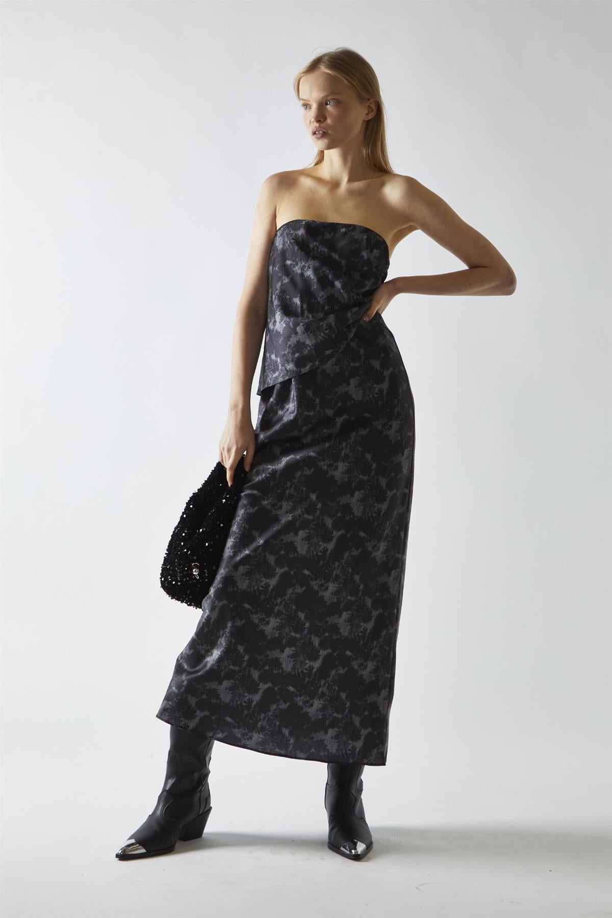 Glamorous Charcoal Digital-Floral Midi Skirt. Bloom into style with this charming charcoal digital floral midi skirt. It's the perfect blend of edgy and feminine, featuring a moody floral print that stands out from your typical garden variety. The midi length offers a flattering silhouette that works for various body types and occasions. This skirt is a versatile piece that can take you from office to evening with ease. Pair it with a crisp white blouse for a polished work look, or dress it up with a sleek black top for dinner dates. The charcoal background gives the floral print a modern, artistic twist, making it a unique addition to your wardrobe. It's comfortable enough for all-day wear but stylish enough to make you feel put-together without trying too hard. The digital floral pattern adds a touch of nature to your urban lifestyle, bringing a bit of garden charm to city streets. This skirt isn't just clothing; it's a wearable work of art that'll have you feeling like you're floating through a midnight garden, no matter where your day takes you.