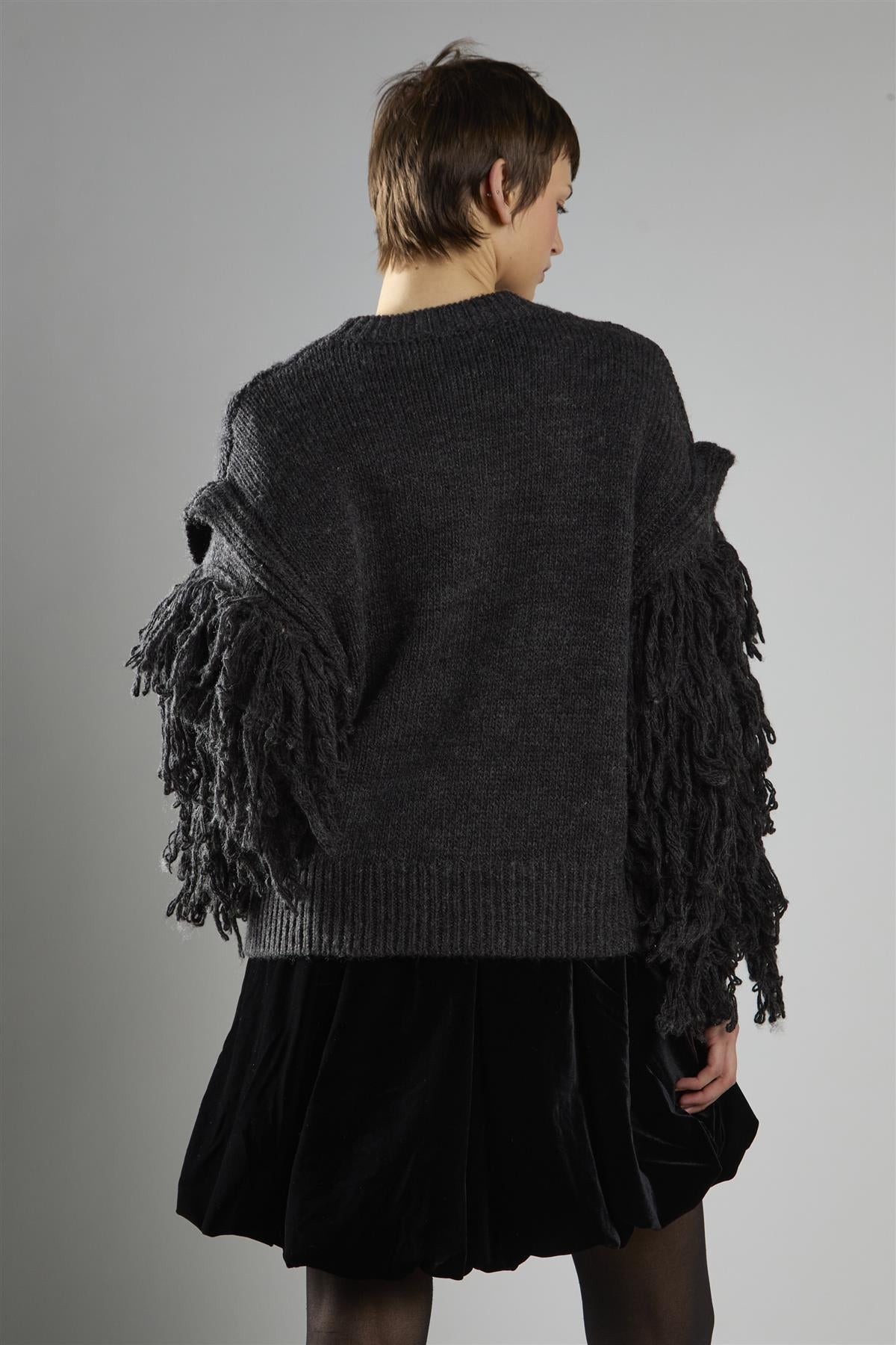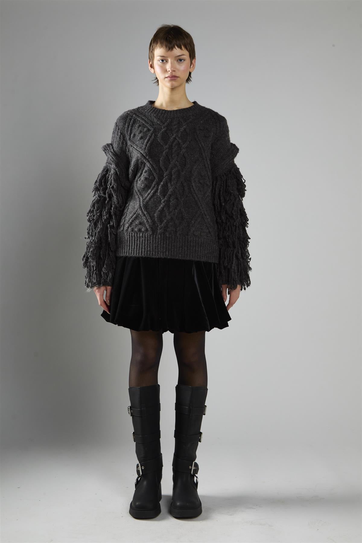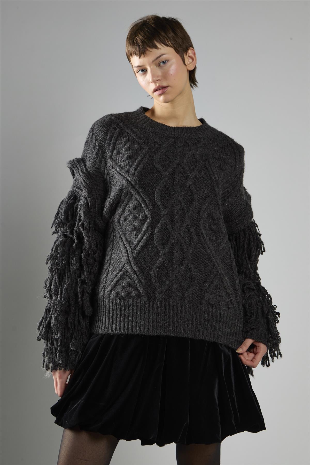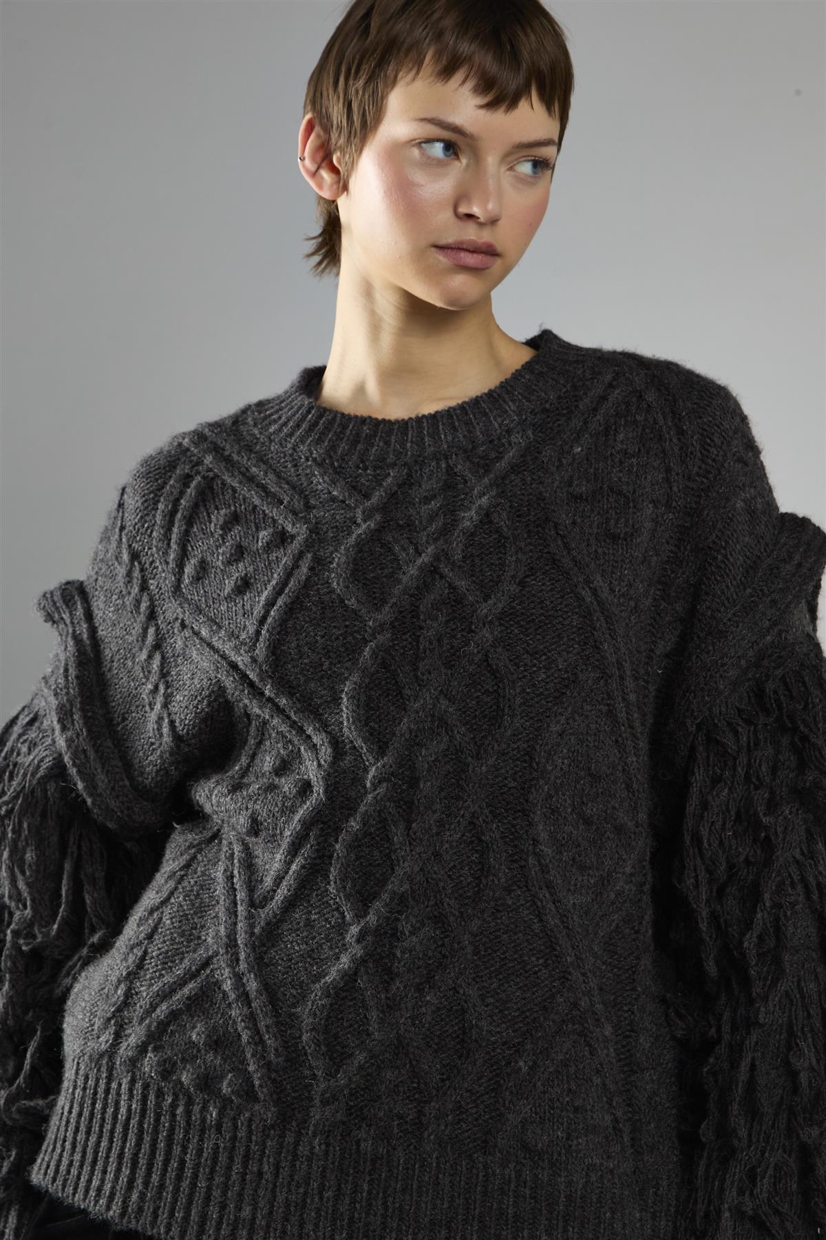 Glamorous Women's Charcoal Fringe Sleeve Cable Knit Jumper. Bring texture and effortless style to your everyday wardrobe with this fringe sleeve cable knit jumper, designed to keep you comfortable while adding subtle, standout details. The long sleeves and crew-neck provide a classic, easy fit, while the cable-knit construction adds depth and cozy structure. Fringe detailing along the sleeves introduces a playful, modern twist that elevates a simple knit into something special. Pair it with a mini skirt and combat boots to create a balanced, relaxed look that’s both stylish and comfortable, making this jumper a versatile piece for layering and casual styling.