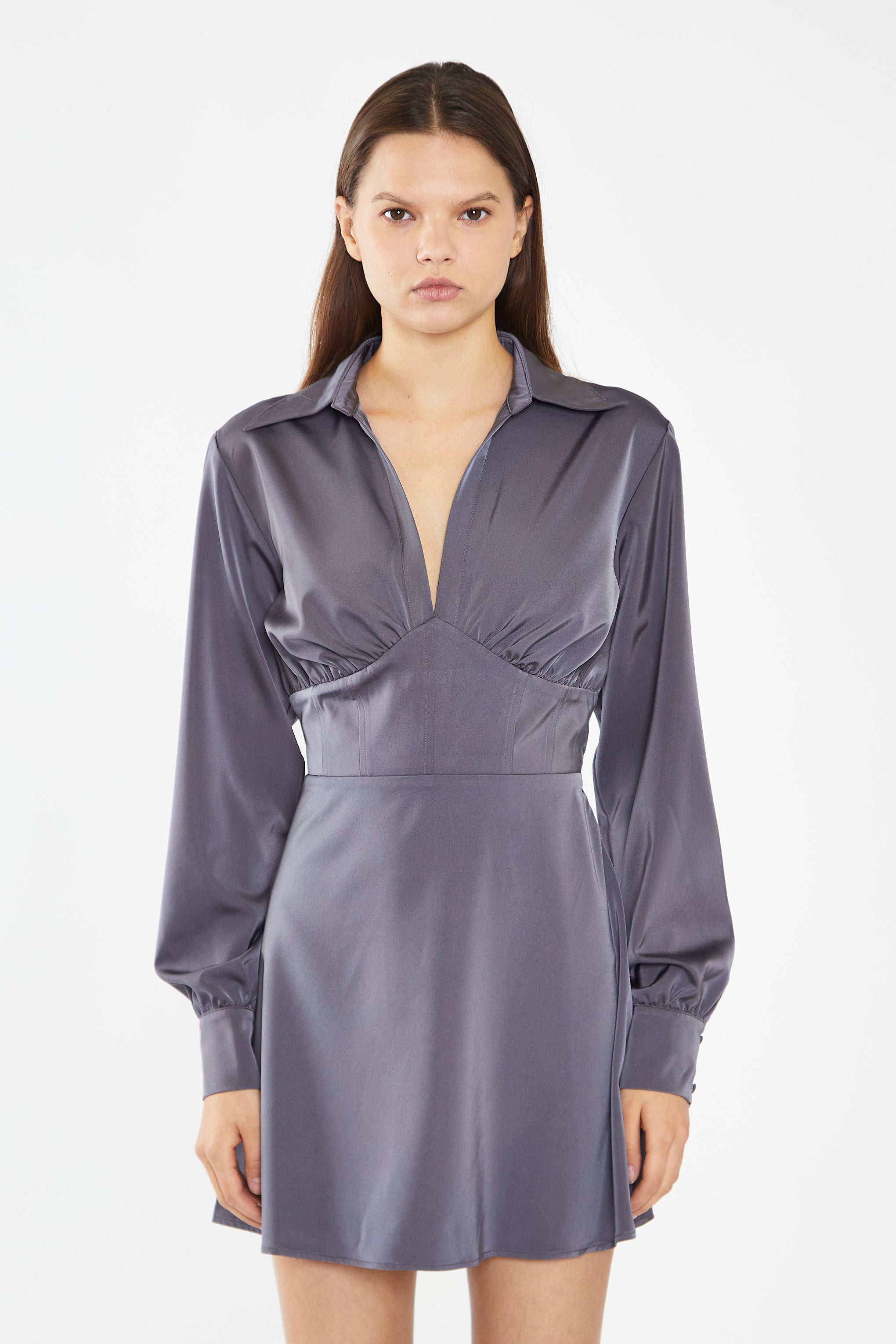 Glamorous Womens Charcoal Grey Corset Shirt Mini-Dress. This Charcoal grey mini dress is the definition of a perfect statement-maker--with its low cut neckline and long sleeves, youll be sure to make heads turn! Transition from the office to a night out with effortless, fashionable ease.