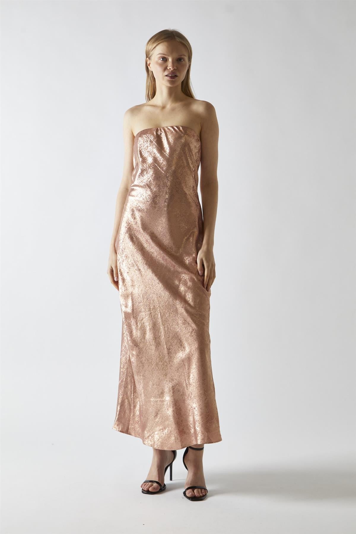 Copper-Metallic Strapless Midi Dress
