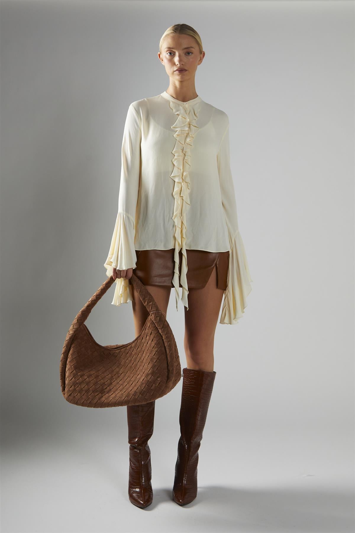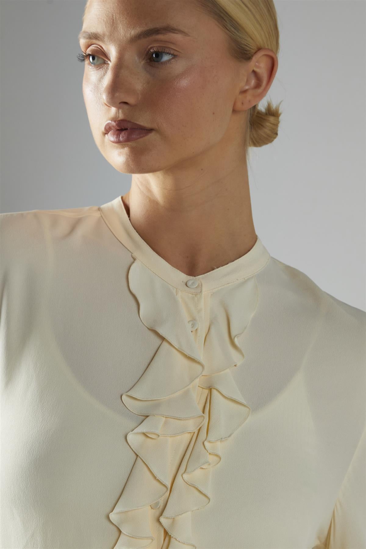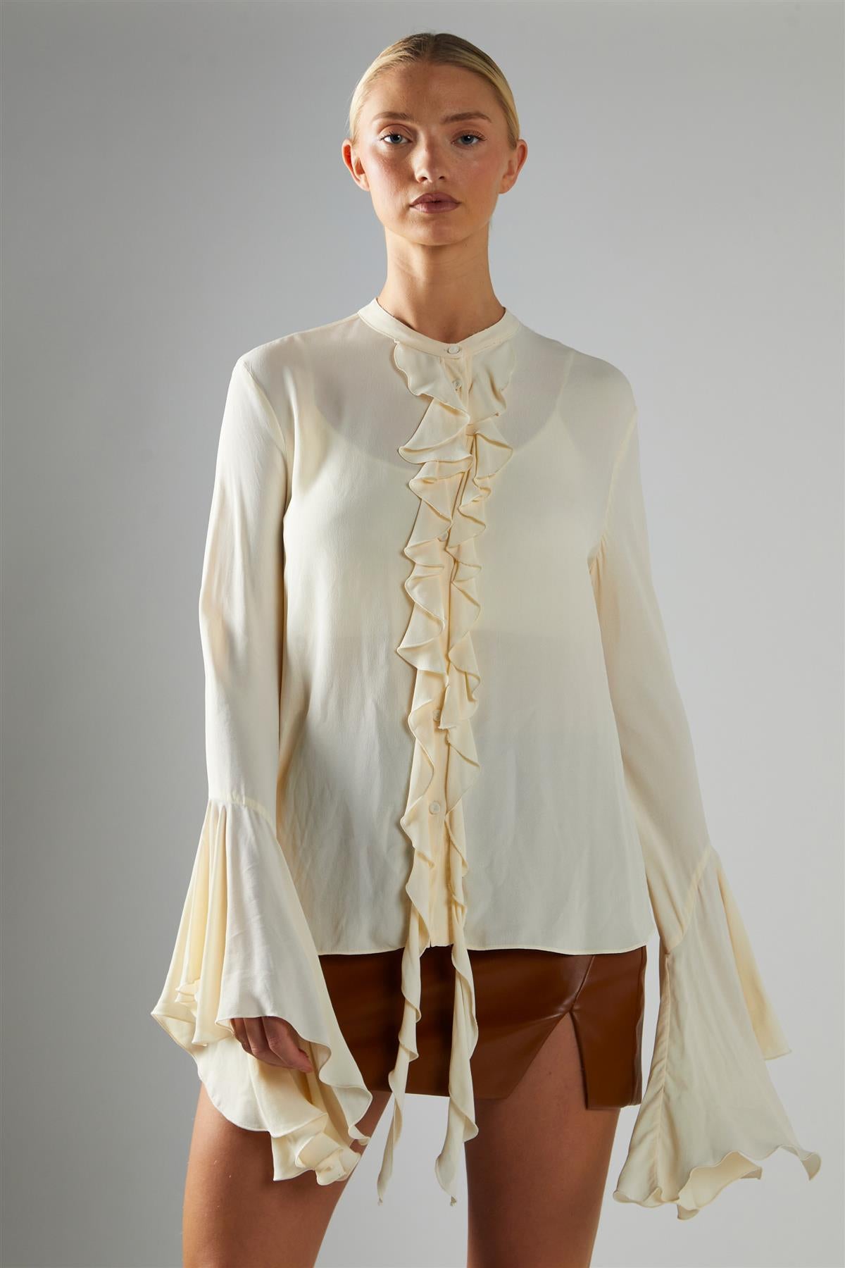 Glamorous Women's Cream Flared-Sleeve Blouse. This flared-sleeve blouse brings a touch of drama to your everyday style, thanks to its oversized sleeves and flowing ruffle details. The cascading ruffles move softly as you go about your day, adding a playful energy that’s still easy to wear. The fabric feels smooth and light, making this blouse a comfortable choice for both busy mornings and relaxed afternoons. The roomy sleeves give you plenty of freedom to move, while the overall design stays simple enough to pair with just about anything. Try it with tailored trousers for a crisp, modern look, or keep things casual with your favourite jeans. With its blend of bold sleeves and gentle ruffles, this blouse quietly brightens up your outfit, making it a friendly pick for days when you want something a little different without any fuss.