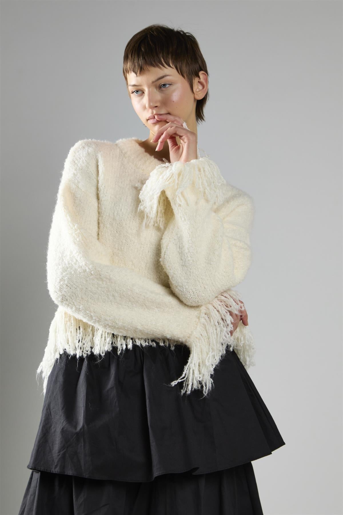Glamorous Women's Cream Fringe-Trim Long Sleeve-Jumper. This long sleeve jumper brings a cozy twist to laid-back days, thanks to its soft knit feel and eye-catching fringe details. The round neckline keeps the look easy and relaxed, while the fringe-trim hem and cuffs add just enough texture to make things interesting without trying too hard. It’s the kind of layer you throw on when you want to feel put together but still stay comfortable, whether you're lounging around or heading out for a casual coffee run. Style it with denim or soft knit trousers for a balanced, easygoing outfit. The jumper has a quiet charm that makes it easy to wear again and again without ever feeling boring.