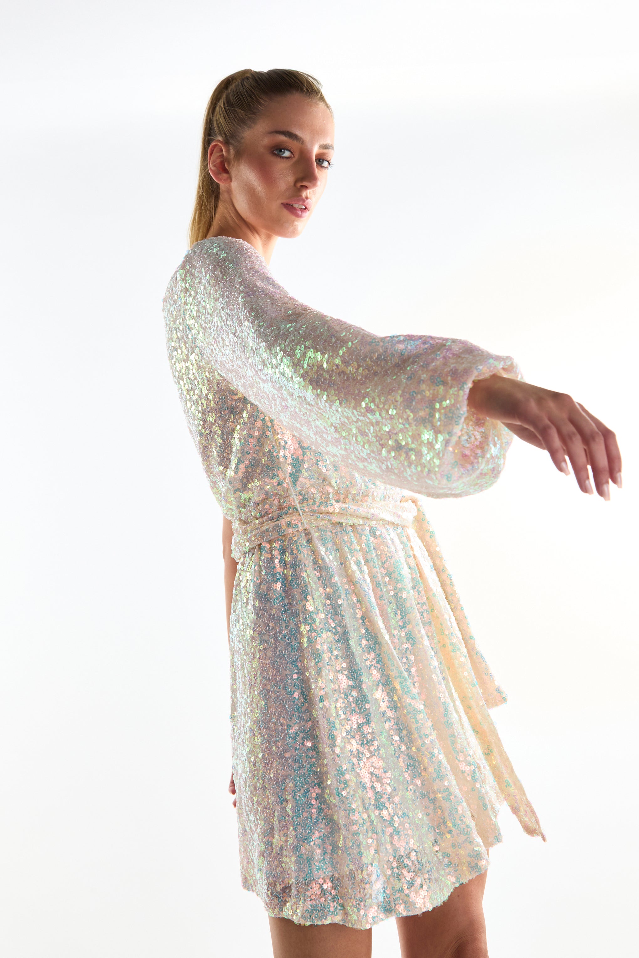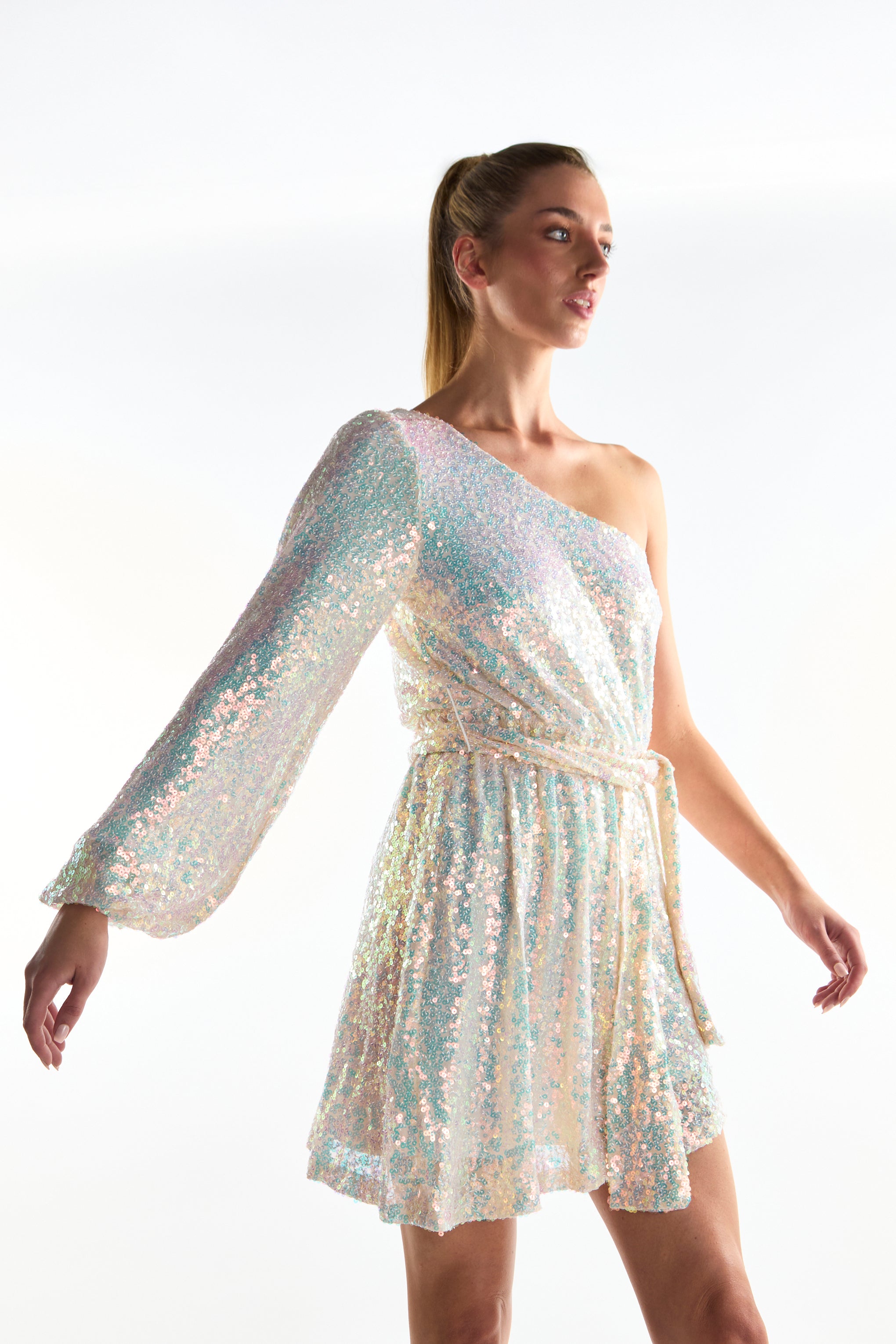 Glamorous Women's Cream Iridescent-Sequin Asymmetric Mini-Dress. Look your best in this sequin mini-dress! Featuring sparkling sequin fabric and an asymmetric one-shoulder cut, you'll be the envy of any party. A waist belt finished the look and shows off your curves. Go full glam in this number and turn all the heads!