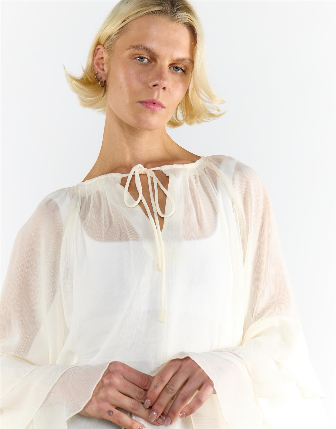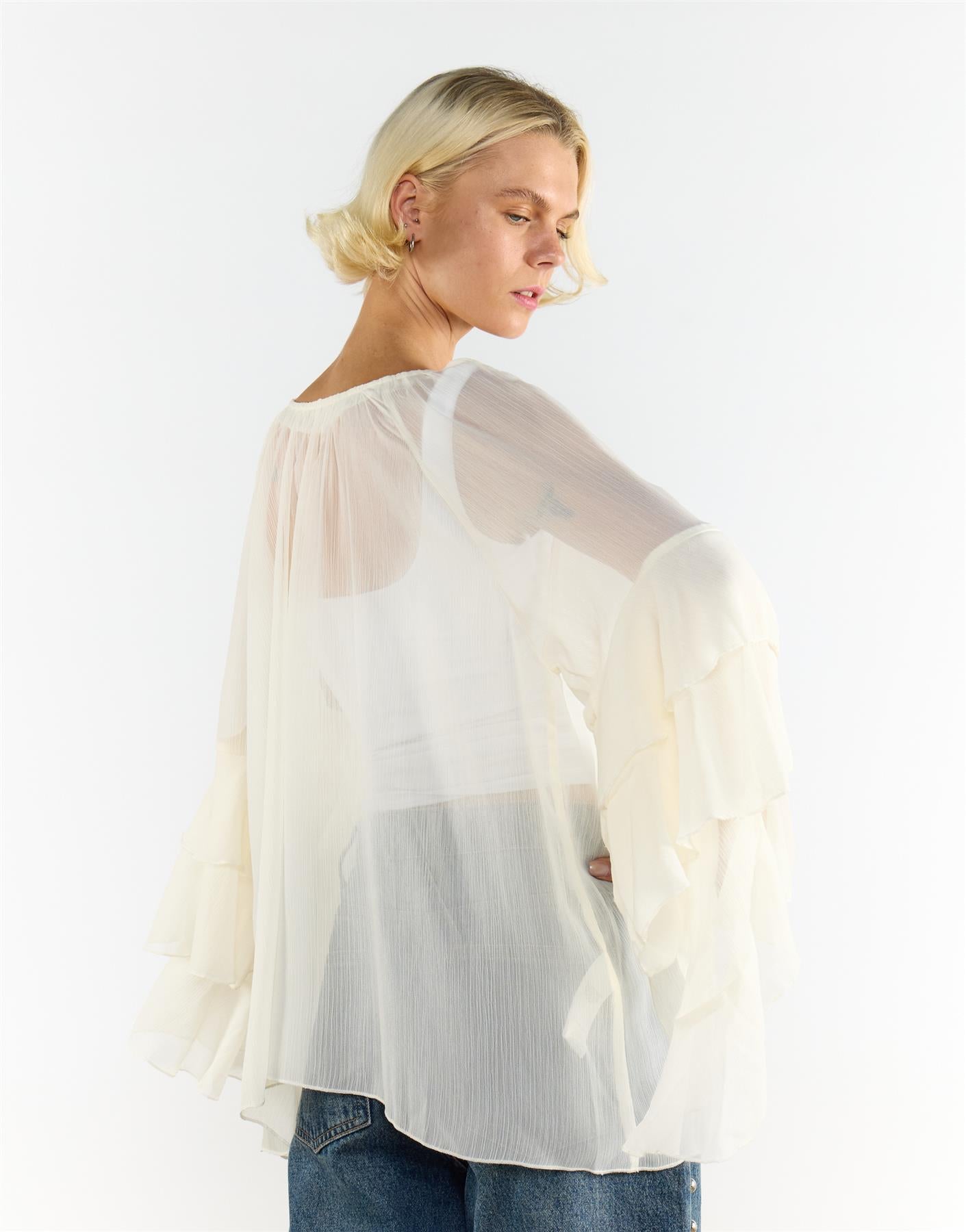 Glamorous Women's Cream Multi Ruffle Long Sleeve Top. Make a simple outfit feel effortlessly stylish with a Multi Ruffle Long Sleeve Top that adds movement, texture, and personality to your look. Long statement sleeves create a dramatic, flattering shape while multi lace ruffle layers bring delicate detail and playful dimension. Tie back detailing allows you to adjust the fit and adds a charming, polished finish that elevates your style without fuss. Perfect for pairing with flared trousers or a mini skirt, this top transforms everyday pieces into standout outfits, giving you confidence and a touch of effortless sophistication in one versatile design.