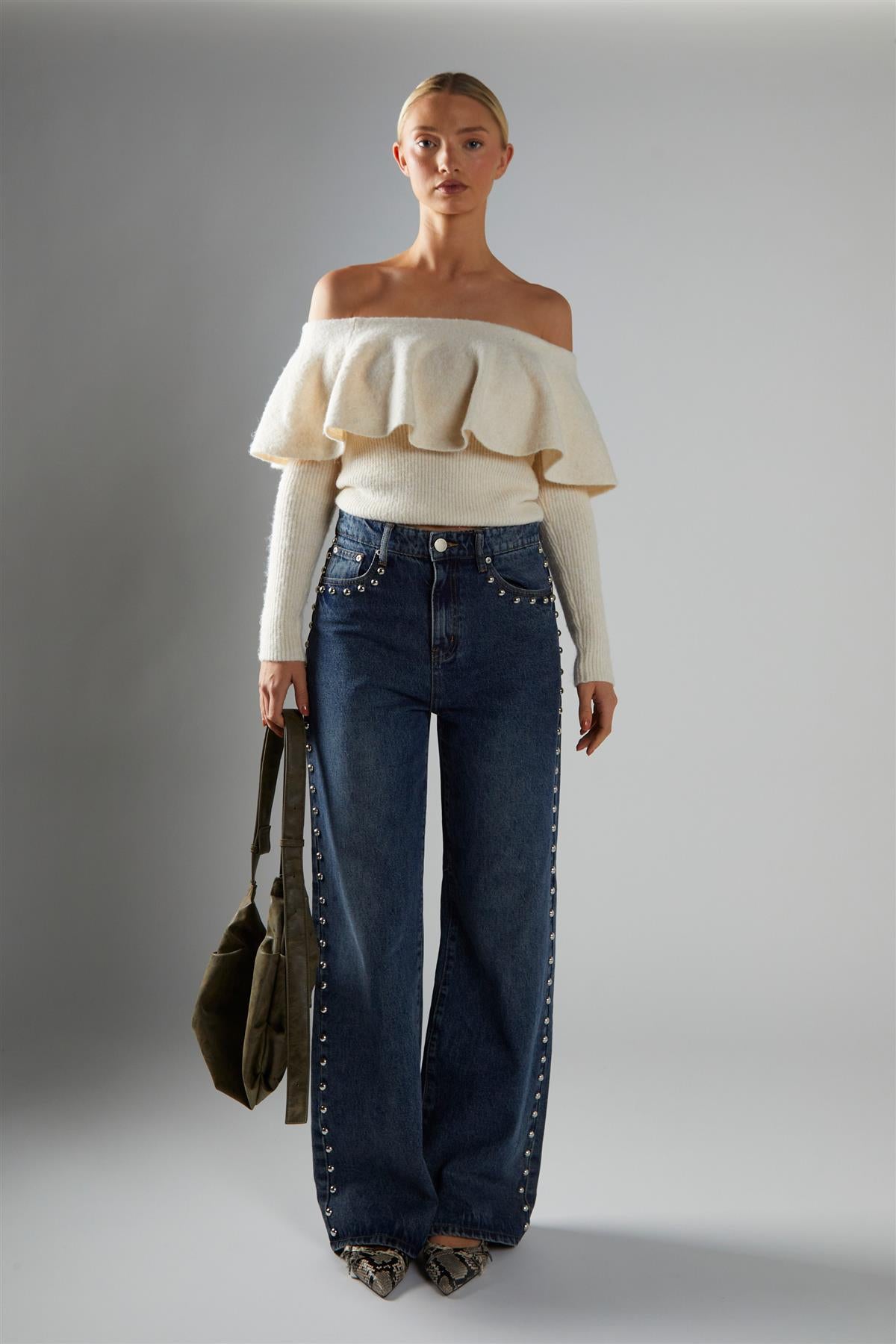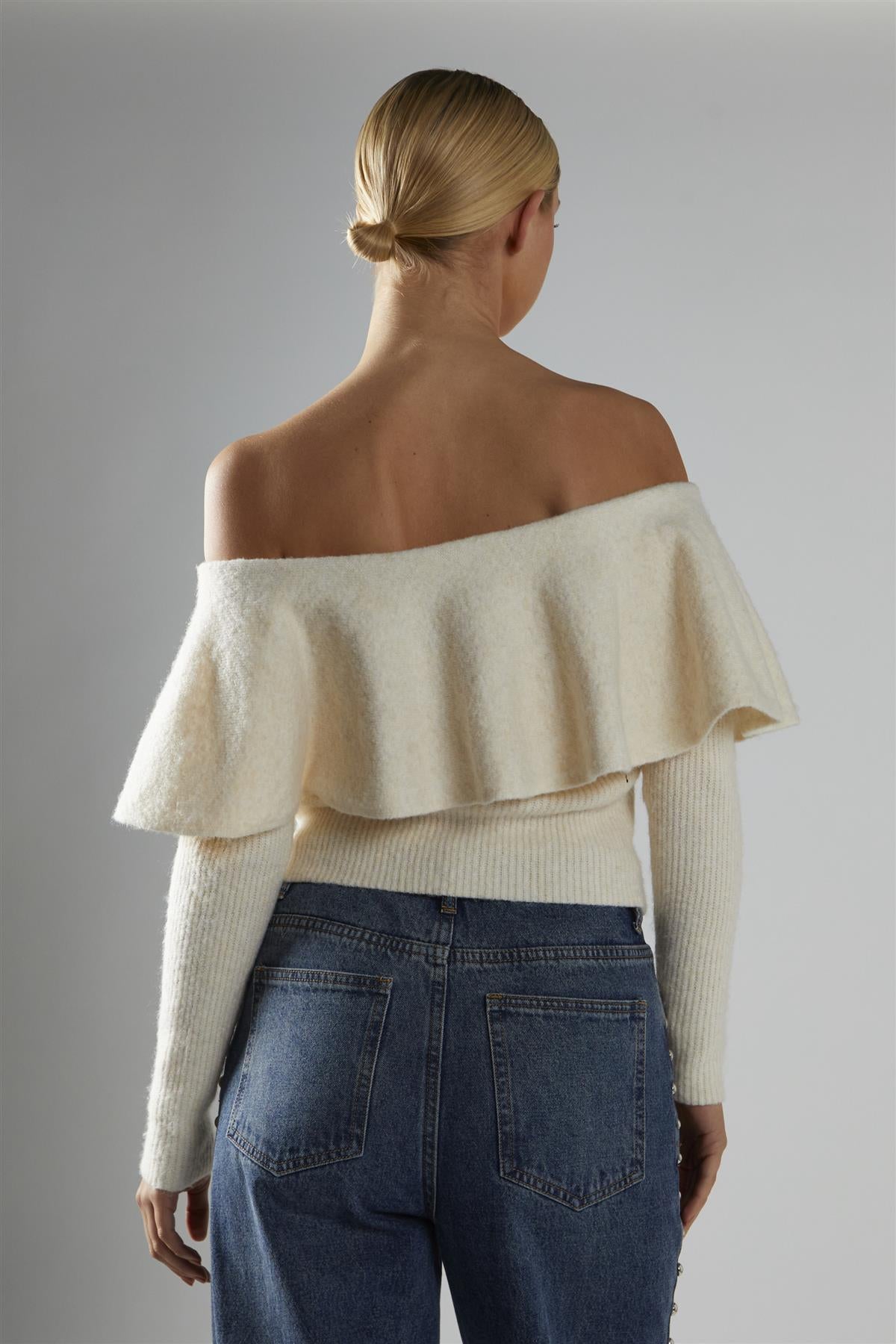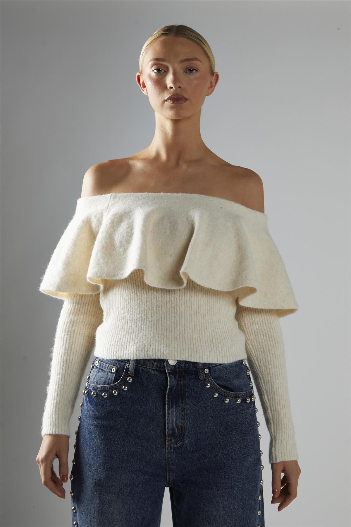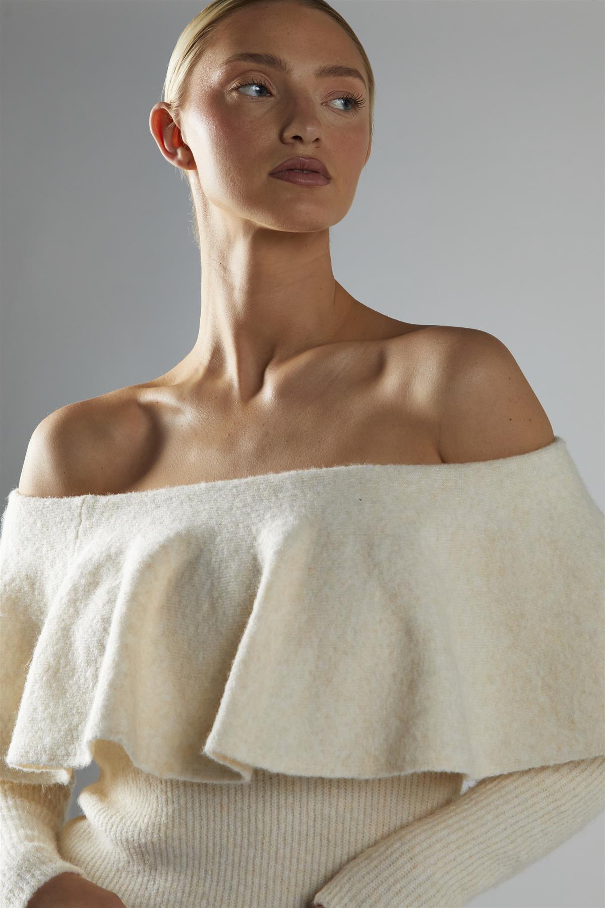 Glamorous Women's Cream Peplum-Bardot Jumper. This peplum-Bardot jumper brings a gentle twist to everyday style, blending a fitted rib knit with thoughtful details that feel both fresh and easy to wear. The Bardot neckline sits softly across the shoulders, giving a breezy, open feel, while the ruffle peplum adds a playful layer that moves with you. Long sleeves offer a bit of warmth, making this jumper a friendly companion for cooler days or evenings out. The ribbed texture hugs your shape just enough, creating a comfortable fit that still feels relaxed. Pair it with tailored trousers for a neat look, or dress it down with your favourite jeans for something more laid-back. With its mix of classic and modern touches, this jumper is designed to quietly support your style, making it easy to feel put-together without any fuss.