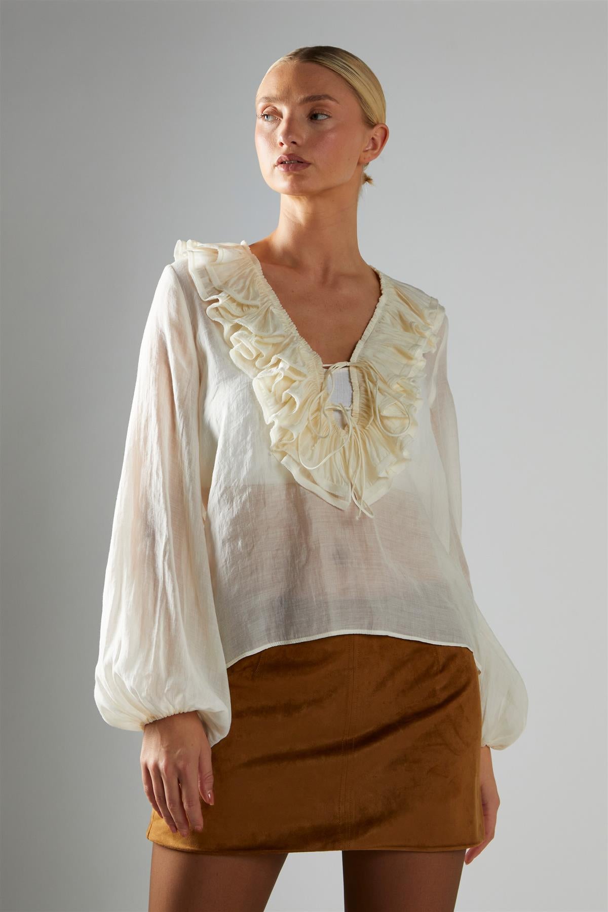 Glamorous Women's Cream Ruffle-Neck Blouse. This ruffle-neck blouse brings a soft, easy-going charm to your day, with its gentle neckline detail and relaxed silhouette. The ruffle at the neck adds a touch of whimsy, framing your face in a way that feels both playful and refined. Bell sleeves flow gracefully from the shoulders, giving you a bit of movement and a breezy feel that’s comfortable from morning to night. The loose fit drapes lightly over your frame, making it simple to tuck into trousers for a polished look or leave untucked with jeans for something more laid-back. The fabric feels light and airy, making this blouse a friendly choice for warmer days or for layering under your favourite cardigan when the weather cools. It’s a piece that quietly stands out, offering just the right amount of detail to make everyday dressing feel a little more special.