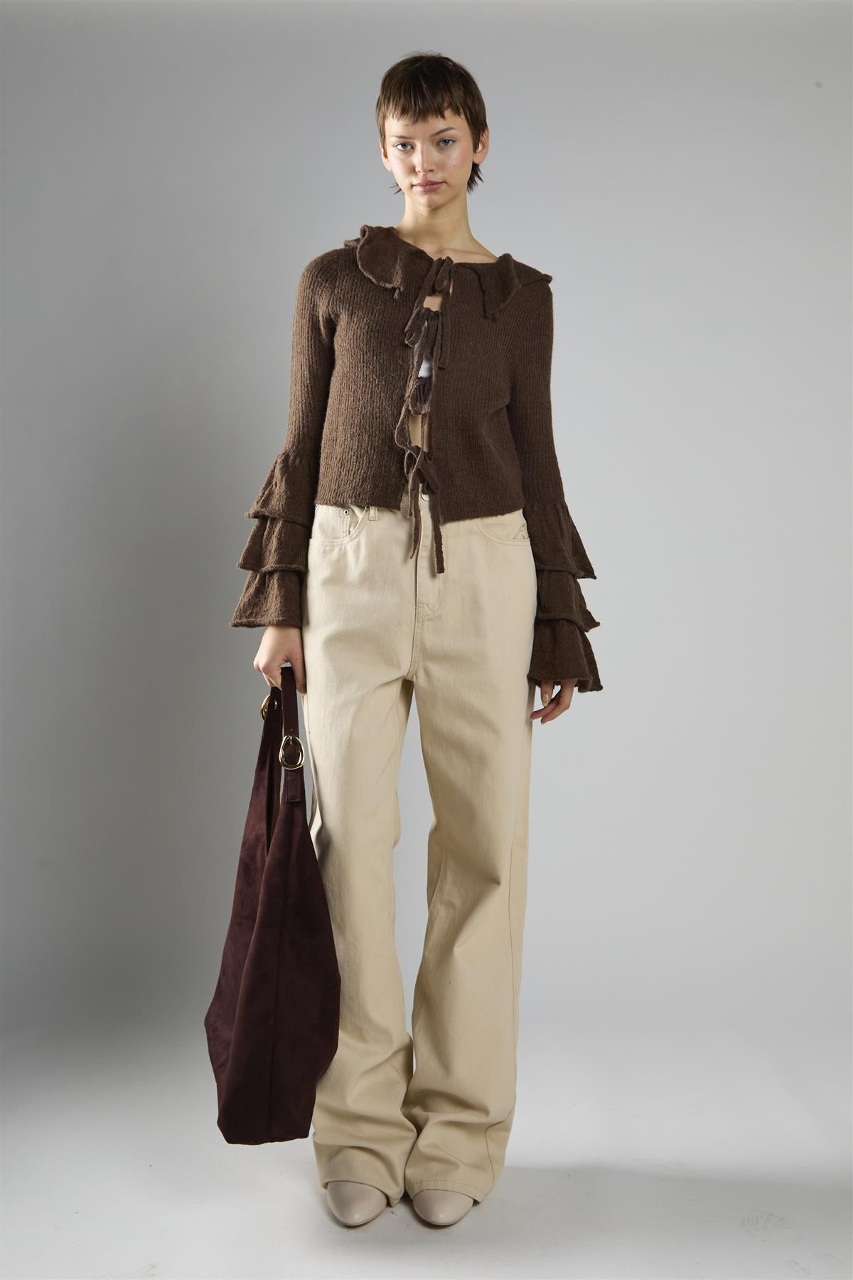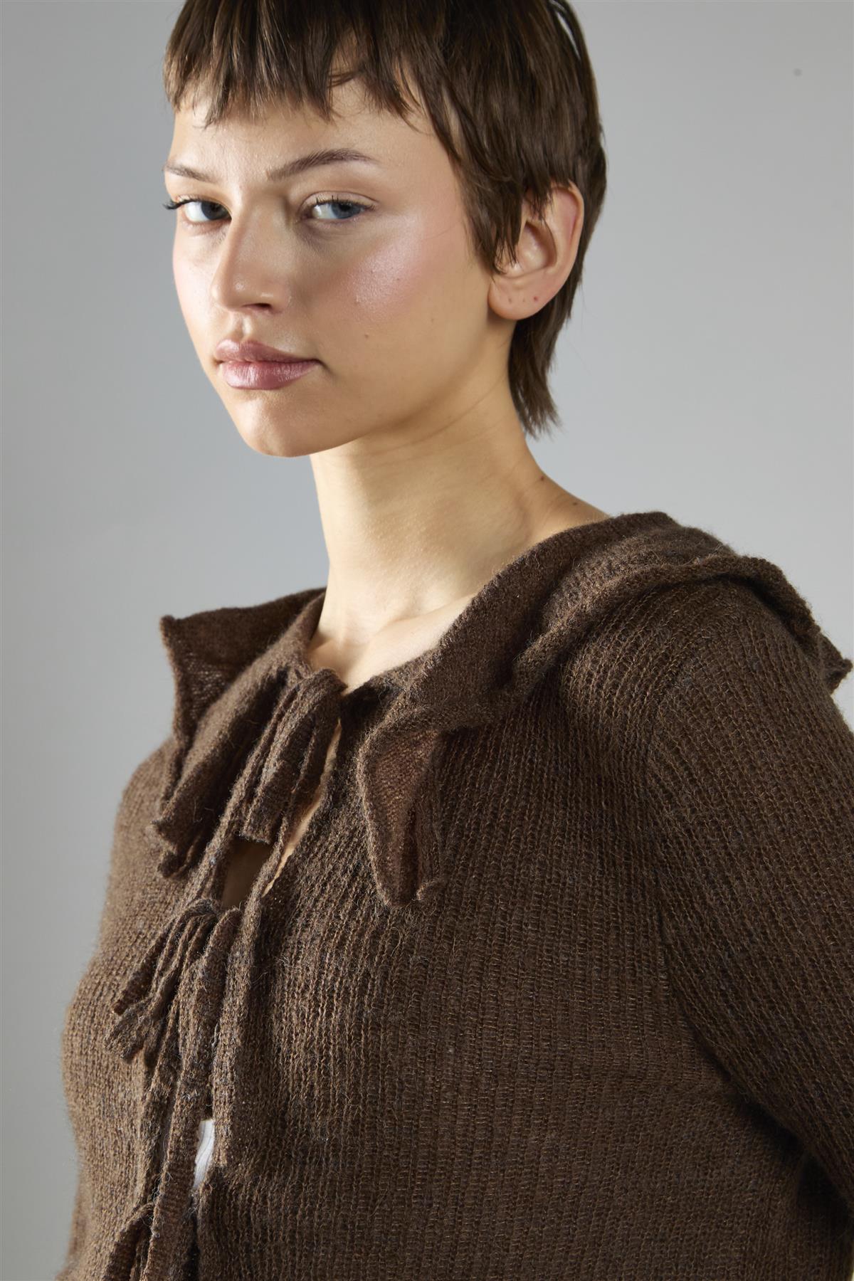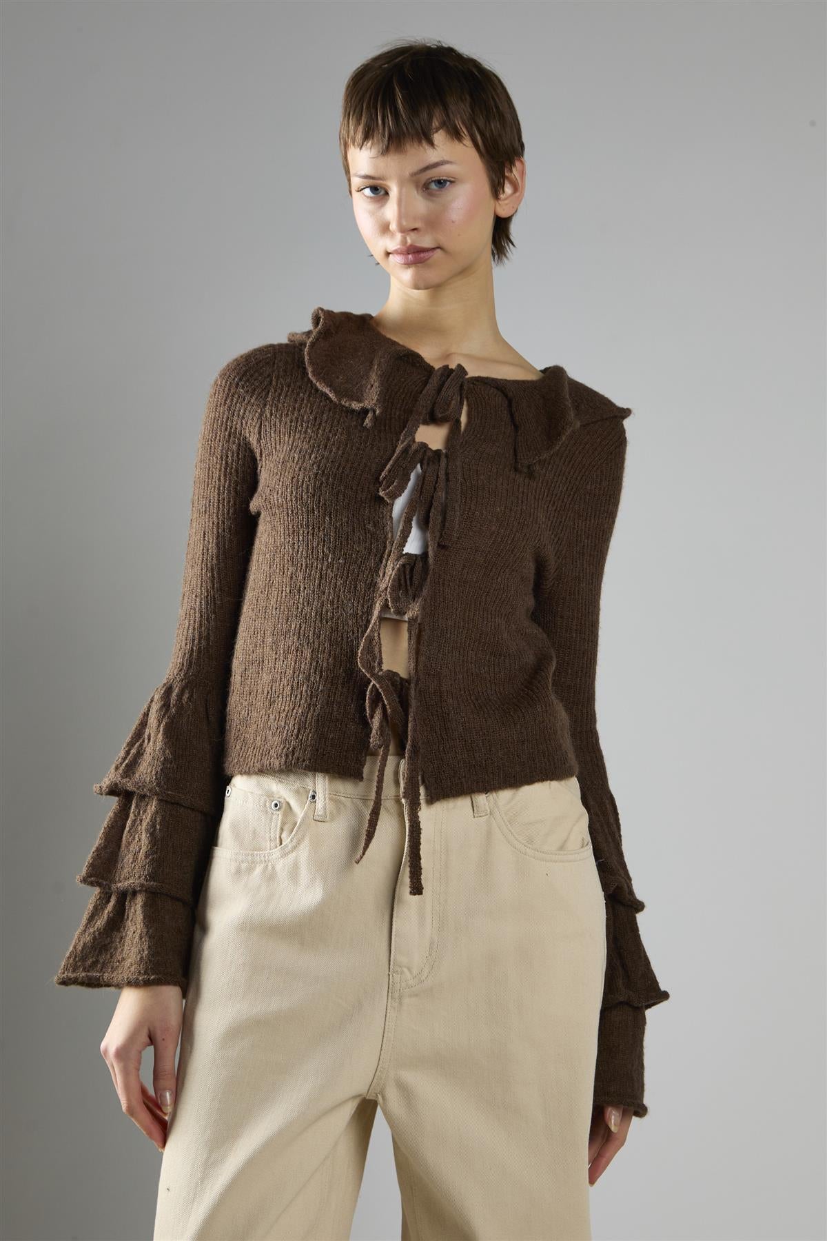 Glamorous Women's Dark Brown Ruffle Front Tie Long Sleeve Top. Bring a touch of easy elegance to your everyday style with the Ruffle Front Tie Long Sleeve Top, designed to feel as comfortable as it looks refined. Long sleeves keep the shape effortlessly balanced, while the front tie detail adds just the right amount of charm for a playful yet polished finish. Soft ruffle sleeves flow with movement, creating texture that feels fresh and feminine, and the statement collar ties it all together with a bold accent that stands out. Pair with cream trousers and a suede bag for a look that feels modern, relaxed, and instantly put together.