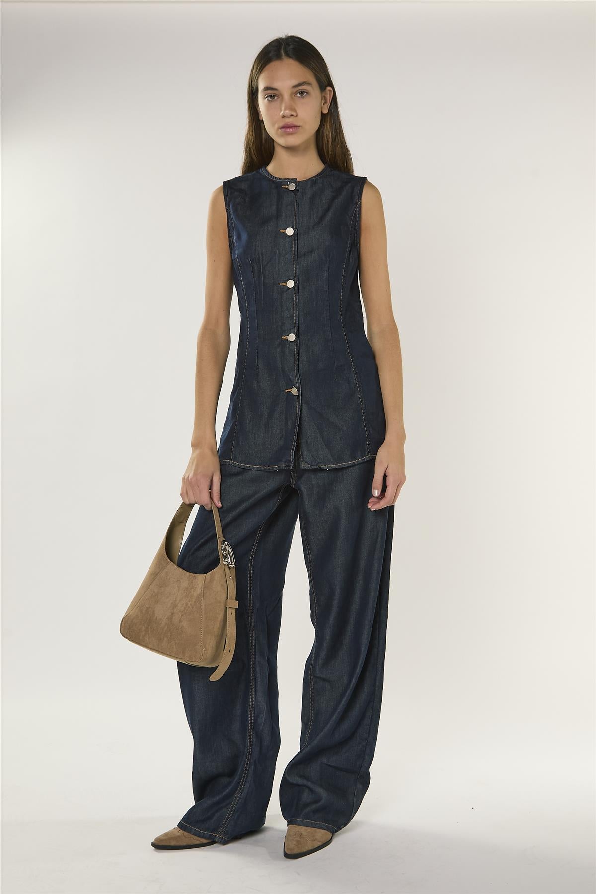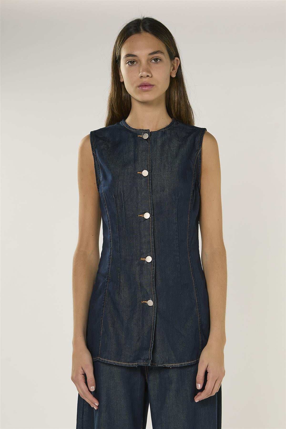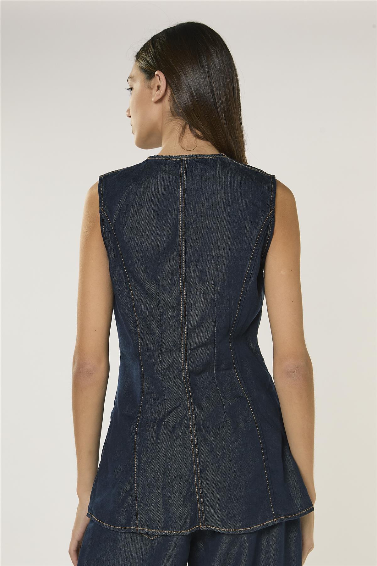 Glamorous Women's Dark Indigo Denim Sleeveless Blouse. Effortless style meets everyday comfort in this sleeveless denim blouse, designed to bring a relaxed yet polished feel to your wardrobe. The classic round neckline frames the face softly, while the regular length ensures easy layering or standalone wear with a flattering silhouette. Its versatile design makes it perfect for dressing up with tailored trousers or pairing with casual bottoms for a laid-back, stylish look. Simple to wear and easy to style, this blouse adds a subtle edge to your outfits while keeping comfort and confidence at the forefront of your day.