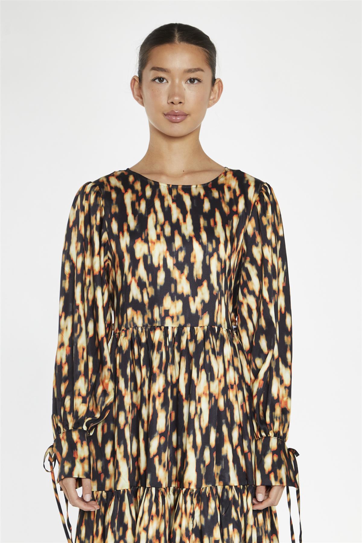 Glamorous Women's Digital Tie-Dye Oversized Tie-Front Maxi-Dress. Embrace the cozy charm of autumn with our Oversized Tie-Front Maxi-Dress! This stunning piece features a relaxed, oversized silhouette that's perfect for staying comfortable on chilly days. The tie-front detail adds a playful touch, while the tiered skirt and long puff sleeves create a flattering, feminine shape. Pair it with ankle boots and a denim jacket for a casual, yet stylish look, or dress it up with heeled booties and a statement necklace for a night out. Made from soft, breathable fabric, this maxi dress is perfect for transitioning between seasons. Step out in comfort and style with this versatile autumn essential!.