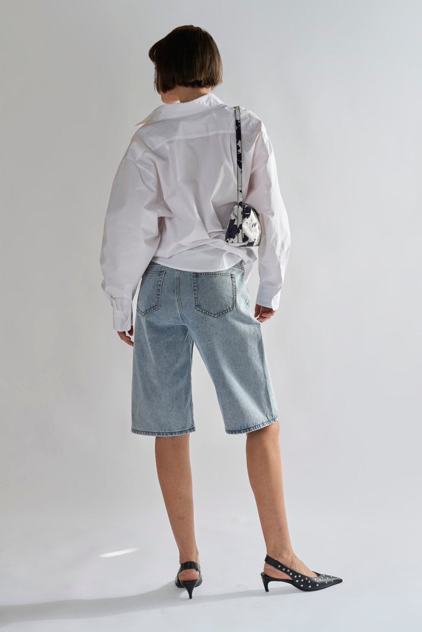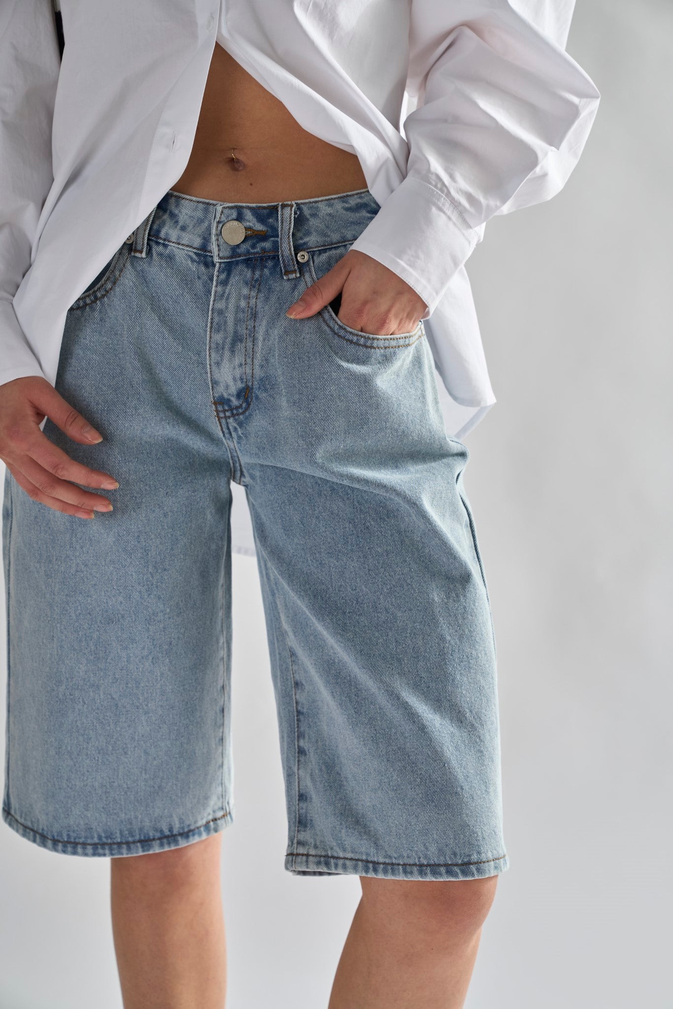 Glamorous Women's Dirty Vintage Blue Denim Long -Shorts . Our Dirty Vintage Blue Denim Long Shorts are the perfect blend of rugged charm and casual comfort. These shorts feature a lived-in look with their unique dirty vintage wash, giving them character right from the start. The longer length hits just above the knee, offering extra coverage while keeping you cool on warmer days. Made from sturdy denim, they're built to last and will only get better with wear. These shorts are ideal for your laid-back adventures, from backyard barbecues to weekend flea market trips. They pair effortlessly with graphic tees, tank tops, or even a button-down shirt for a slightly dressier vibe. The versatile dirty vintage blue colour works well with a variety of tops and shoes, making outfit planning a breeze. With their relaxed fit and timeless style, these long shorts are sure to become a staple in your casual wardrobe, offering both comfort and a touch of vintage cool to your everyday looks.