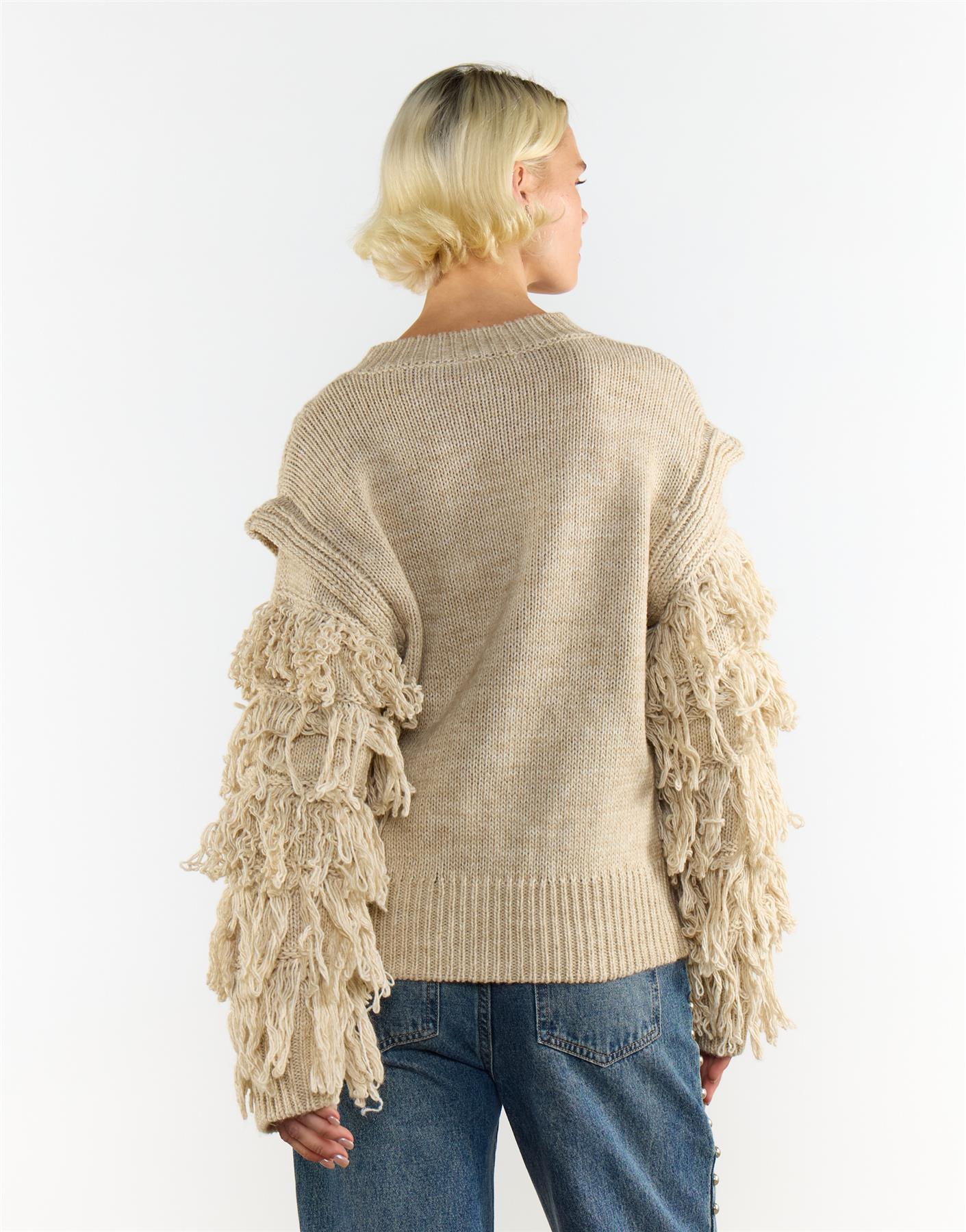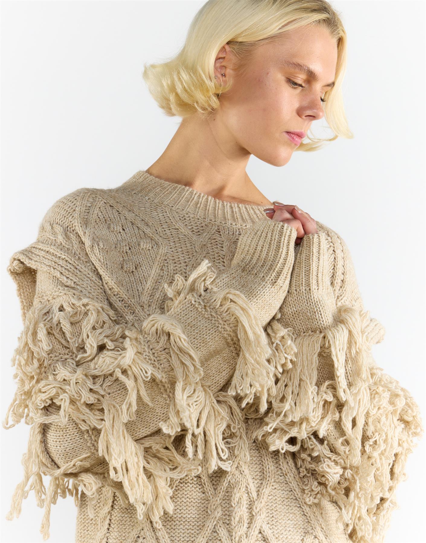 Glamorous Women's Ecru Marl Fringe Sleeve Cable Knit Jumper. Bring texture and effortless style to your everyday wardrobe with this fringe sleeve cable knit jumper, designed to keep you comfortable while adding subtle, standout details. The long sleeves and crew-neck provide a classic, easy fit, while the cable-knit construction adds depth and cozy structure. Fringe detailing along the sleeves introduces a playful, modern twist that elevates a simple knit into something special. Pair it with a mini skirt and combat boots to create a balanced, relaxed look that’s both stylish and comfortable, making this jumper a versatile piece for layering and casual styling.