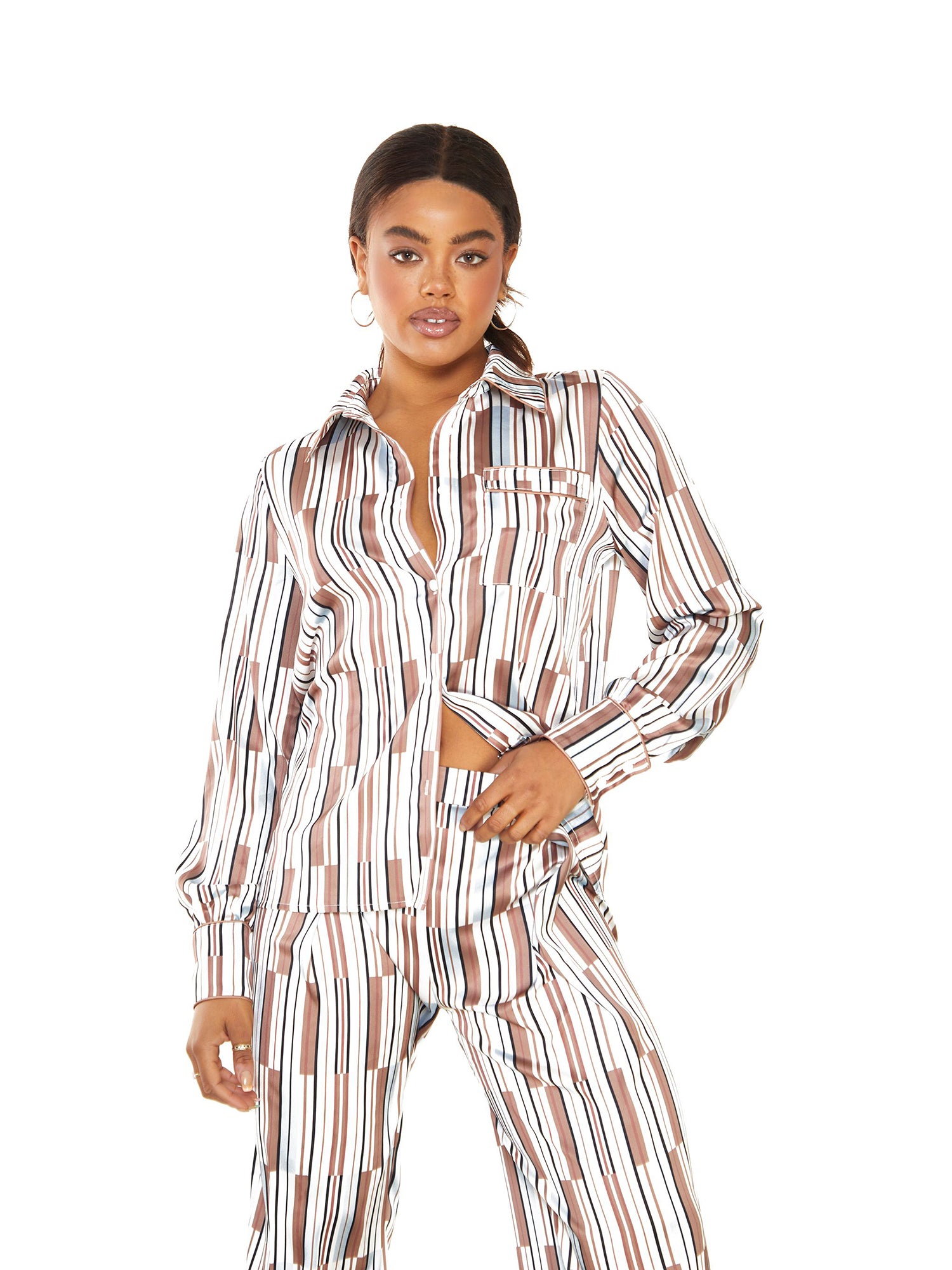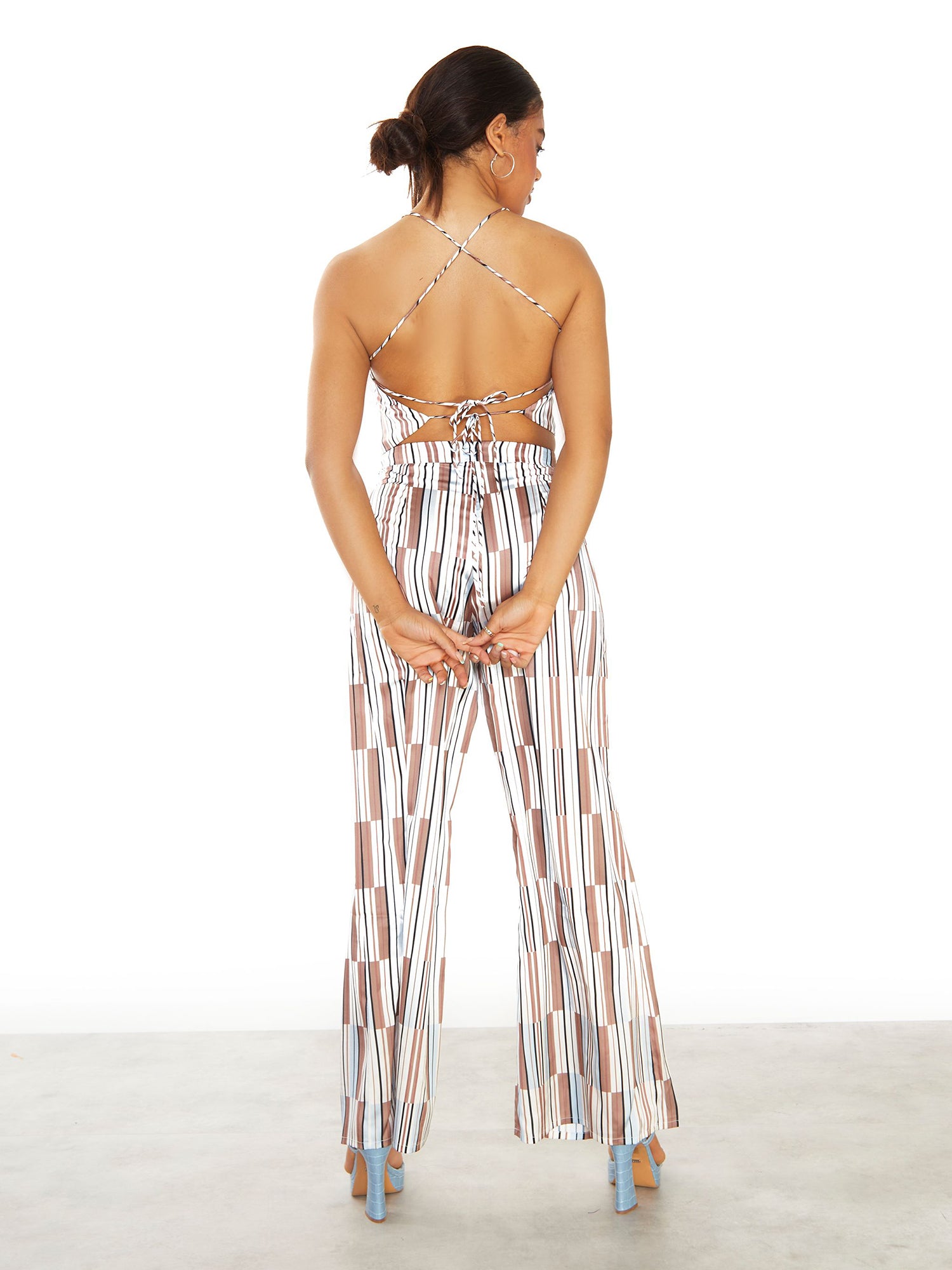 Glamorous Womens Brown Blue Stripe High Waisted Trousers. We are loving this super luxurious stripe trousers. Featuring an on trend pattern and flattering fit, these wont fail to impress. Perfect for drinks with the girls or a date night. Style with matching Brown Blue Stripe Co-ord top and your favourite heels to create the ultimate fashion forward look.