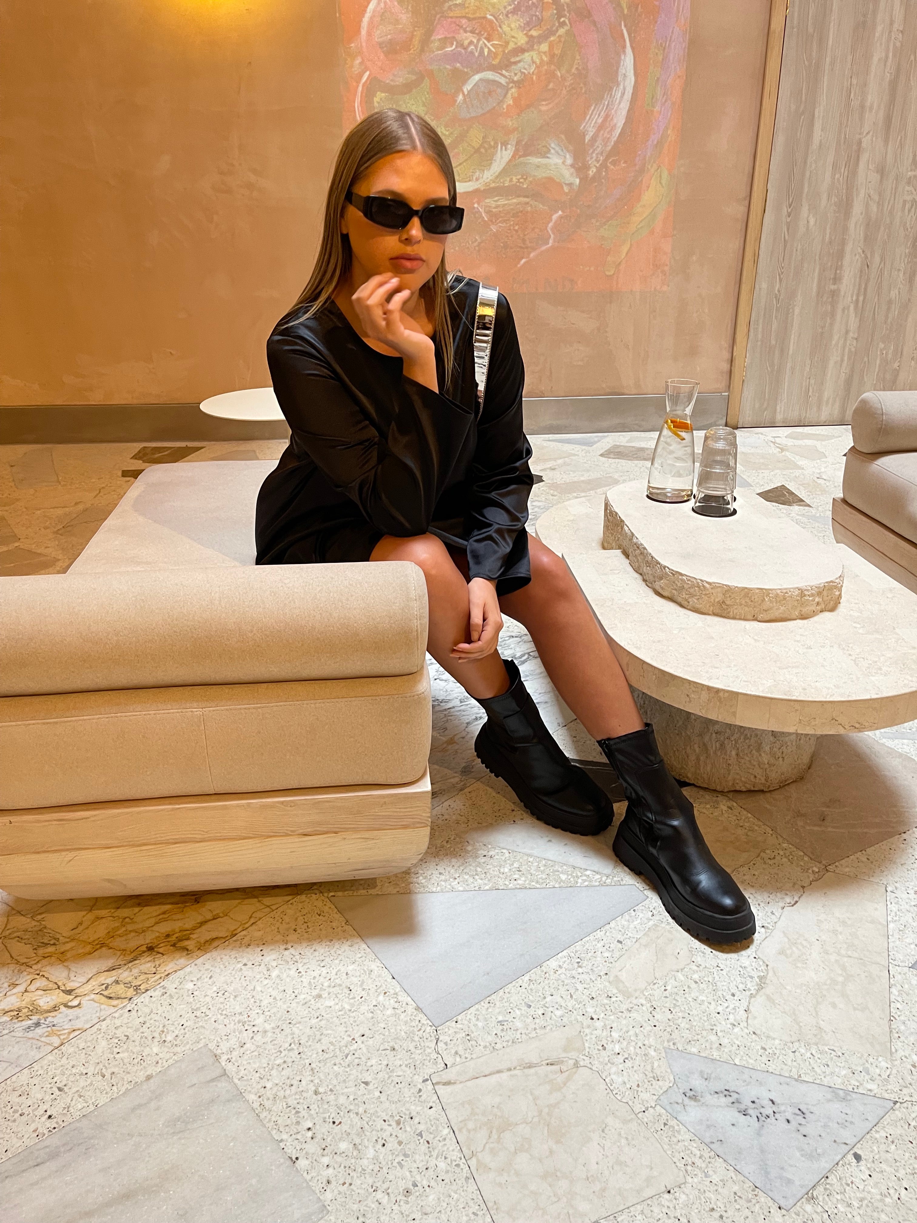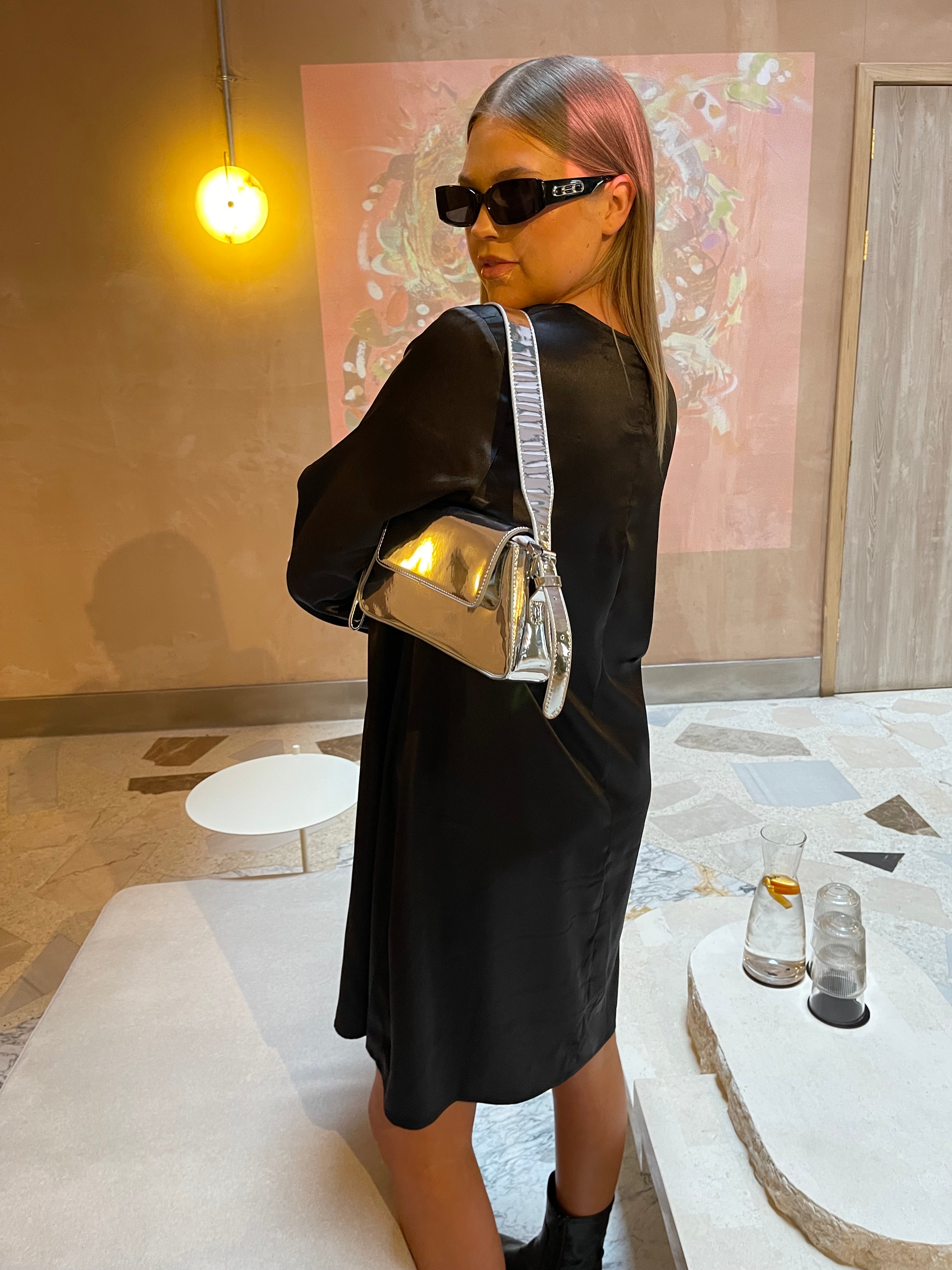 Glamorous Curve Black Long Sleeve Mini Dress. This versatile satin dress features a flattering shift cut and long sleeves. Style it with a statement belt and low heels for brunch, or with some gorgeous strappy heels and a clutch for special occasions.