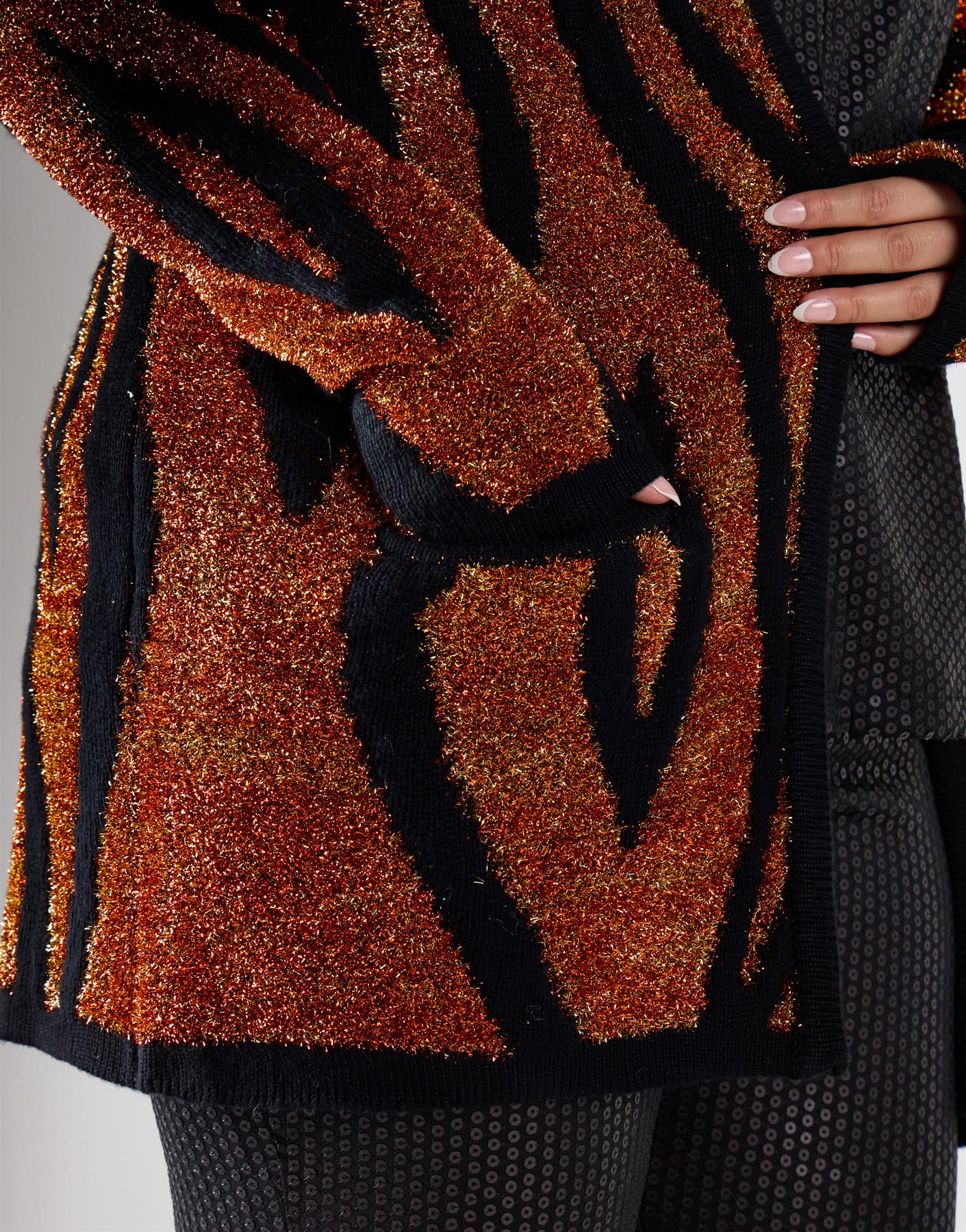 Bring a touch of playful sparkle to your everyday look with this Regular Tiger Lurex Cardigan. Designed with a charming love pattern, it blends comfort with just the right amount of shine for effortless confidence. The soft knit drapes naturally, while long sleeves add warmth and a relaxed finish. Subtle lurex detailing catches the light beautifully, giving this cardigan a hint of glamour that still feels easy to wear. Perfect for layering over your favourite outfits, it’s a versatile piece that adds character and comfort in equal measure.
