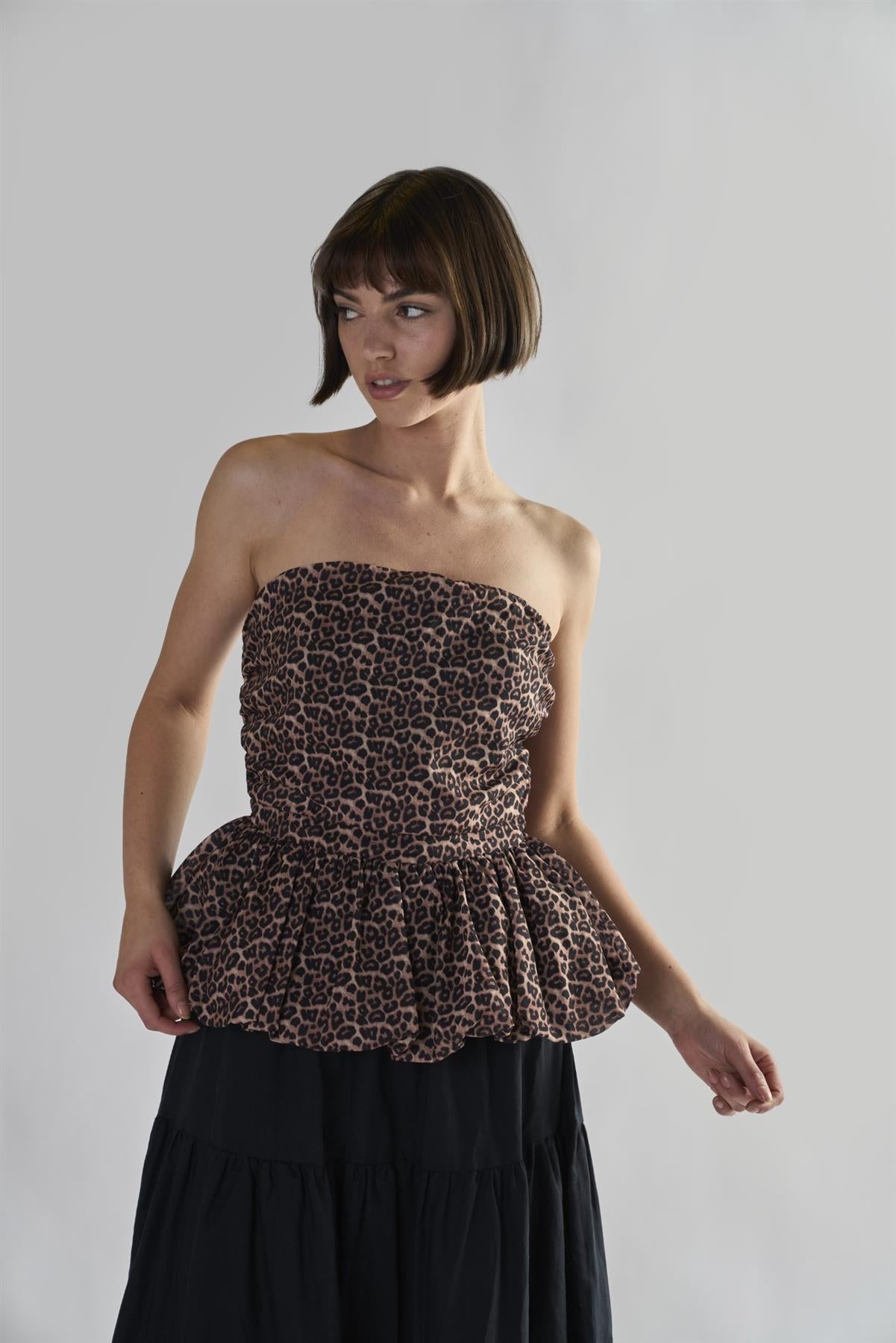 Glamorous Women's Leopard Ruffle Bandeau Crop-Top. This ruffle bandeau crop top is a playful and flirty addition to your wardrobe, perfect for those who love to add a touch of fun to their outfits. The bandeau style offers a sleek and modern look, while the ruffle bottom brings a dash of whimsy and movement. Its sleeveless design keeps you cool and comfortable, ideal for warm summer days or nights out on the town. The cropped length is perfect for pairing with high-waisted bottoms, creating a balanced and trendy silhouette. This top is versatile enough to dress up or down - team it with a flowing maxi skirt and sandals for a boho-chic look, or pair it with tailored trousers and heels for a more polished ensemble. The dark hue makes it easy to mix and match with various colours and patterns in your wardrobe. This piece is all about making a statement while keeping things effortless and comfortable. It's the kind of top that instantly adds a pop of personality to any outfit, helping you express your unique style with ease.