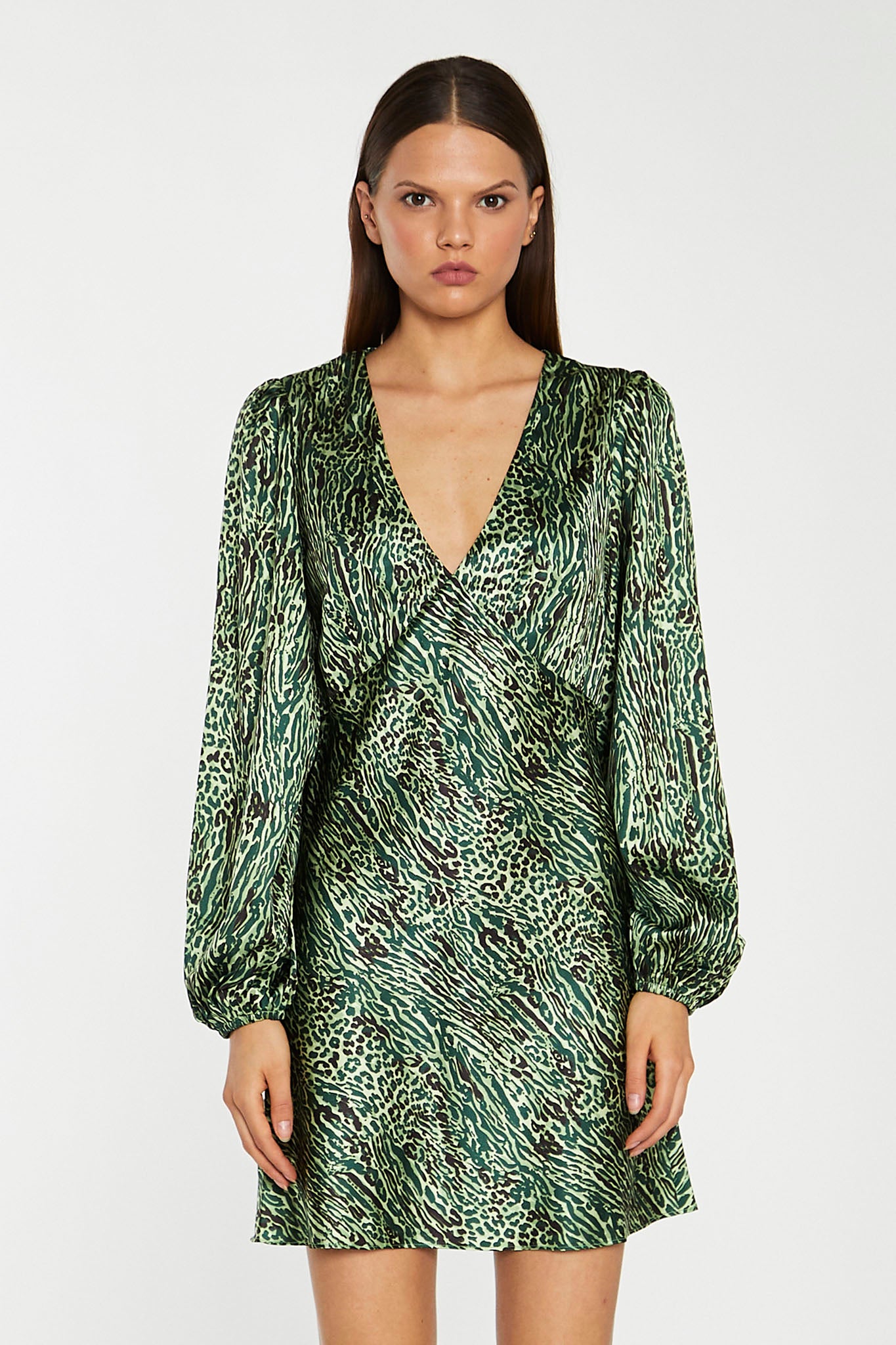 Glamorous Womens Green-Black Animal V-Neck Puff-Sleeve Mini-Dress. Show off your playful side with this animal print mini dress. Featuring a V-neck, long puff sleeves, and bias cut for a flattering fit, this mini-length dress will be sure to grab attention. Make a bold statement and flaunt your best features!