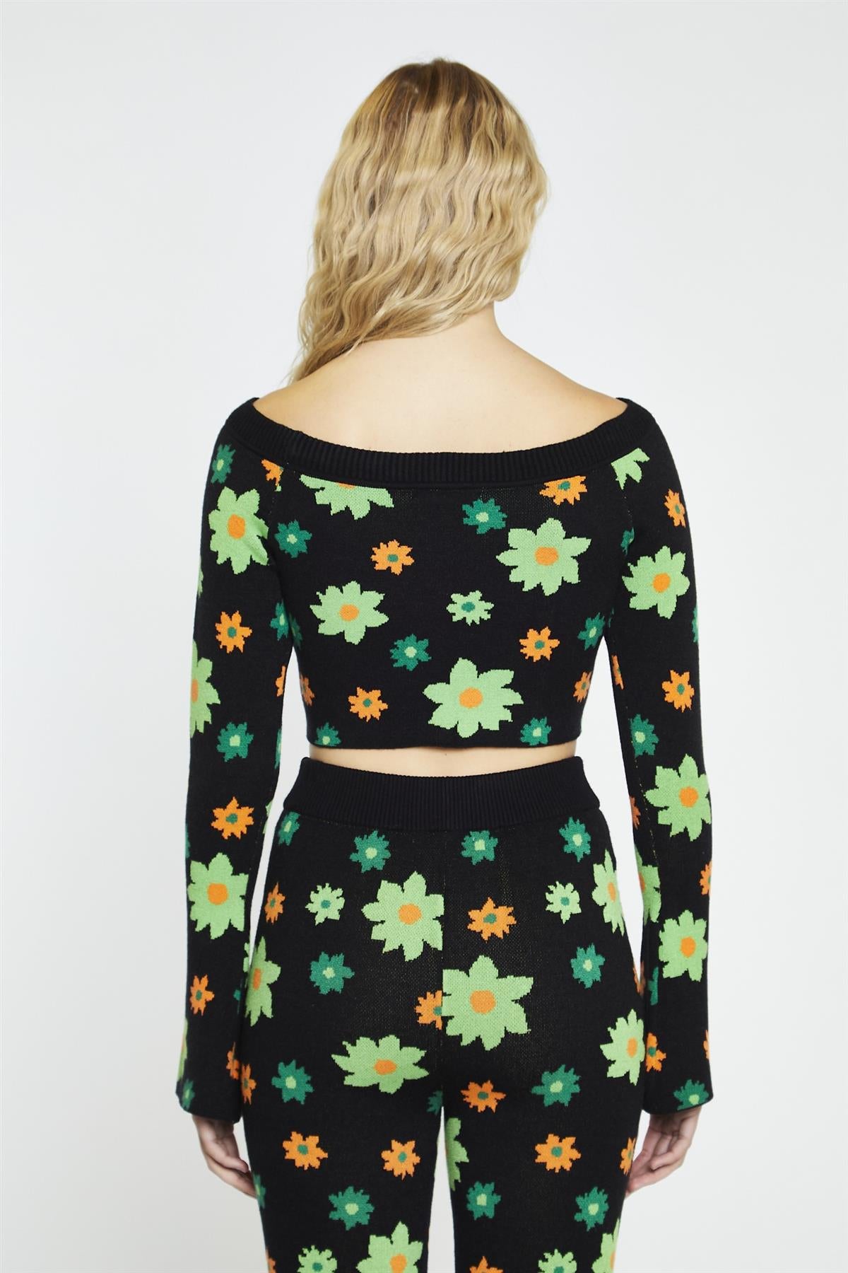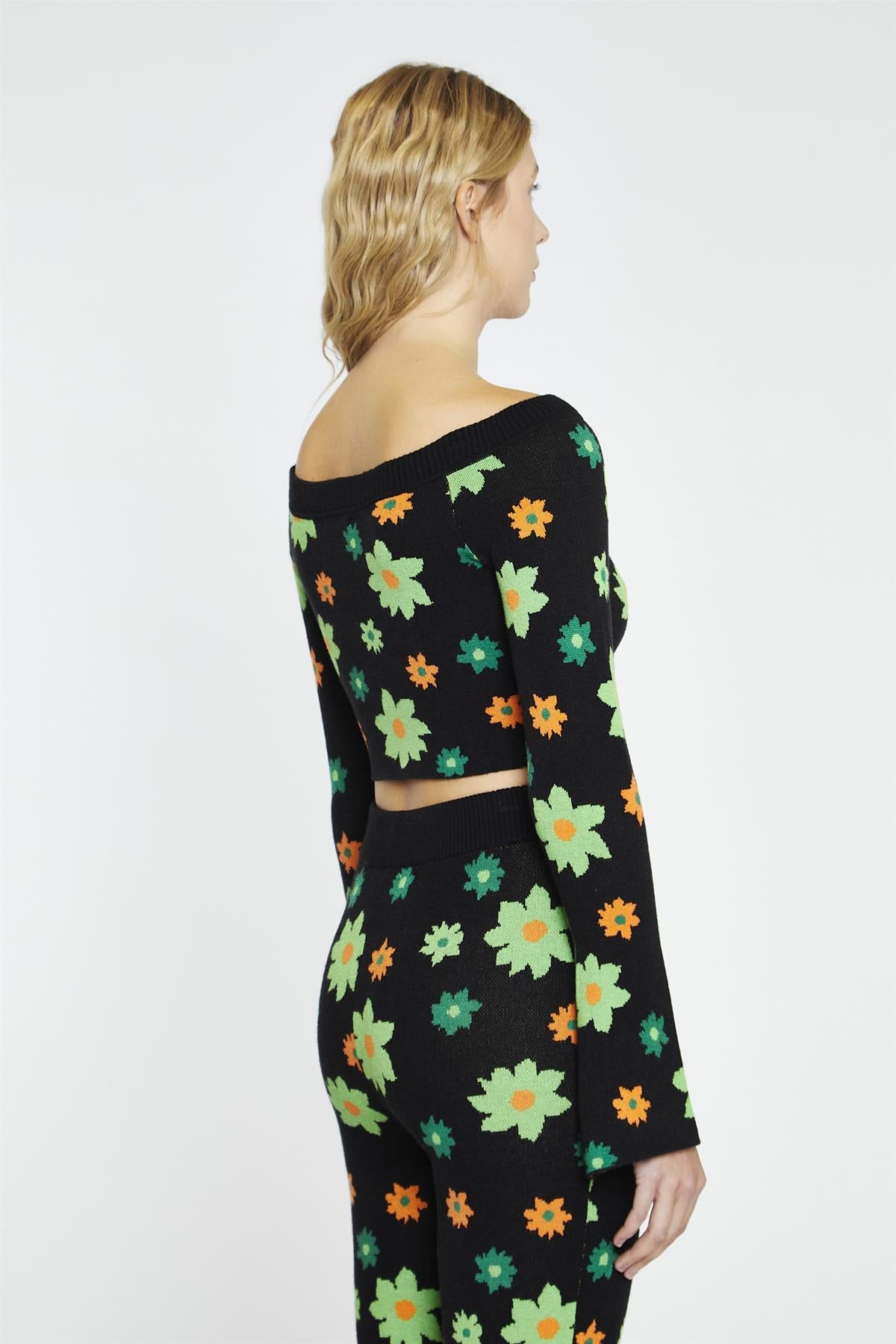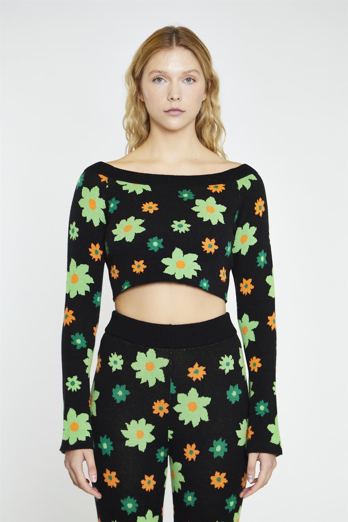 Green-Flower-Intarsia Long-Sleeve Crop-Top