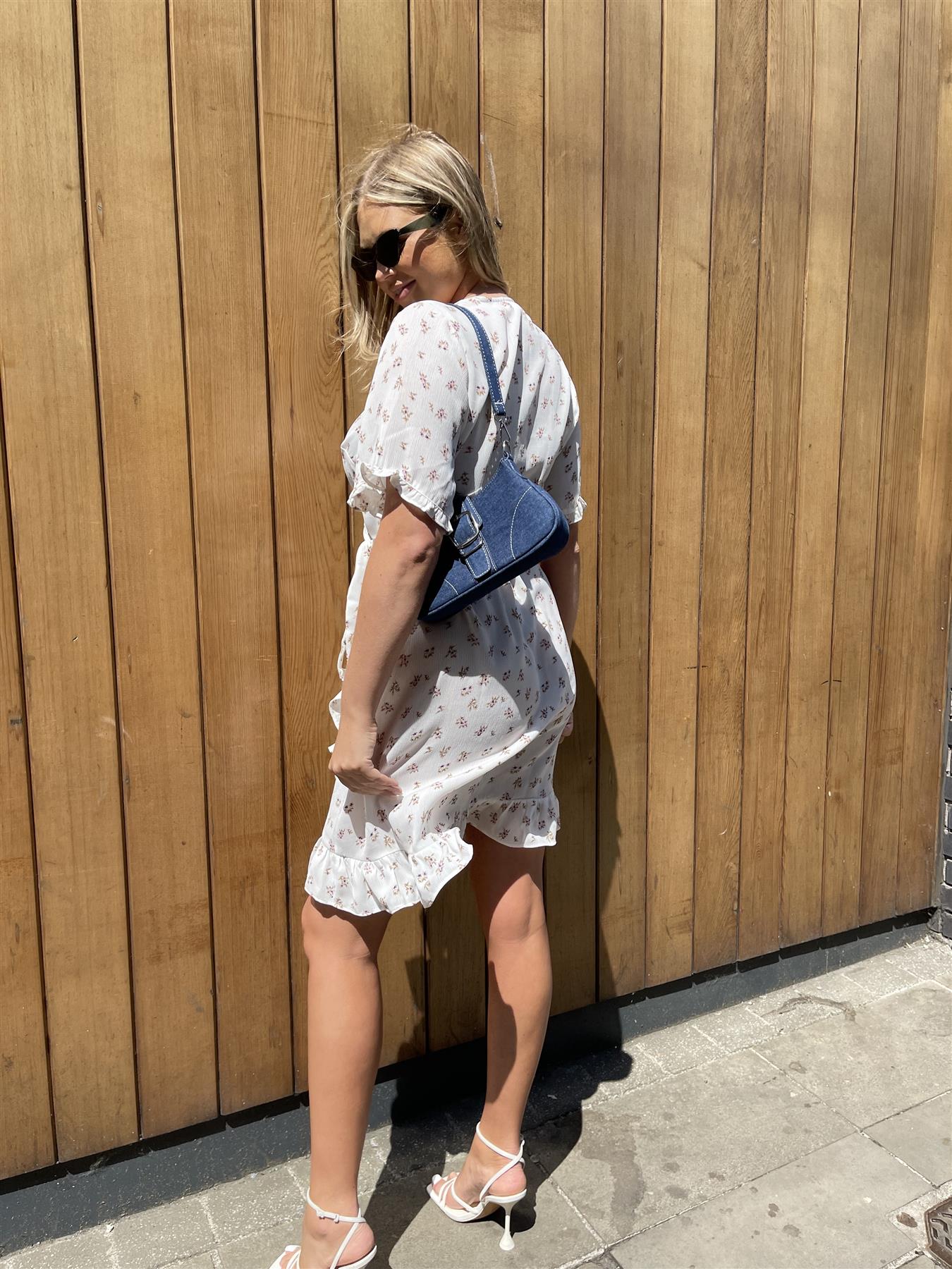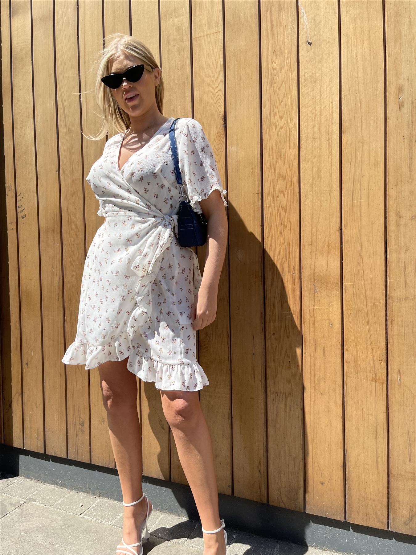 Glamorous Curve Women's Green-Pink Ditsy Wrap Ruffle Mini-Dress. Introducing the perfect addition to your summer wardrobe - the Green-Pink Ditsy Wrap Ruffle Mini-Dress! This dress features a classic wrap silhouette that flatters any body type, with a fun and flirty ruffle hem and sleeves. Its mini length is perfect for showing off your legs and keeping you cool in the heat. Don't miss out on this must-have piece!