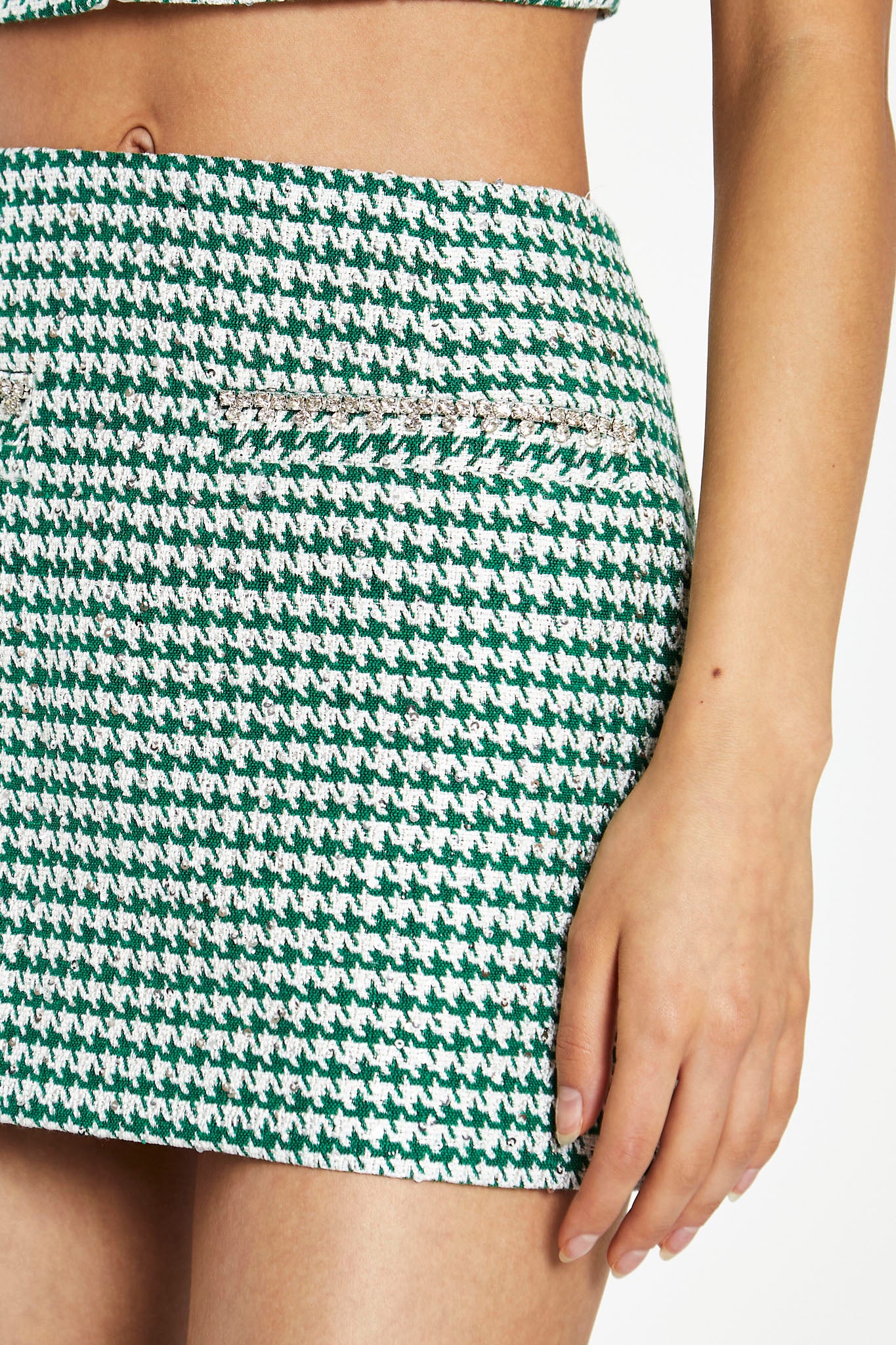 Glamorous Womens Green-White Houndstooth Diamante Trim Mini-Skirt. Slip into this stylish mini skirt and youll be ready to rock any special occasion! Its matching top and eye-catching diamante trim details are sure to turn heads, and at mini-length its a great way to show off your fashion-forward style!