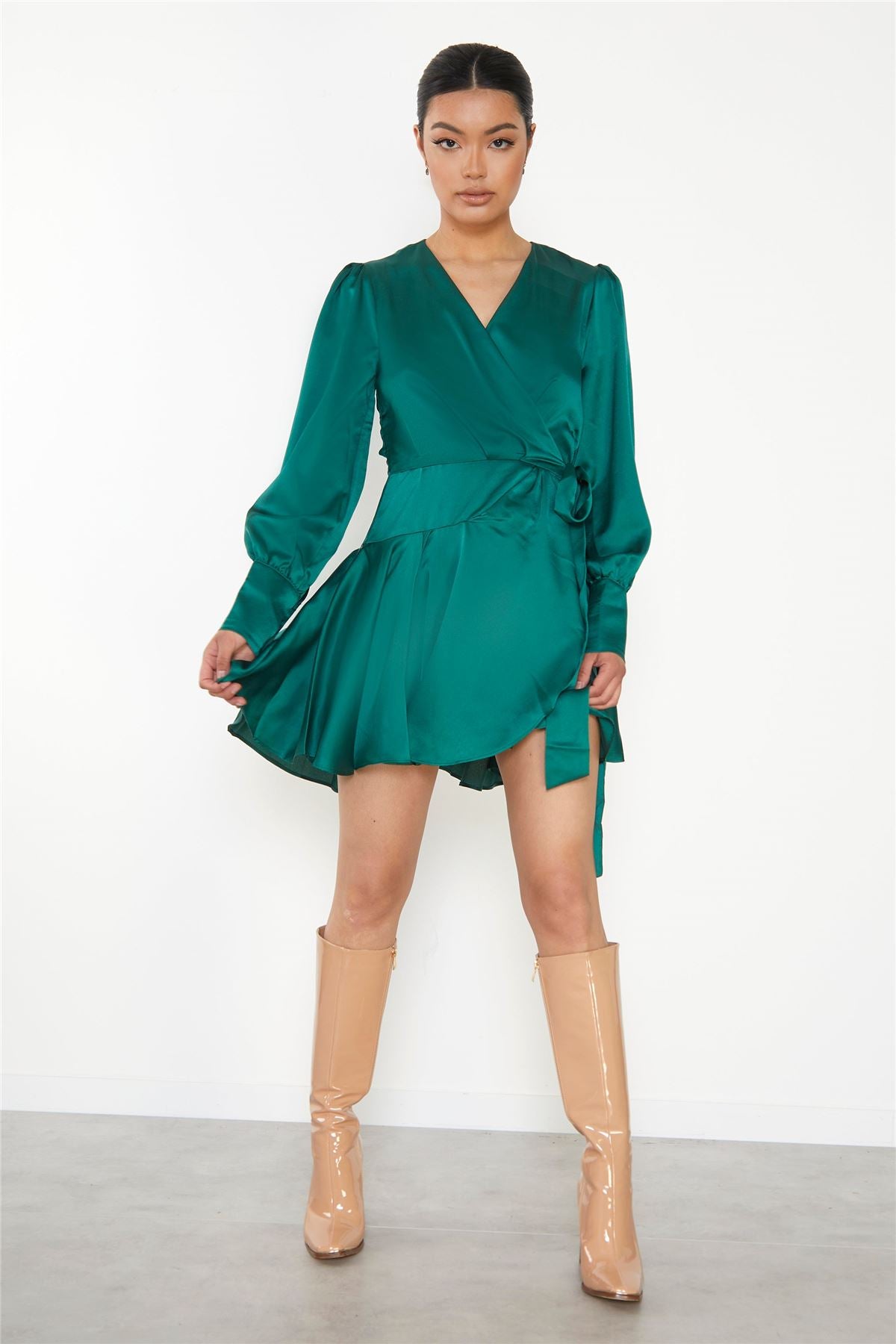 Glamorous Women's Green Wrap Mini-Dress. This Green Wrap Mini-Dress is a chic and stylish option for any fashionista. Crafted from luxurious satin fabric, the dress exudes an air of sophistication and elegance. The wrap-around silhouette is incredibly flattering, hugging the curves in all the right places. The long puff sleeves add a touch of drama and whimsy, creating a beautiful, romantic aesthetic. The mini length of this dress strikes the perfect balance between sophistication and playfulness. It's the ideal length for showing off the legs, making the wearer feel confident and stylish. Whether paired with heels for a night out or dressed down with flats for a more casual look, this Green Wrap Mini-Dress is a versatile piece that can be styled in countless ways.