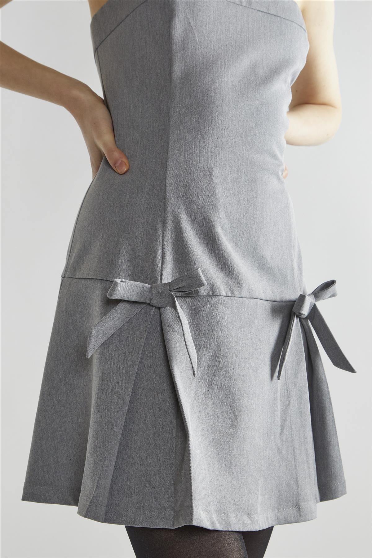 The Grey A-Line Bardot Mini-Dress is effortlessly flirty with a playful twist. The Bardot neckline and pleated skirt give it movement and charm, while subtle bow accents add personality. Pair with contrast tights and kitten heels for an elevated evening look.