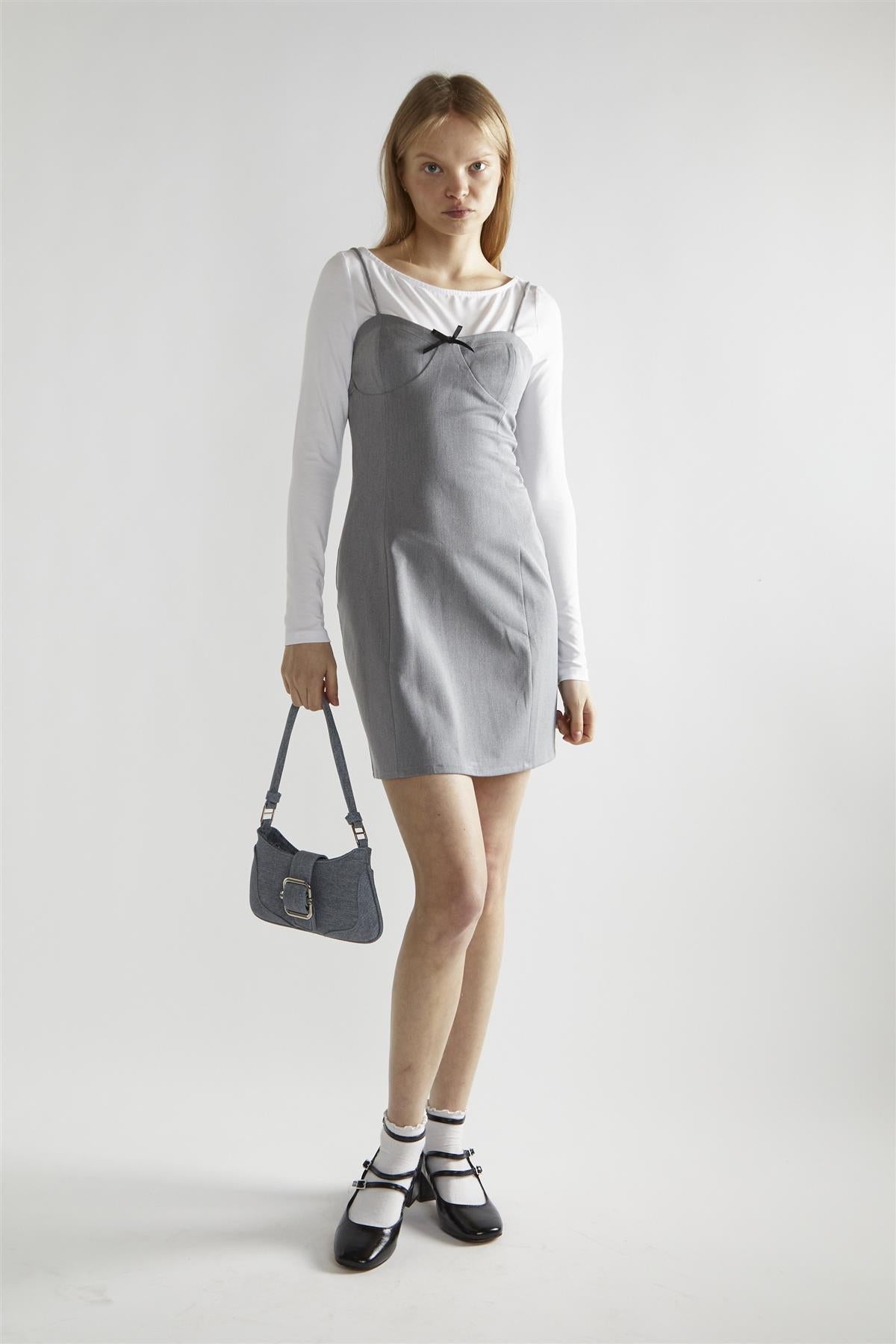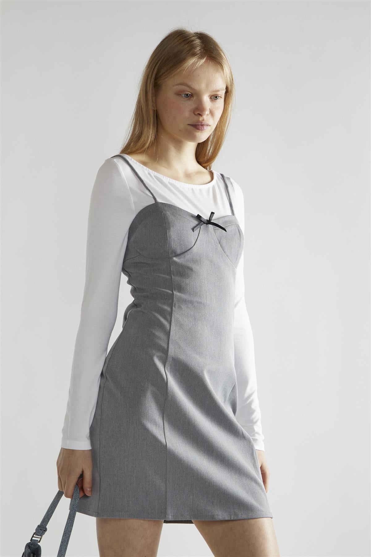 The Grey Round-Neck A-Line Mini Dress blends timeless simplicity with feminine chic. Flowy A-line lines and subtle cup detailing flatter your silhouette, while spaghetti straps keep it versatile for layering or wearing solo. Layer over a long sleeve top and mary-jane sandals for a playful look.