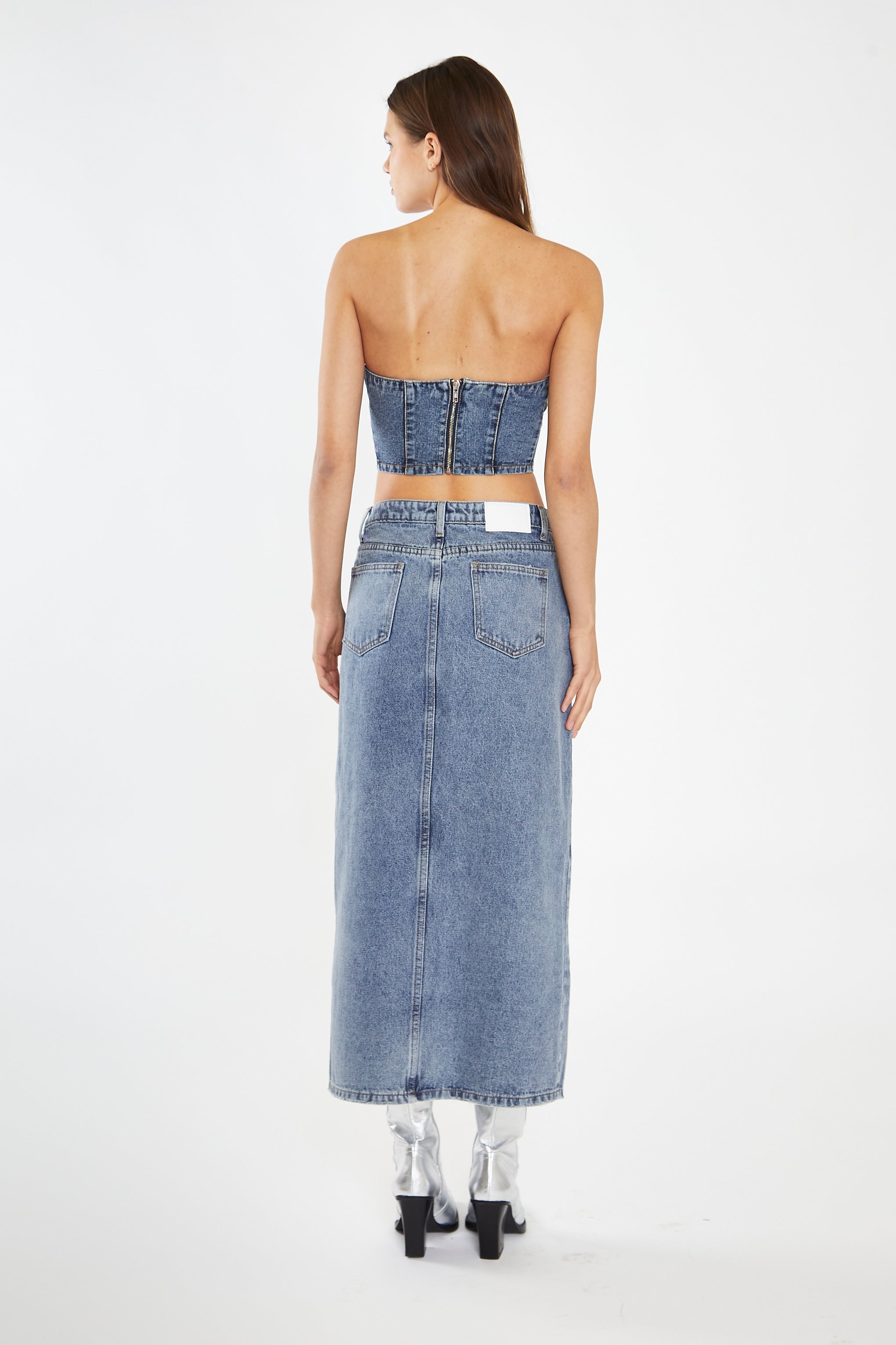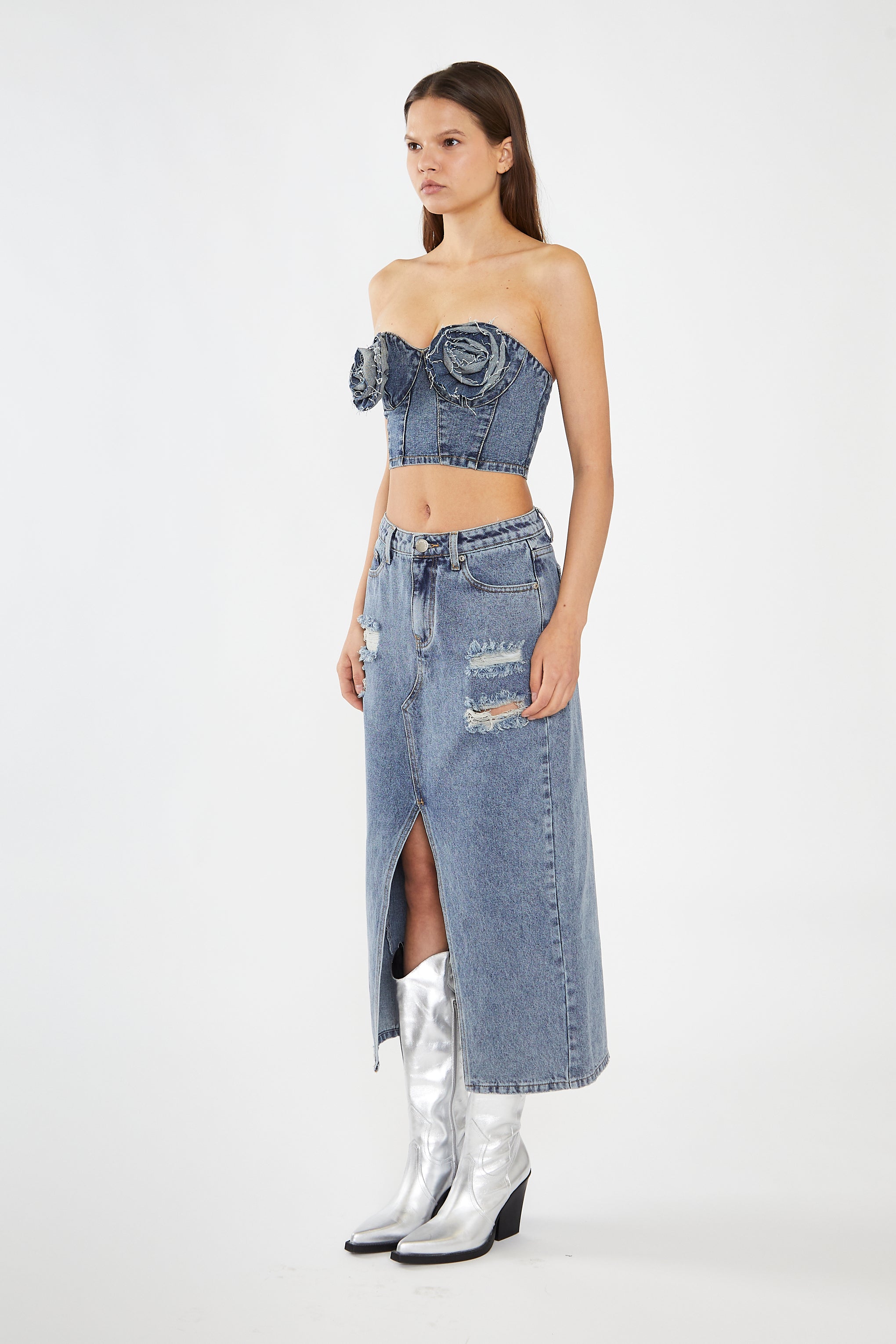 Glamorous Womens Heavy-Vintage Wash Front-Split Distressed Denim Midi-Skirt. Put a Retro twist on your wardrobe with this Heavy Vintage wash midi skirt. The front split adds edgy style, and the ripped finish adds a unique feel to the look. Pair with matching top and rock the look for your next night out!