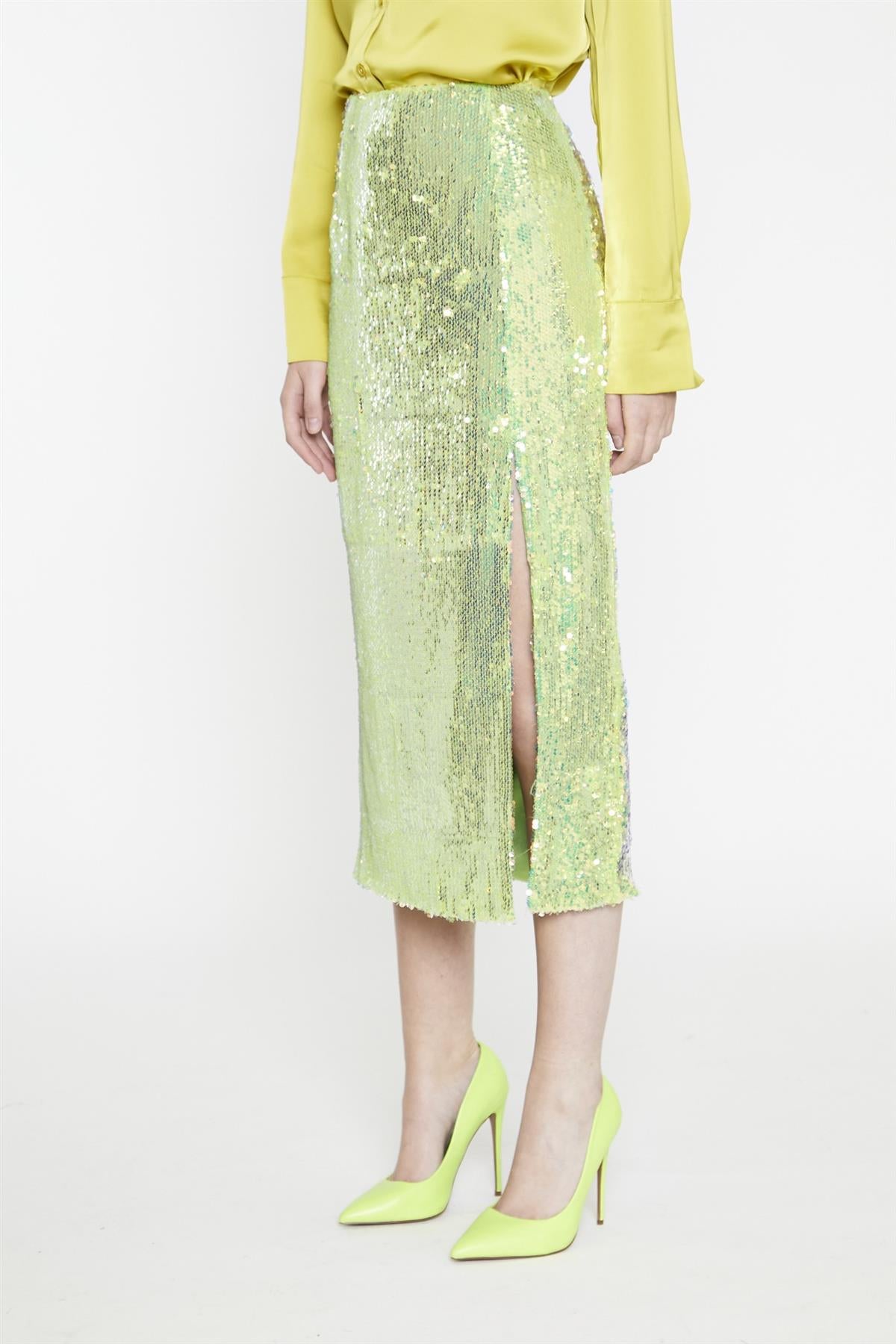Glamorous Women's Iridescent-Lime-Sequin Side-Split Midi-Skirt. This iridescent-lime sequin side-split midi skirt brings a fun, light-catching shimmer to your look, making even the simplest outfit feel a bit more playful. The pencil shape offers a sleek, flattering fit that hugs gently without feeling too tight, while the high-waisted cut gives you a smooth, easy silhouette. The side split adds just the right touch of movement, letting you walk comfortably while adding a little unexpected edge. Pair it with a simple cropped top or a soft knit tucked in for a relaxed yet sparkly vibe. It’s the kind of skirt that brings a bit of shine to your day and keeps things feeling light-hearted and fun.