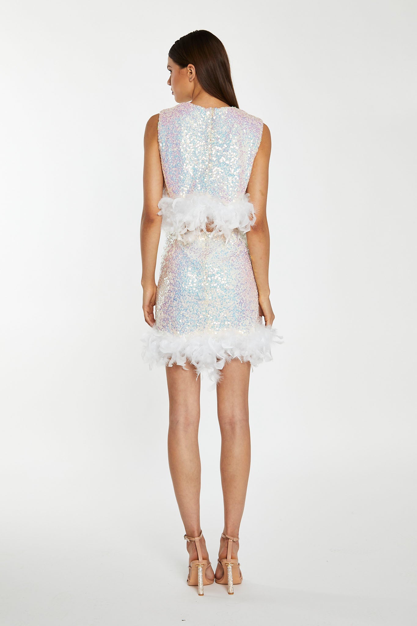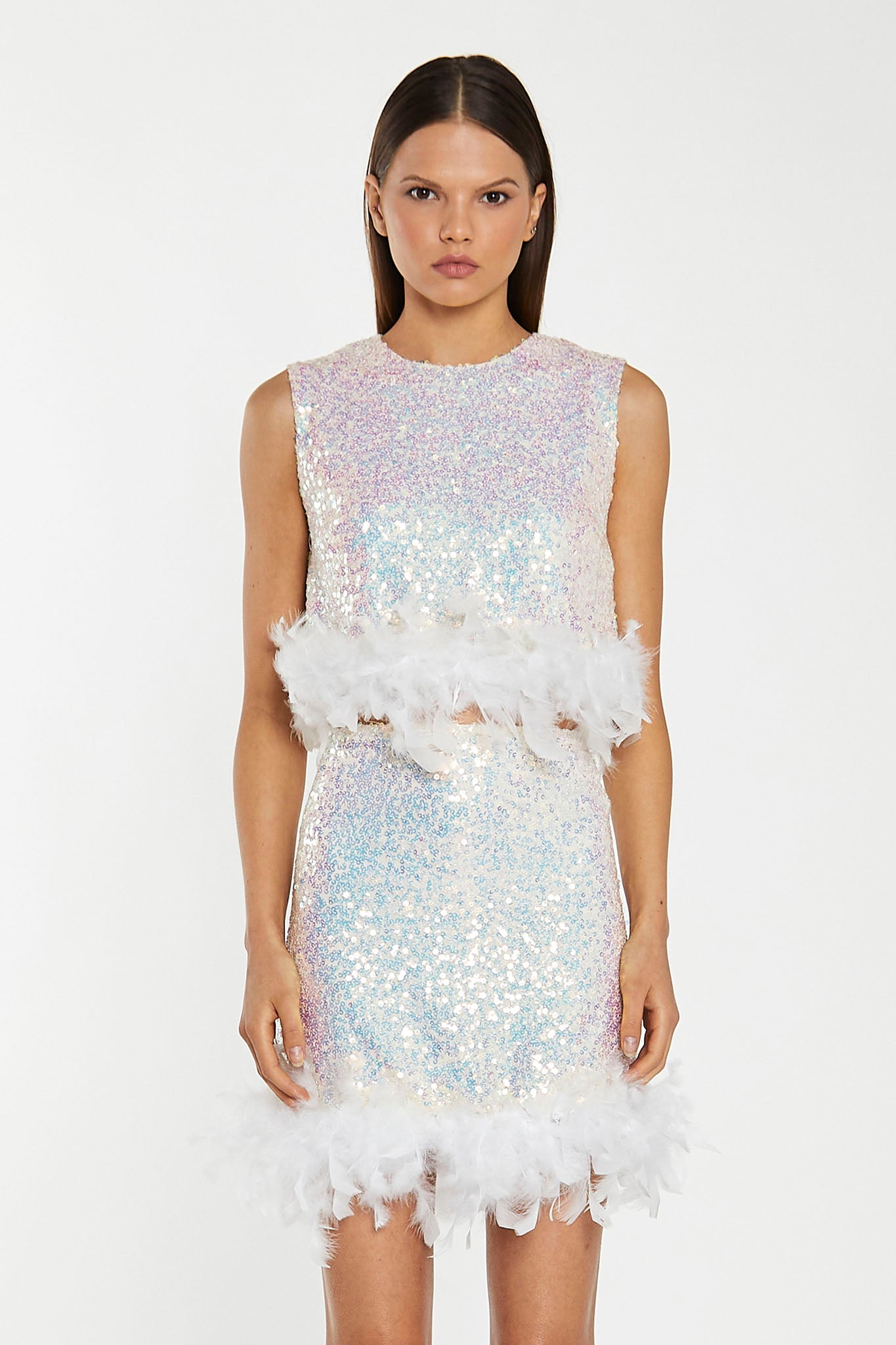 Glamorous Womens Iridescent-Sequin White Feather Trim Mini-Skirt. Be the life of the party in this mini skirt made to dazzle. With sparkling sequins and fluffy feather trim, all eyes will be on you. Plus, the matching top means you can mix and match to your hearts content!