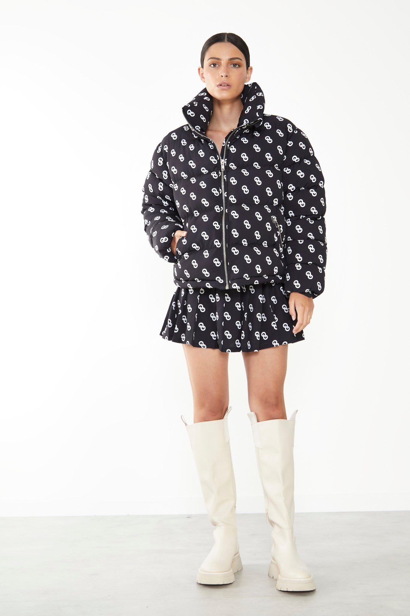 Glamorous Care Logo Print Padded Puffer Jacket. Looking for layers, this logo print padded puffer jacket is cute and cosy. Featuring an on trend logo print, a zip fastening, pockets and flattering fit this sustainable jacket is perfect for you. Pair with some knee high boots for the ultimate look.