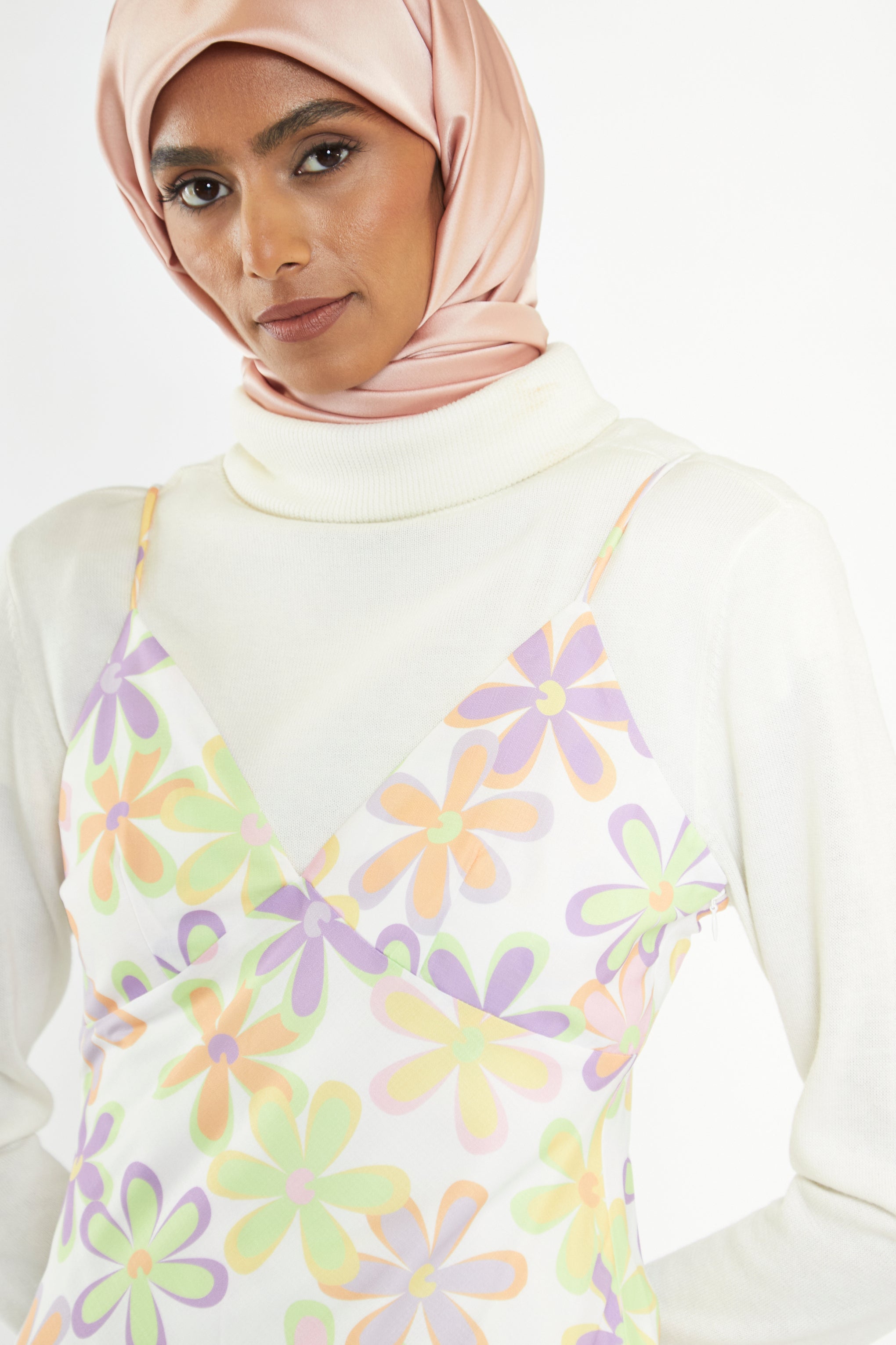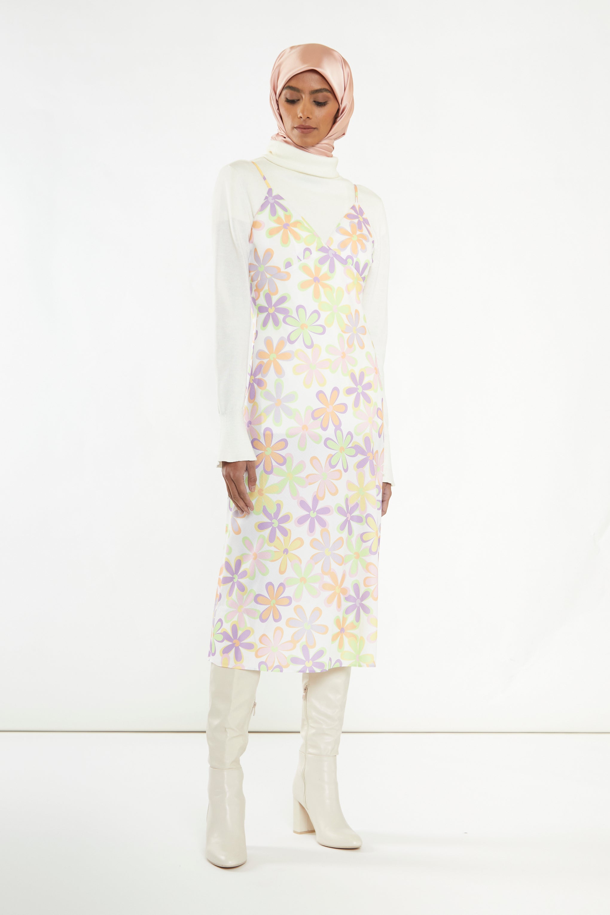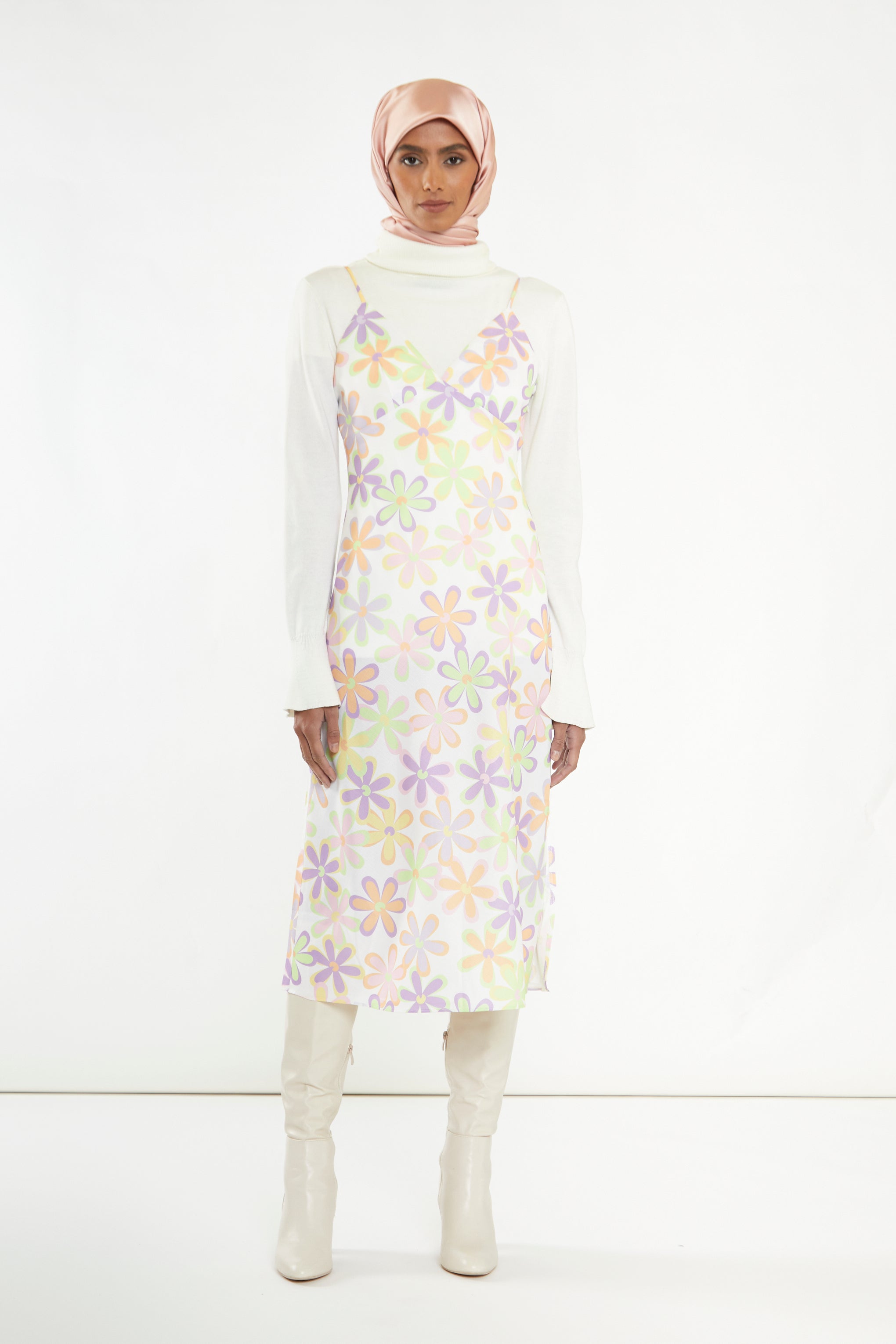Glamorous Care Womens Pastel 60s Floral Side-Split Cami Style Midi-dress. Look chic and feel good in this amazing V-Neck Cami Style Midi Dress with Side Split and Bias Cut made from recycled Polyester. Dance the night away and make an entrance with sustainable fashion thats kind to your wallet and the planet!