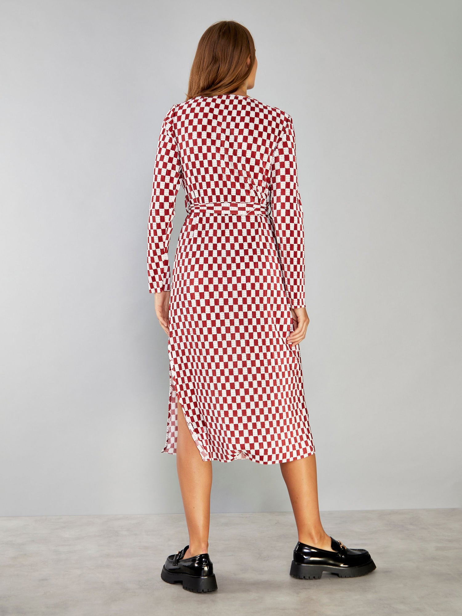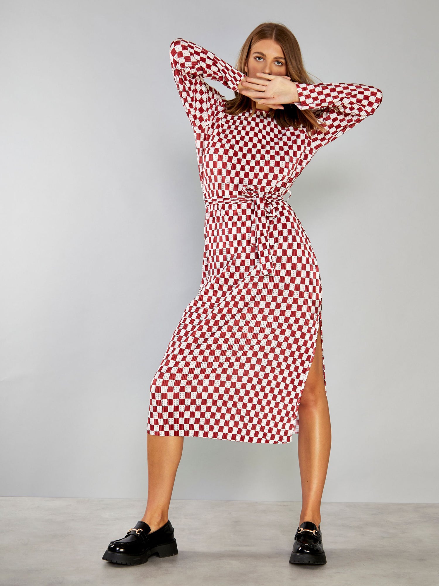 Glamorous Womens Dark Red Check Plisse Side Split Tie Waist Midi Dress. This super on trend midi dress is the must have staple piece this season. Featuring a simplistic midi style, tie waist and side split detail, this dress is super flattering addition to your closet this Autumn! Style with some chunky trainers for a fun daytime fit, or elevate the look with some strappy heels and a shoulder bag for the perfect date night vibe.