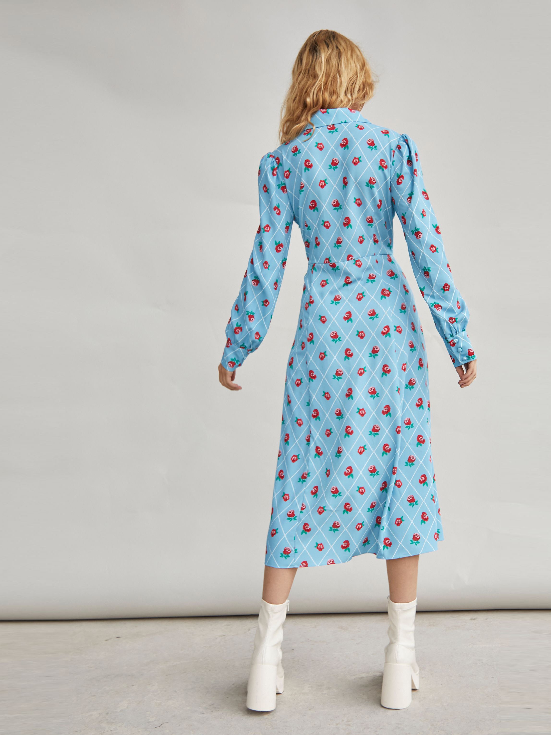 Glamorous Womens Rose Trellis Split Front Collar Midi Dress. Opt for an on trend piece with this floral midi dress. This super flattering dress features collar detail and split front, and flattering fit. Style with high knee boots for the daytimes and heels for the evening!