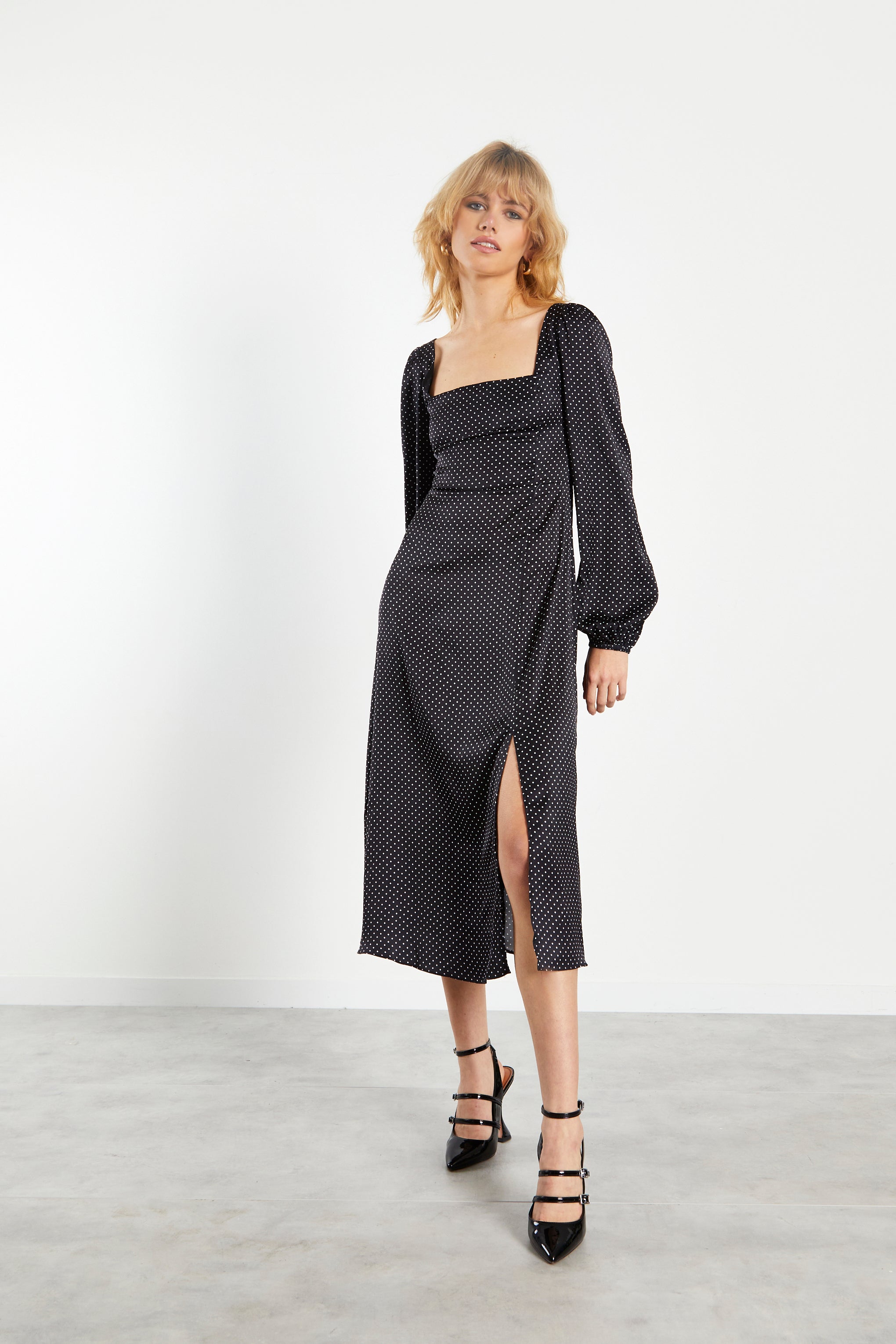 Glamorous Black White Spot Side Split Midi Dress. Fashion forward and chic, we love this midi dress here at Glamorous. Featuring long sleeves and side split detail in a classic black white spot print, you wont regret adding this piece to your wardrobe. Pair with some strappy heels to create a show stopping look.