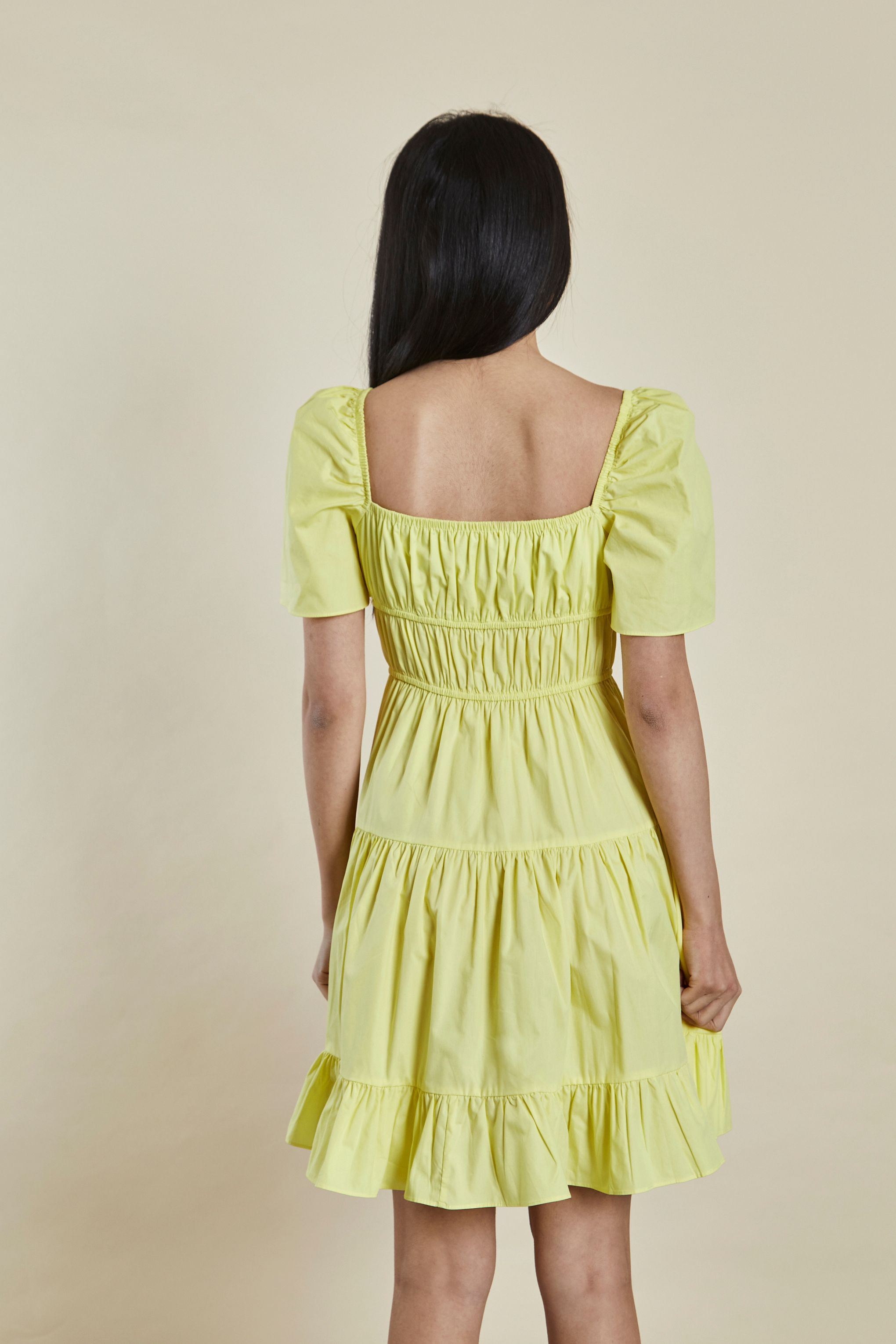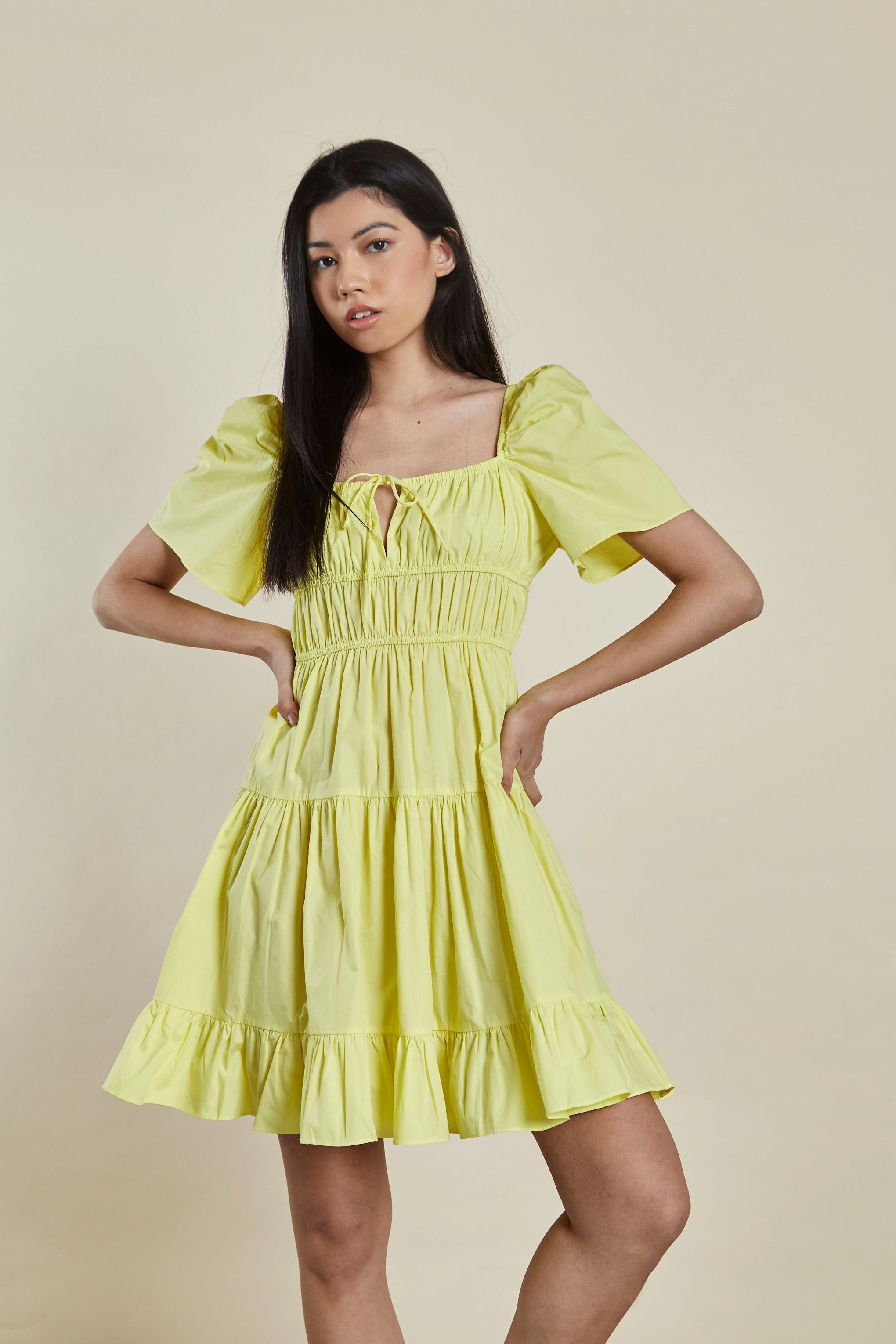 Glamorous Womens Yellow Puff Shoulder Frill Tie Front Mini Dress. This super on trend mini dress is the must have staple piece this season. Featuring a square neck style and ruffle finish, this dress is super flattering addition to your closet! Style with your favourite sandals for the daytime and switch to heels for the evening.