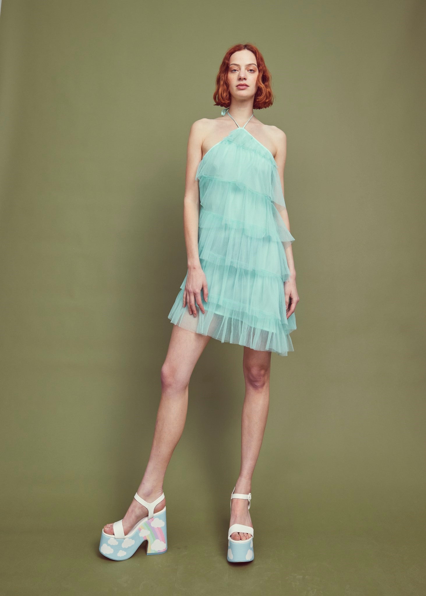 Turquoise Pleated Tulle Halterneck Mini-dress