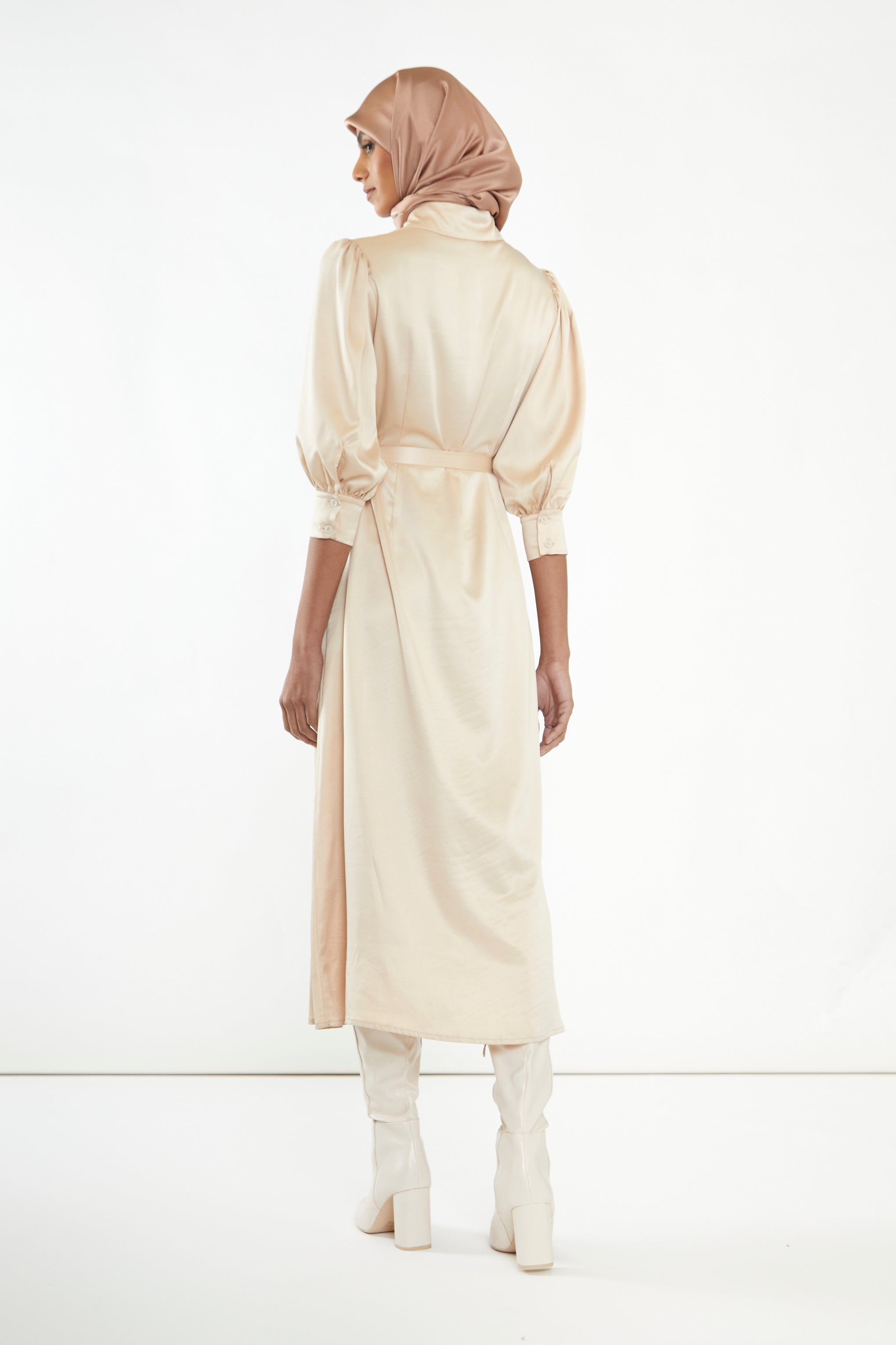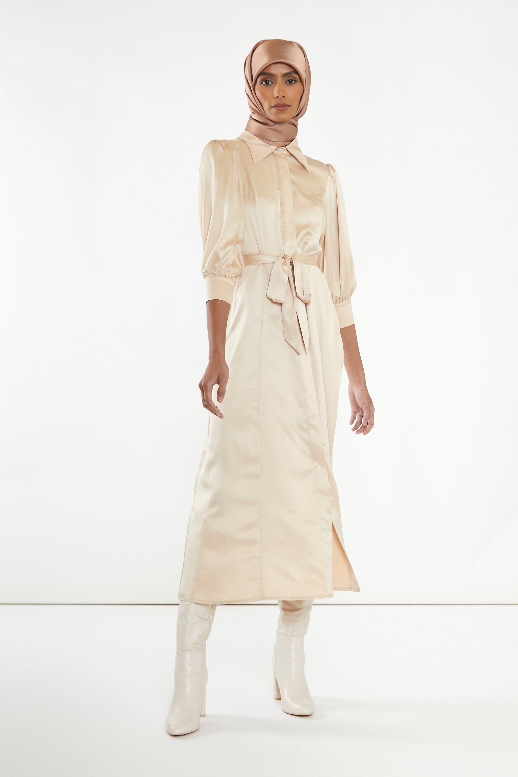 Glamorous Studio Womens Sand Satin Midaxi Shirt Dress. This shirt dress featuring puff sleeves and a waist tie, in a gorgeous Sand Satin fabric is a style worth having in your wardrobe. Pair with some strappy heels to create a show stopping look.