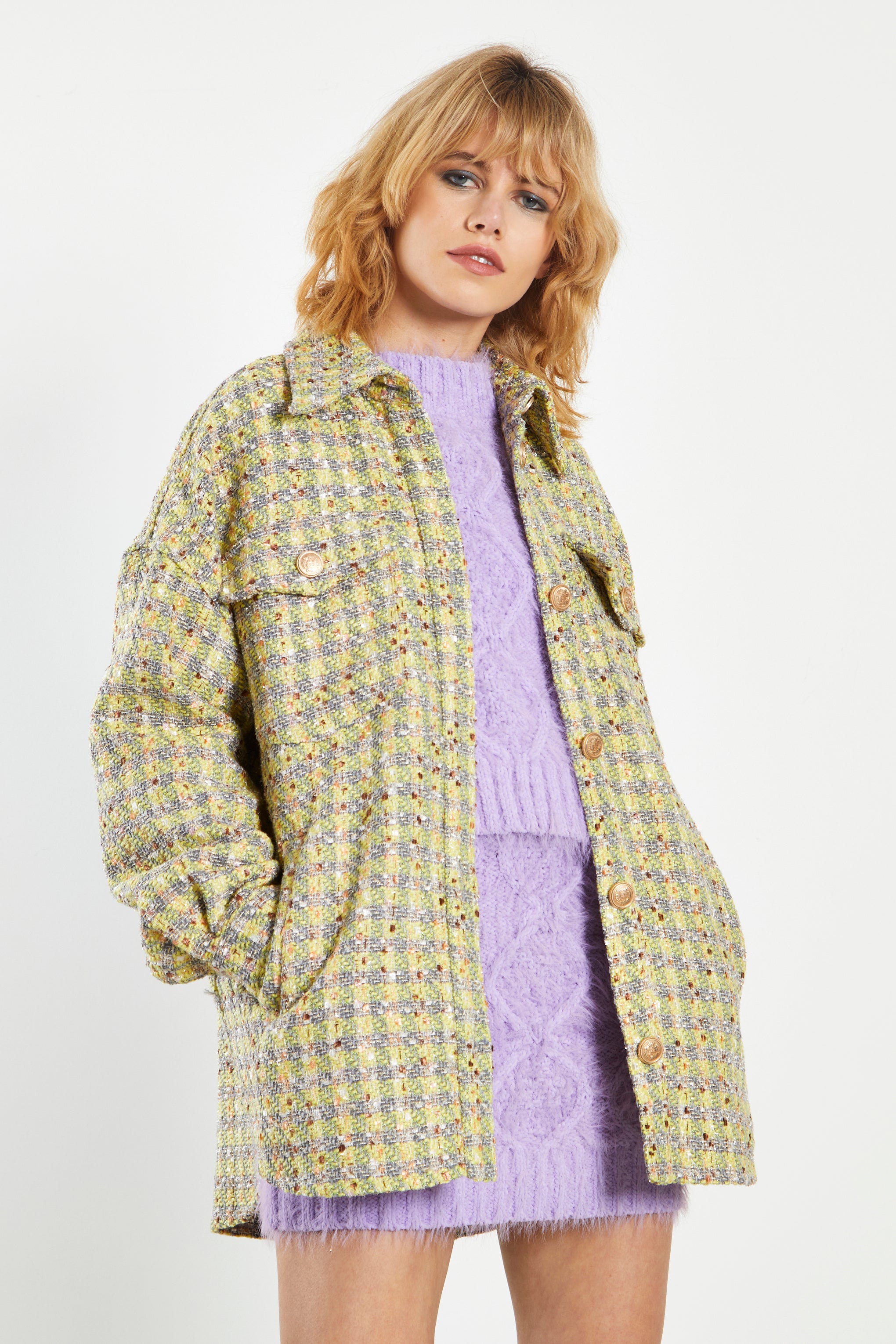 Glamorous Yellow Grey Check Tweed Oversized Shacket. A wardrobe must have, this shacket is so on trend this season. Featuring an oversized shirt fit, in a gorgeous tweed fabric, this stylish piece can be dressed up or down, perfect for any occasion.