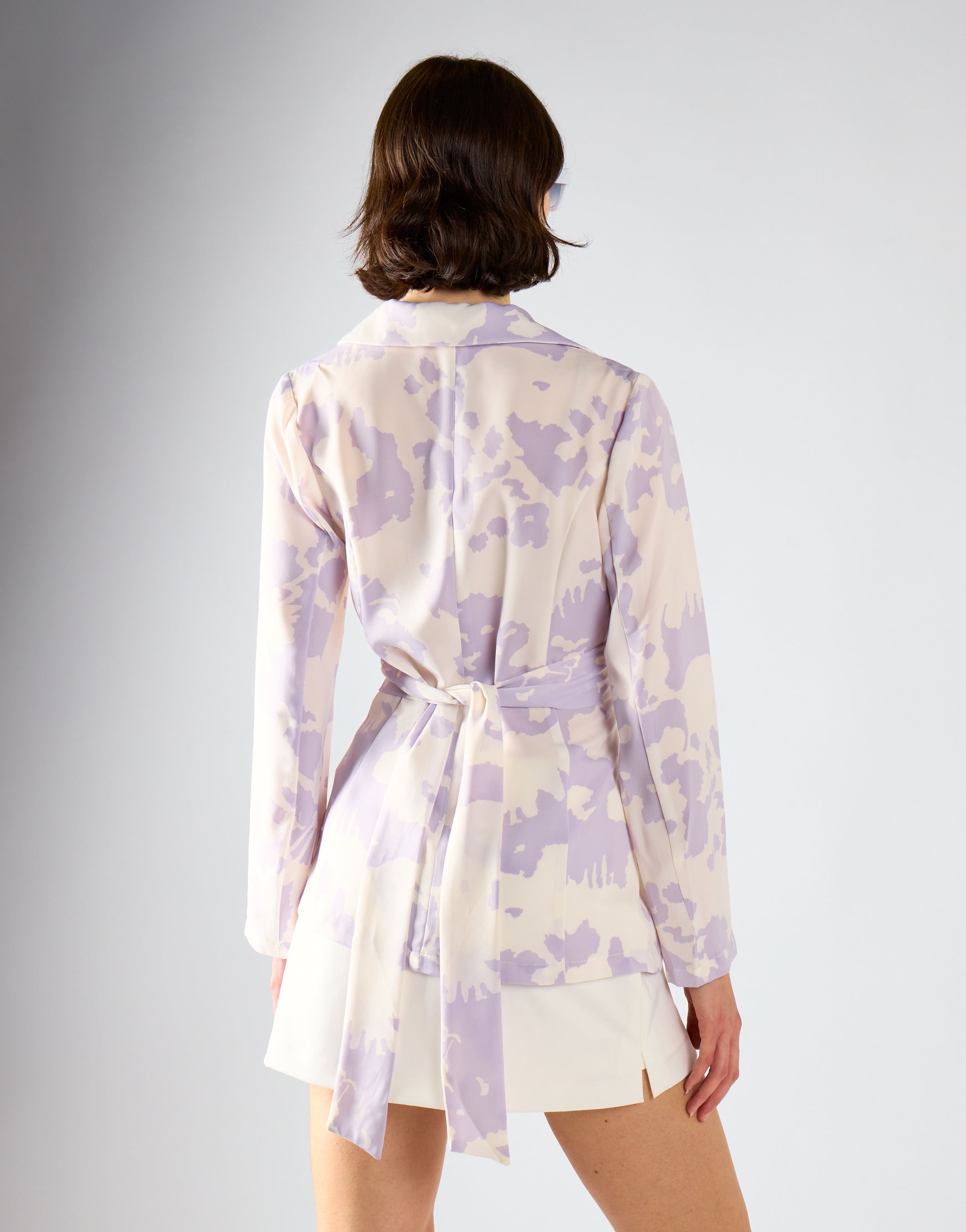 Glamorous Women's Misty Lilac Abstract Tie Waist Blazer Jacket. This gorgeous jacket will look great in your wardrobe this season. Featuring a on trend pattern and a flattering cut, we here at Glamorous love this piece! Style with matching co-ord misty lilac wide leg trousers to complete your fashion forward look.