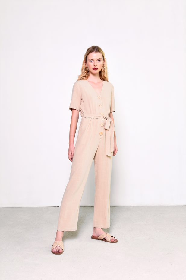 Glamorous V-Neck Button Up Jumpsuit in Light Stone. This staple piece is a must have for your summer wardrobe. Featuring a flattering V-Neck style, tie belt and statement buttons, this jumpsuit will be your best-friend this summer season. Pair with strappy sandals for a effortlessly chic look.