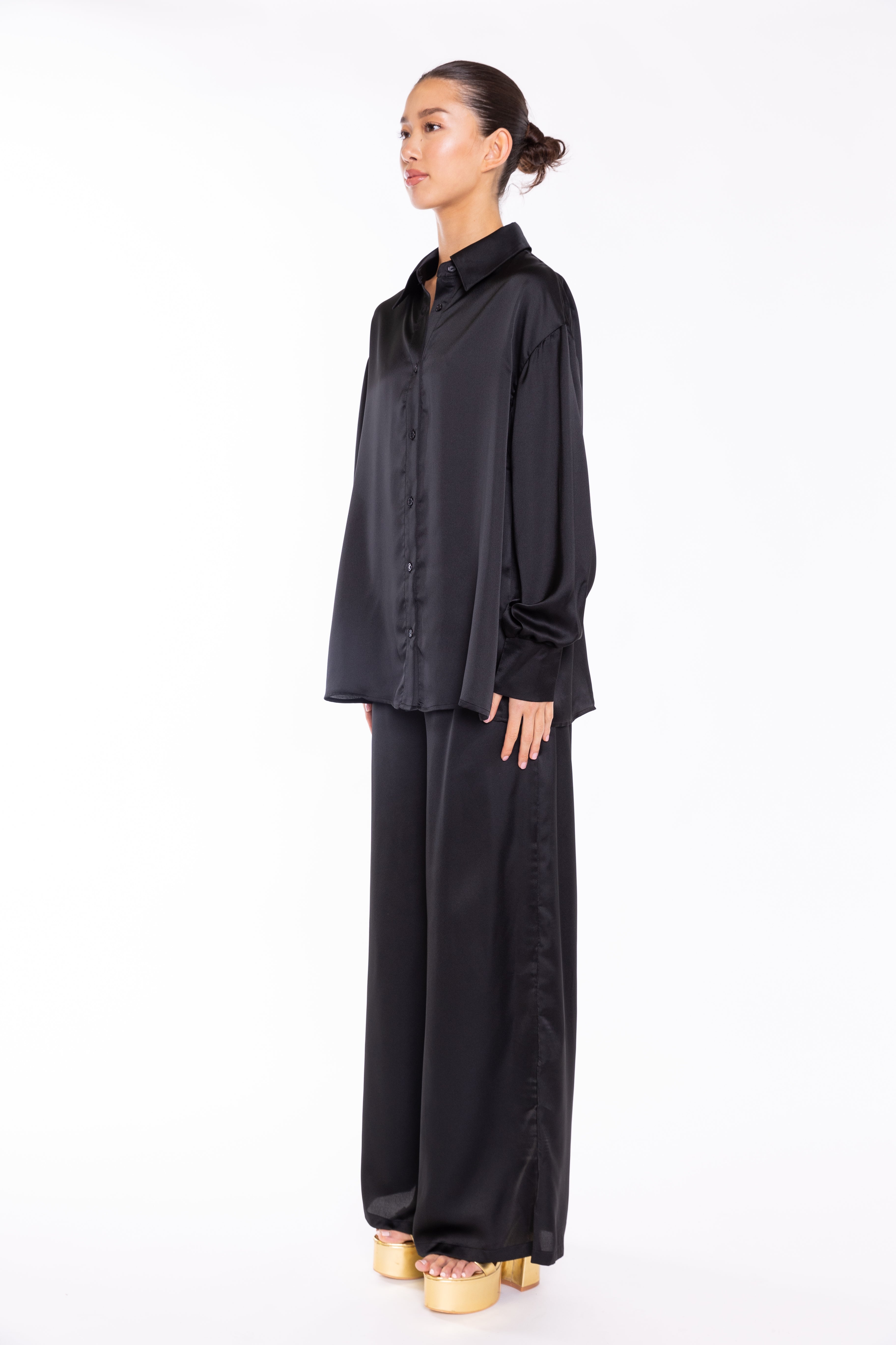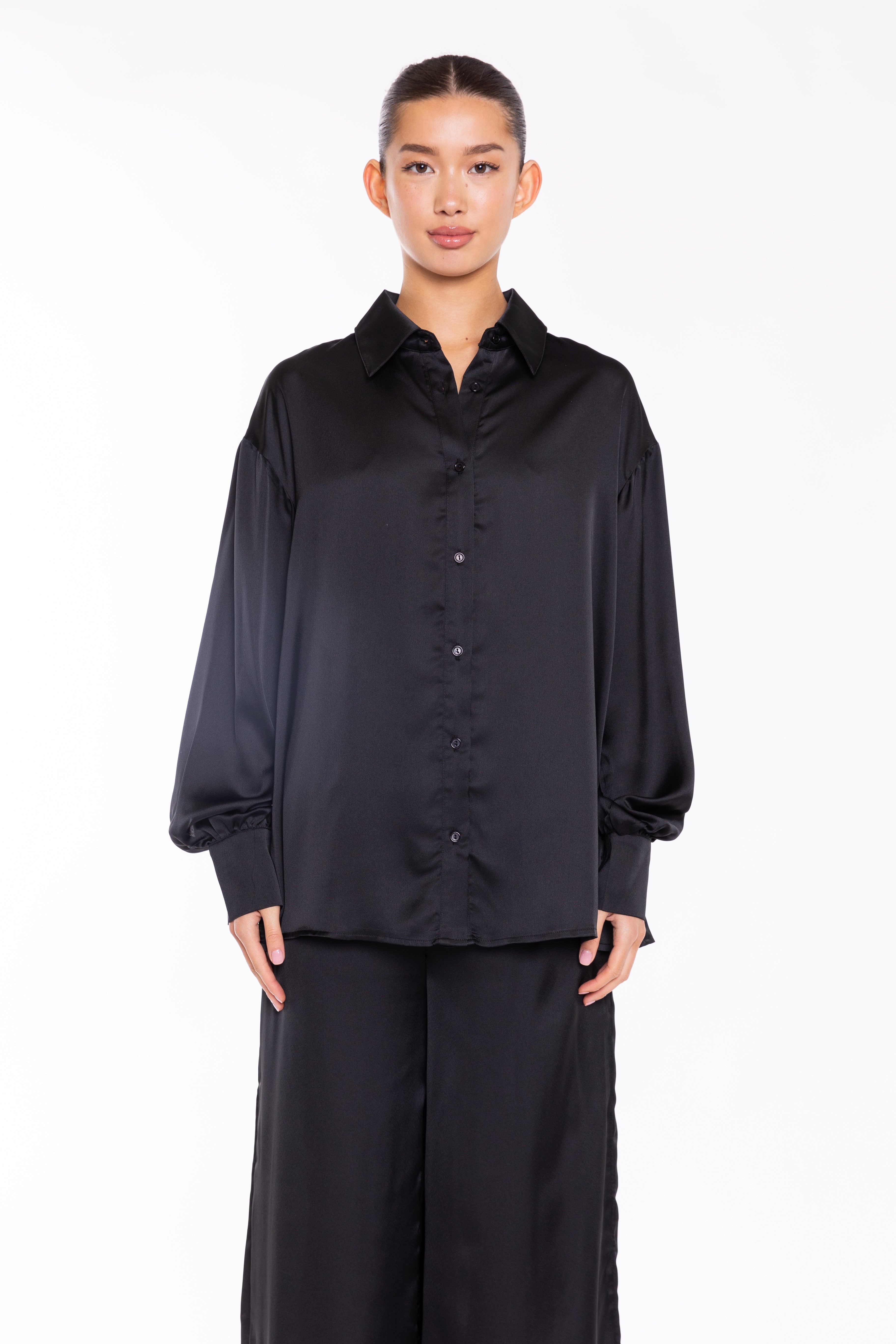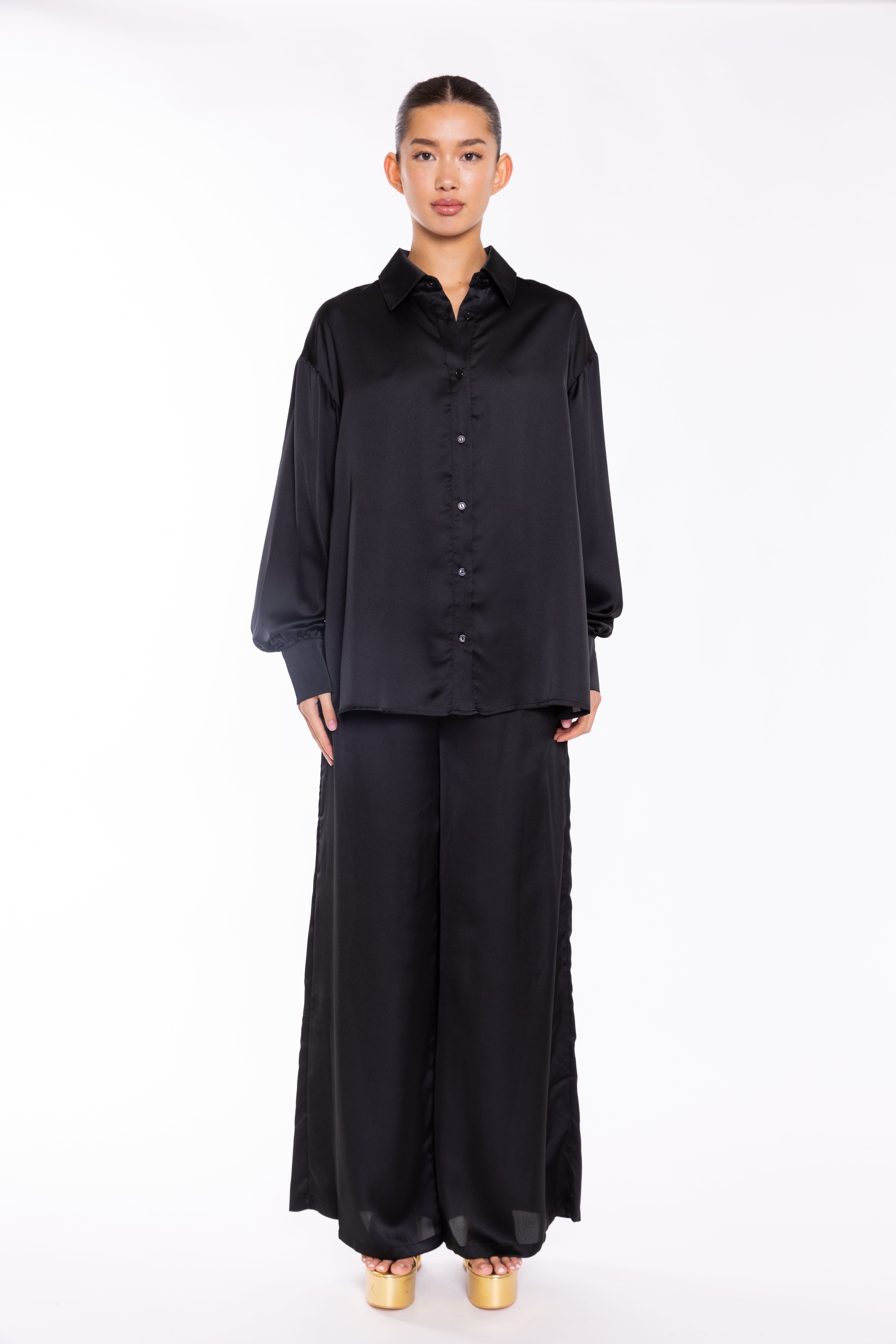 Glamorous Black Long Sleeve Shirt. This luxe Satin-finish shirt will have you feeling and looking your best. Featuring long sleeves and button-front detail, this timeless piece will be your go-to for every occasion. Highly versatile and easy to wear, looks great teamed with jeans for relaxed daytimes or dress up with heels and matching co-ord Black Wide Leg Trousers for evenings.