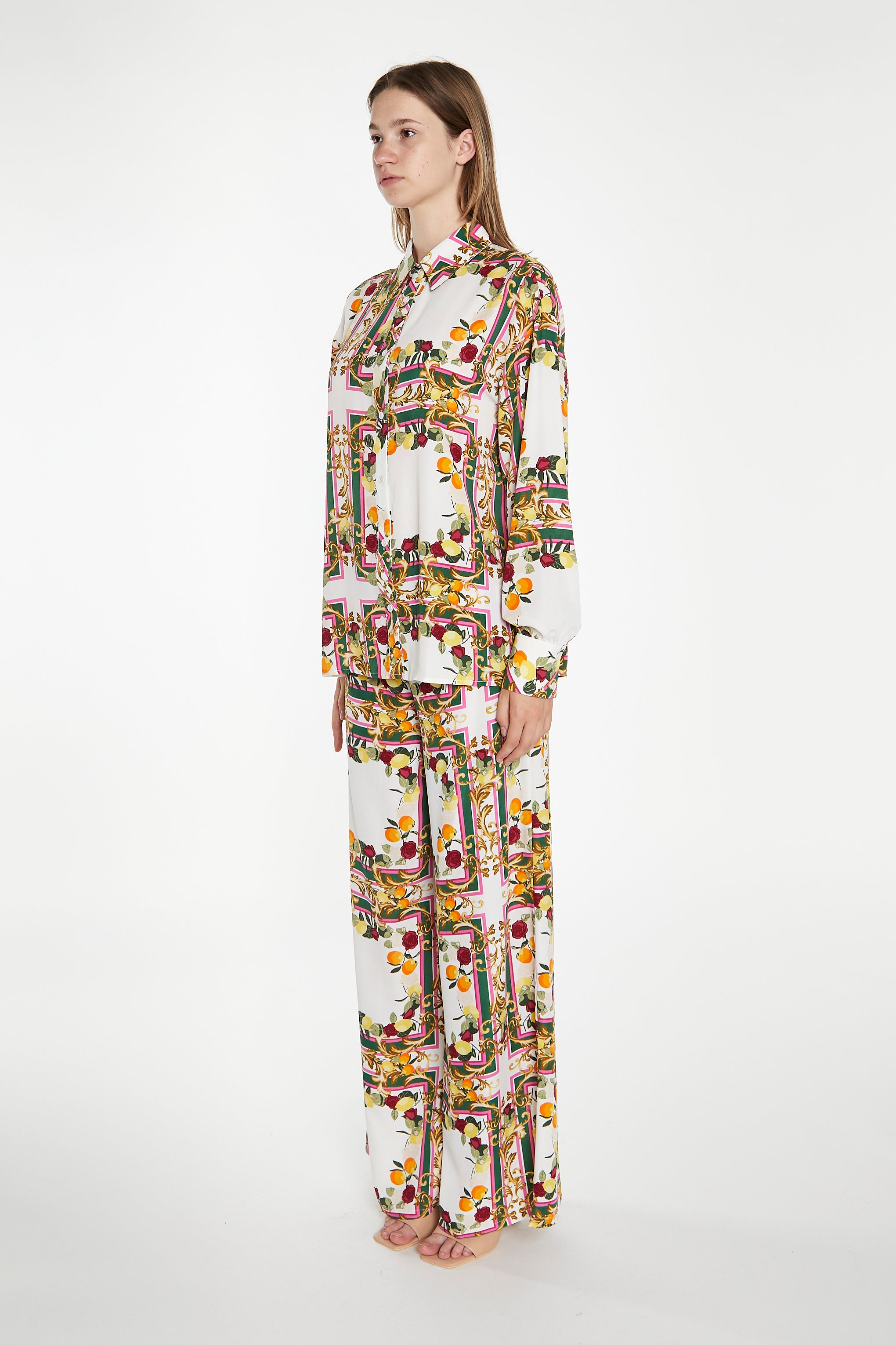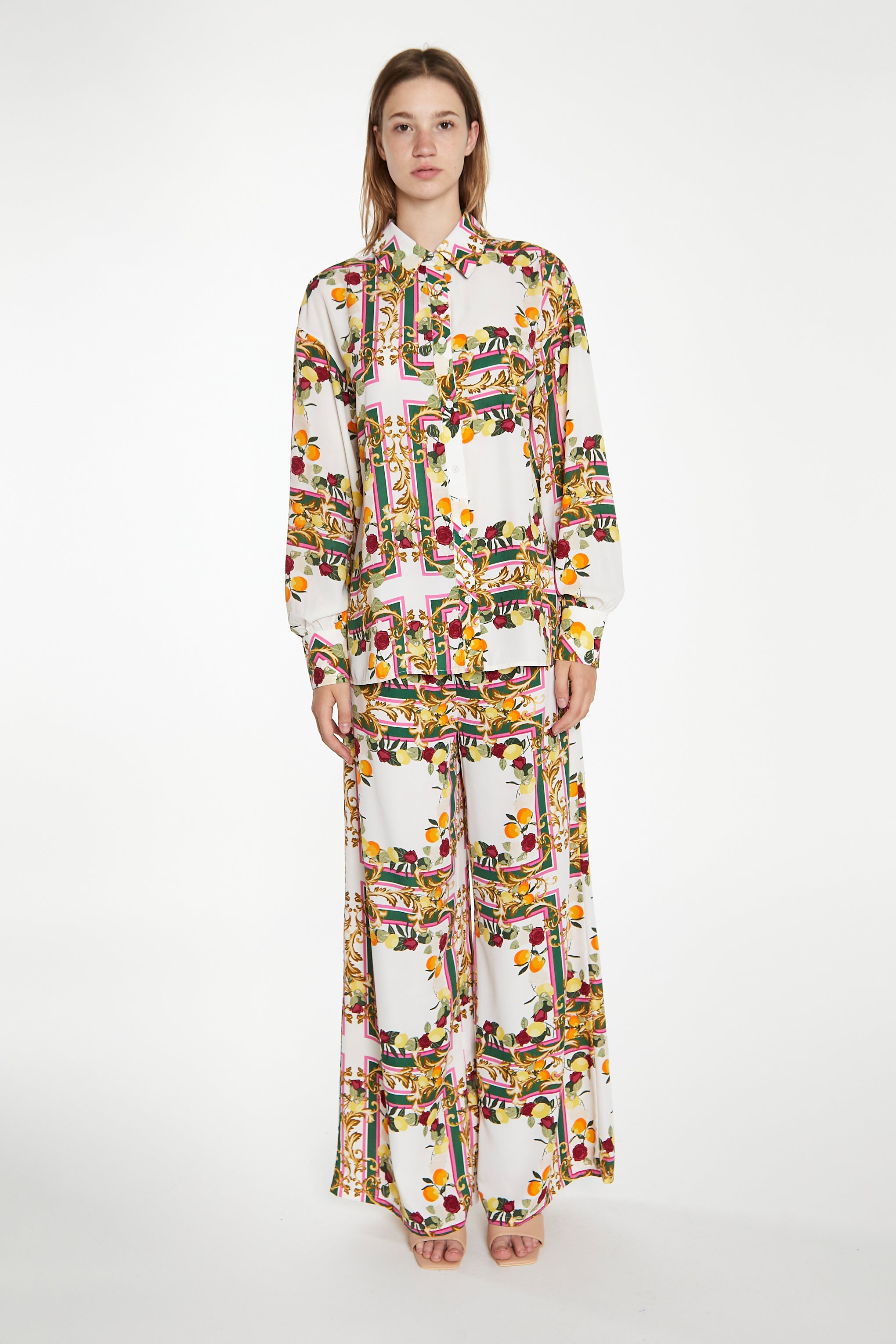 Glamorous Womens Citrus Scarf Print Wide Leg Trousers. These floaty wide leg trousers are a must-have summer wardrobe staple. Featuring a flattering wide-leg fit, these trousers will be your best-friend this season. Looks great styled with the matching Citrus Scarf Print Long Sleeve Shirt to make a statement or teamed with a cute cami and sandals for relaxed daytimes.