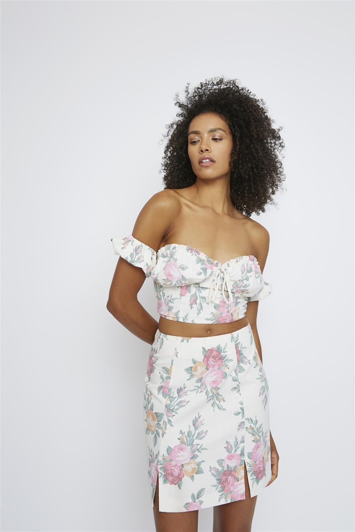 Glamorous Women's Large-Rose-Print Off-Shoulder Crop-Top. This off-shoulder crop top brings a playful twist to florals with its bold rose print and soft ruffle trim that gives just the right amount of charm. The front tie detail adds a sweet accent while also letting you adjust for comfort, and the shirred back keeps everything feeling snug without being too tight. It’s the kind of piece that works just as well for a casual afternoon as it does for a warm evening dinner. Pair it with the matching skirt for an easy-going set that still feels pulled together, or mix it up with your favourite high-waisted denim to keep things relaxed. This top doesn’t try too hard—it's confident in its easygoing vibe.