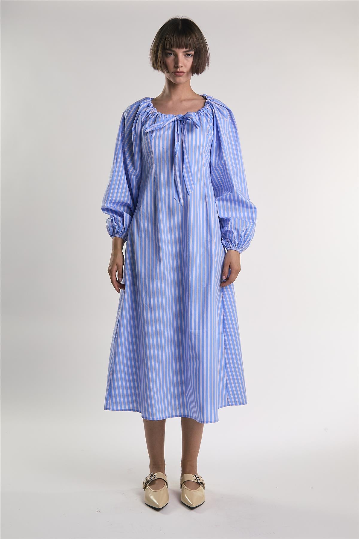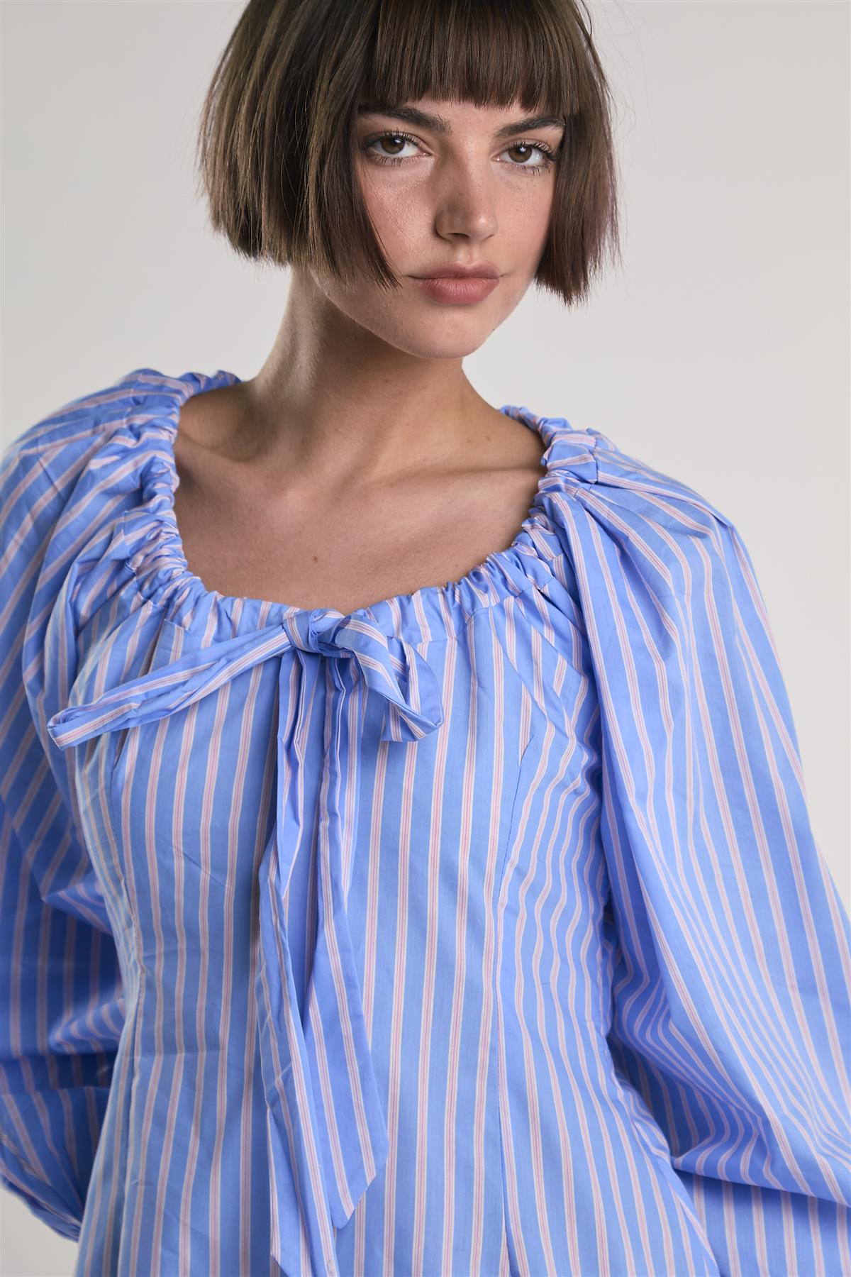 Glamorous Women's Light-Blue-Pink-Stripe Gathered-Neck Midi-Dress. This midi dress brings a breezy, cheerful vibe to your day with its gathered neckline finished off with a sweet bow, adding a playful touch that feels just right for any occasion. The fitted bodice gives a flattering shape without feeling restrictive, while the long puff sleeves add a dash of drama and keep things feeling light and comfortable. Falling to a midi length, this dress is easy to pair with sandals for a casual stroll or dressier shoes for a special outing. The soft stripes keep the look fresh and lively, making it a fun choice when you want something that feels both easy and a little bit special. This dress is all about making you feel good, with thoughtful details that let your style shine through.