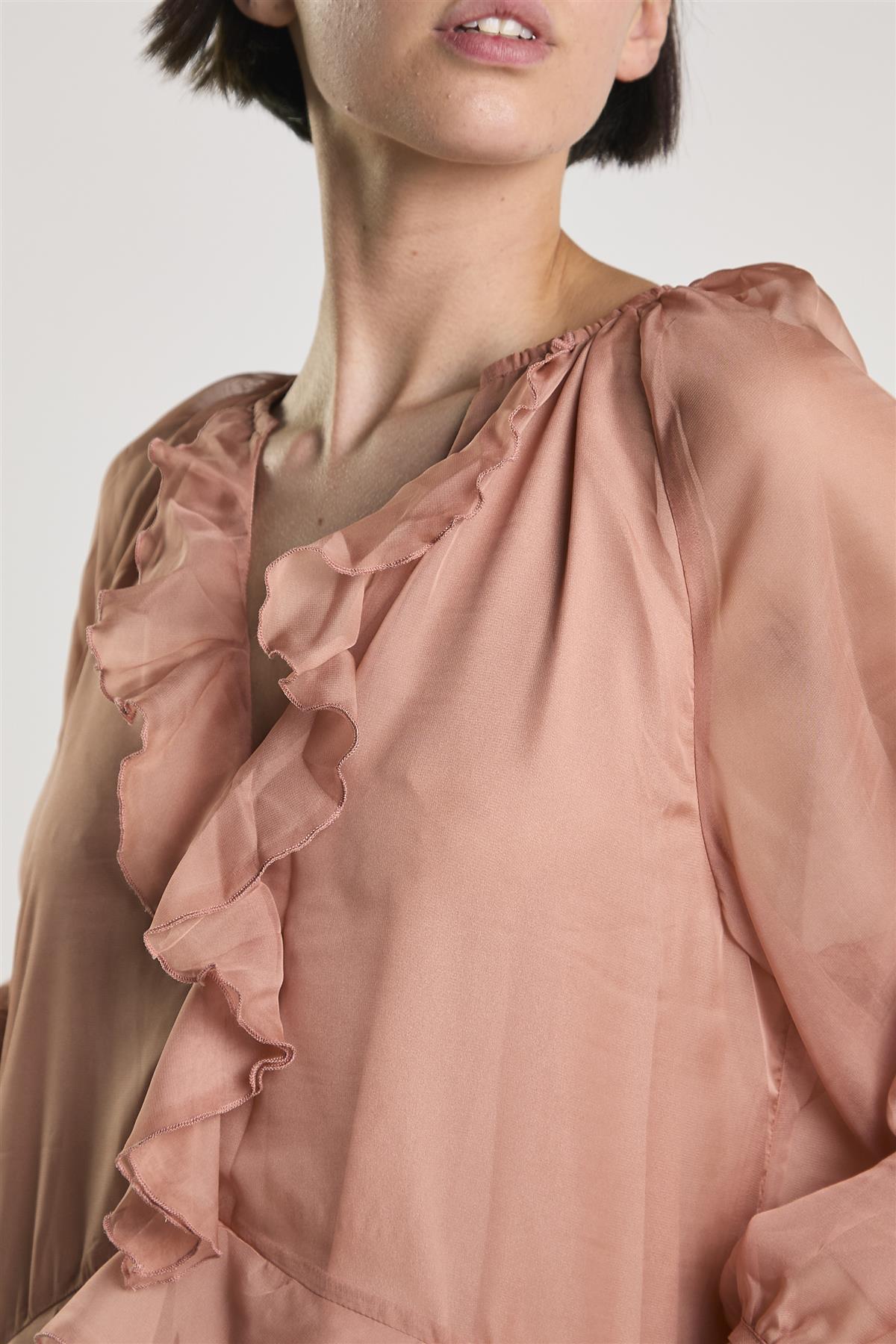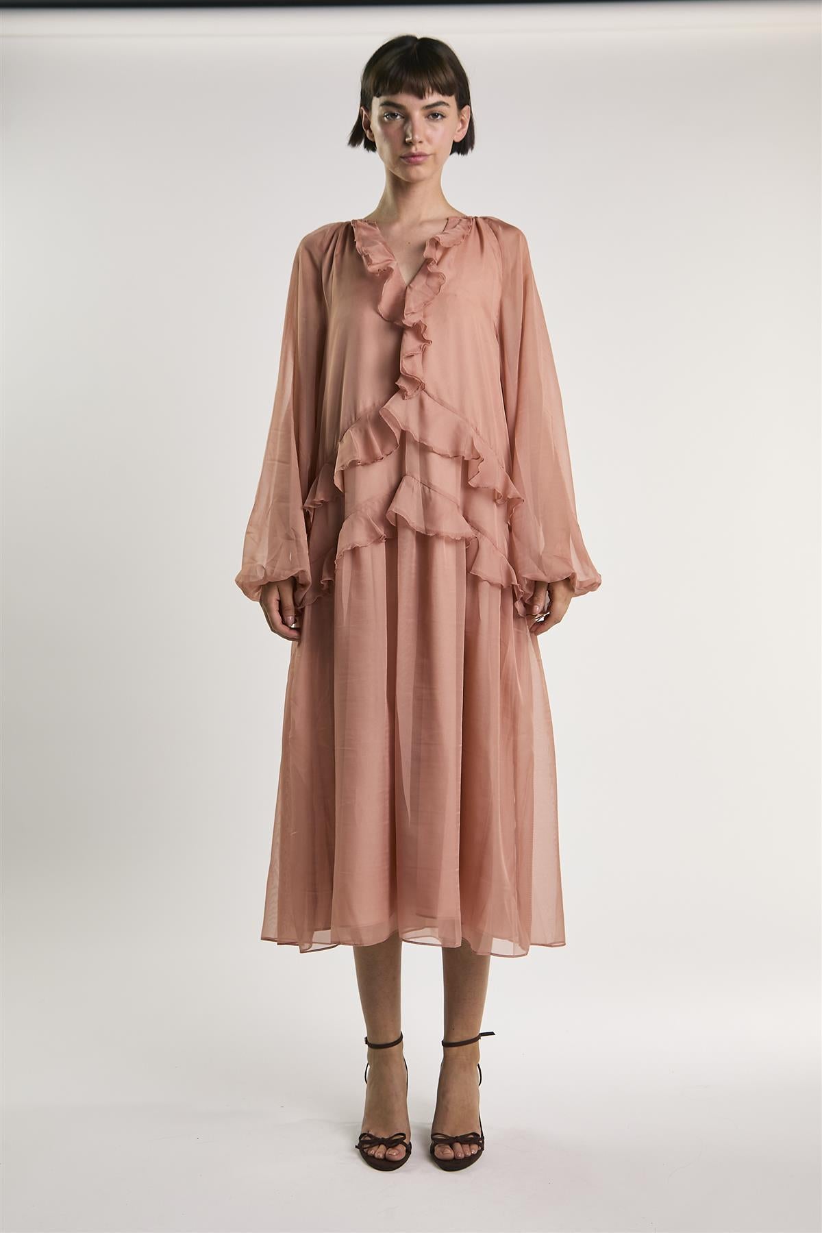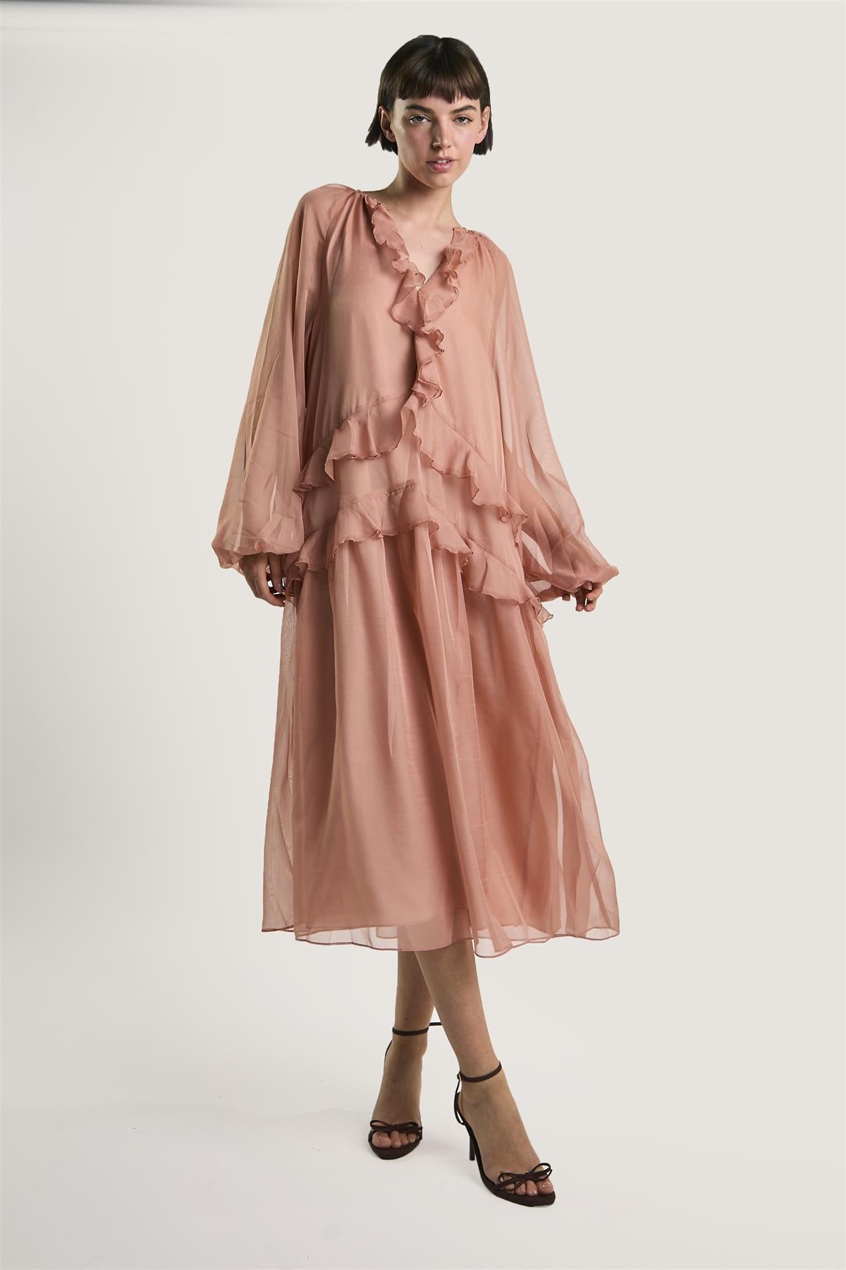 Glamorous Women's Light Copper Boho Midi Dress. Effortless movement and relaxed elegance come together in this boho maxi dress, designed to make every step feel graceful and comfortable. Voluminous long sleeves and a raglan sleeve seam create a soft, flowing shape that moves beautifully, while frills at the neck add delicate, feminine detail. A V-notch neckline frames the collarbone subtly, offering a flattering, relaxed silhouette, and the voluminous skirt enhances the dress’s easy, airy feel. Designed for both comfort and style, it pairs seamlessly with simple sandals or minimal accessories for a look that feels naturally chic and effortlessly confident.