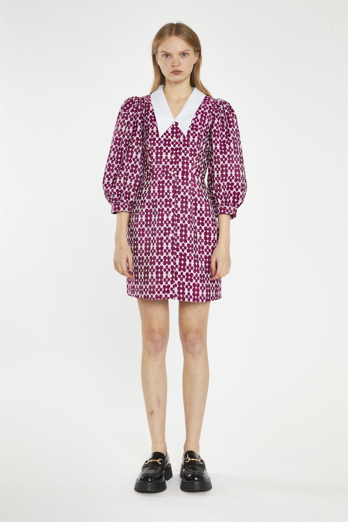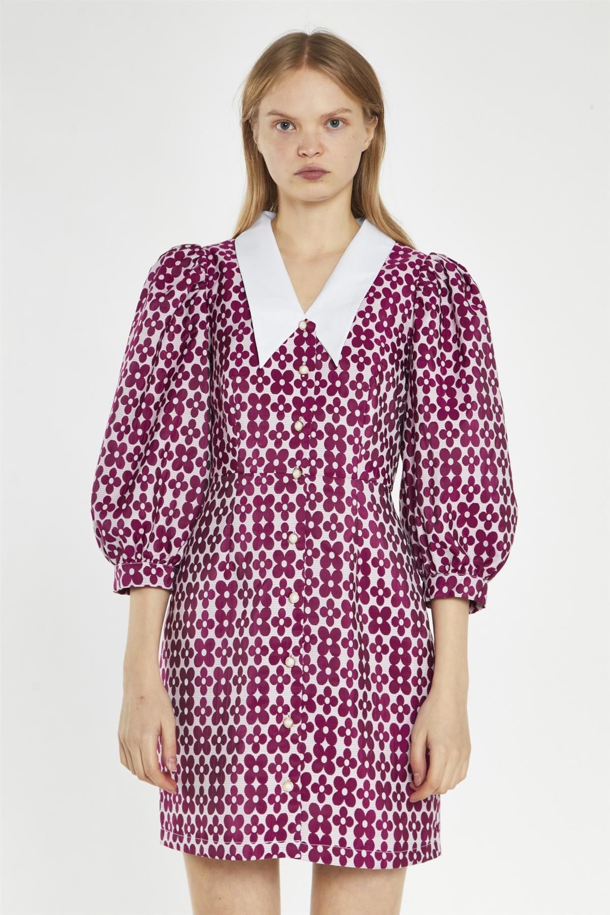 Glamorous Women's Magenta-Flower Brocade Collared Mini-Dress. Embrace your inner fashionista with our Magenta-Flower Brocade Collared Mini-Dress. This eye-catching piece features a contrasting collar, adding a touch of sophistication to the playful mini length. The button-front closure allows you to adjust the fit to your liking, while the large puff sleeves create a dramatic, statement-making silhouette. The brocade fabric adds a luxurious, textured element, while the cinched waist flatters your figure. Pair it with your favourite heels for a night out, or dress it down with sneakers for a more casual vibe. This versatile dress is sure to turn heads and make you feel confident and fabulous.